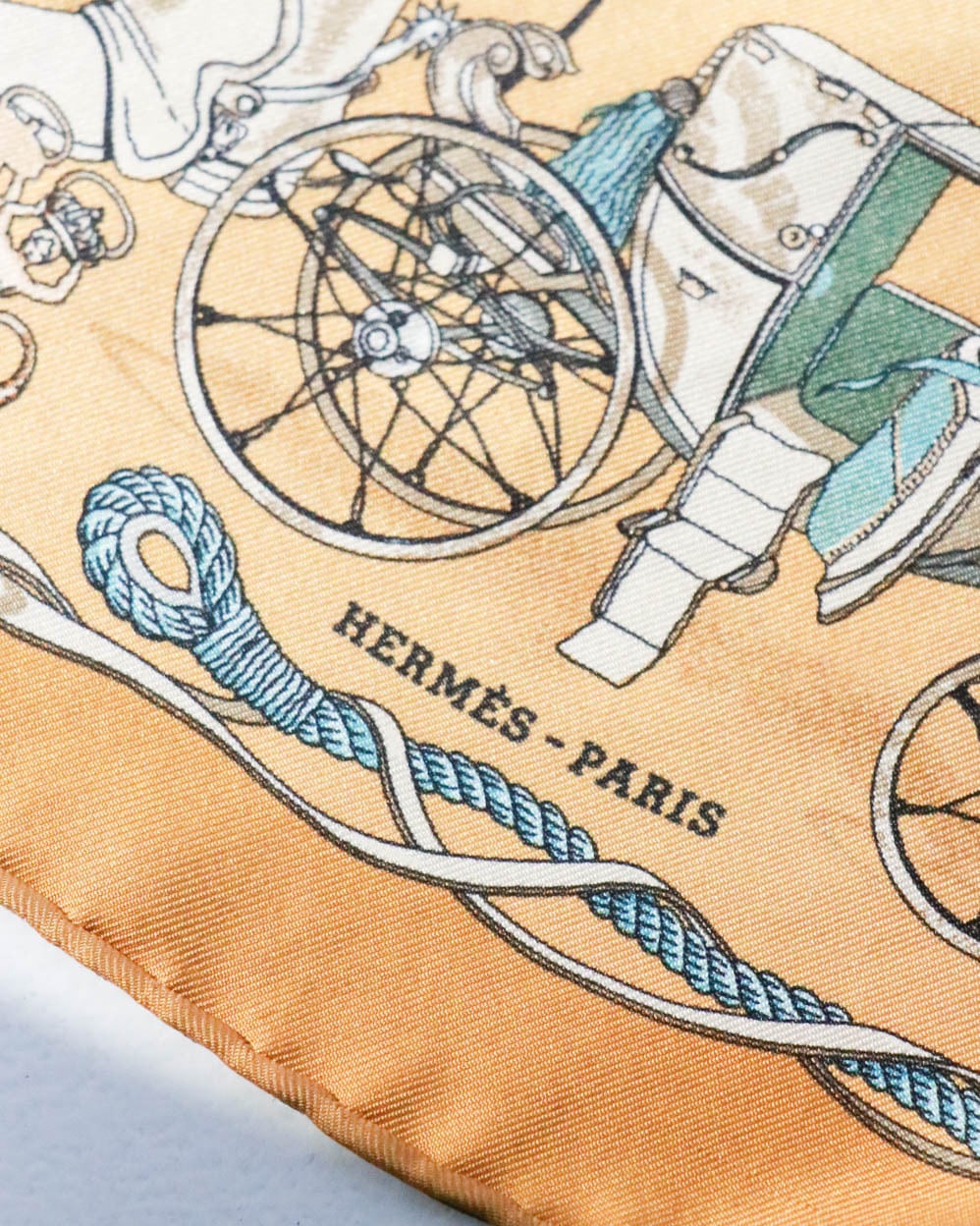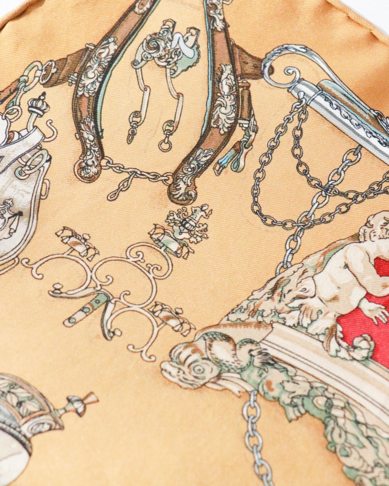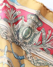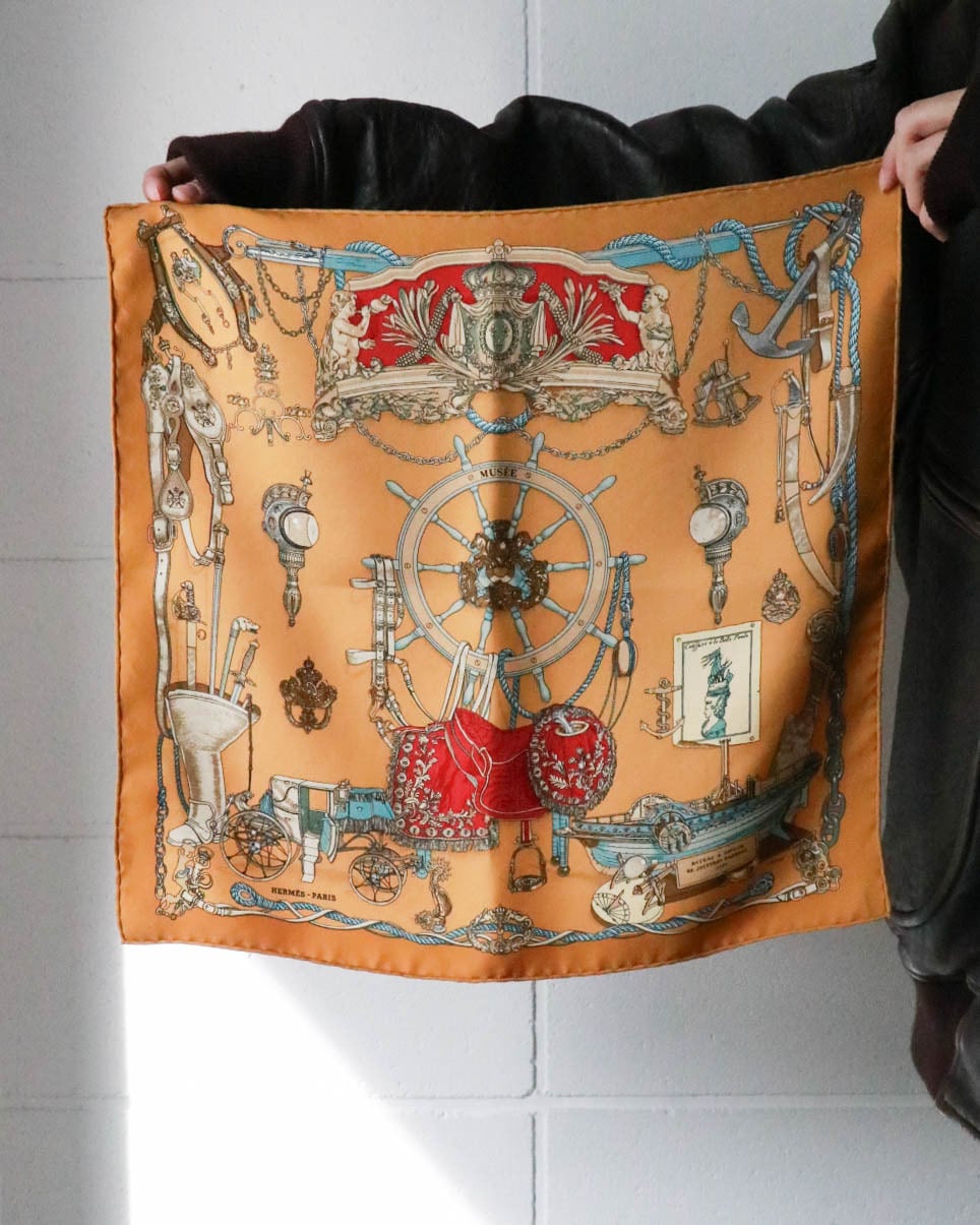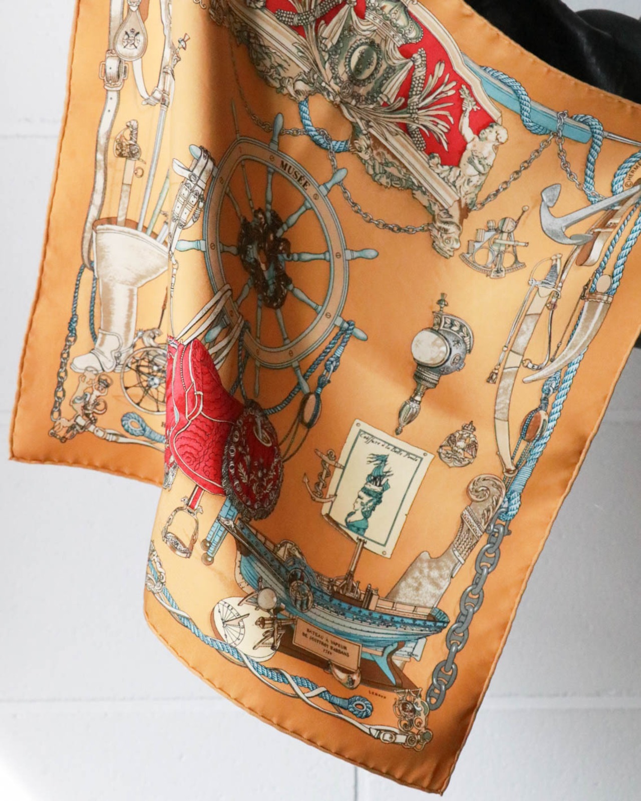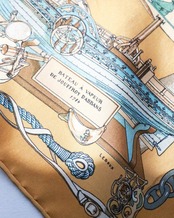 エルメスのミニスカーフが入荷。鮮やかな色彩で表現された、18世紀フランスの発明家「ジュフロワ・ダバン」が開発した初期蒸気船がテーマになったデザインで、エルメスの代表的デザイナーフィリップ・ルドゥによる作品。