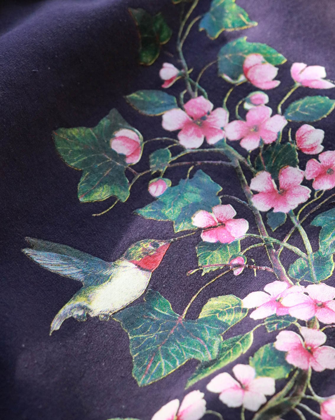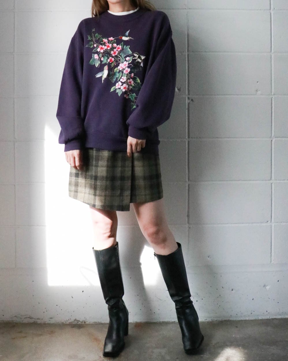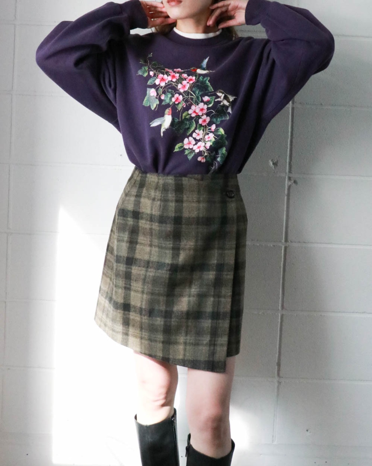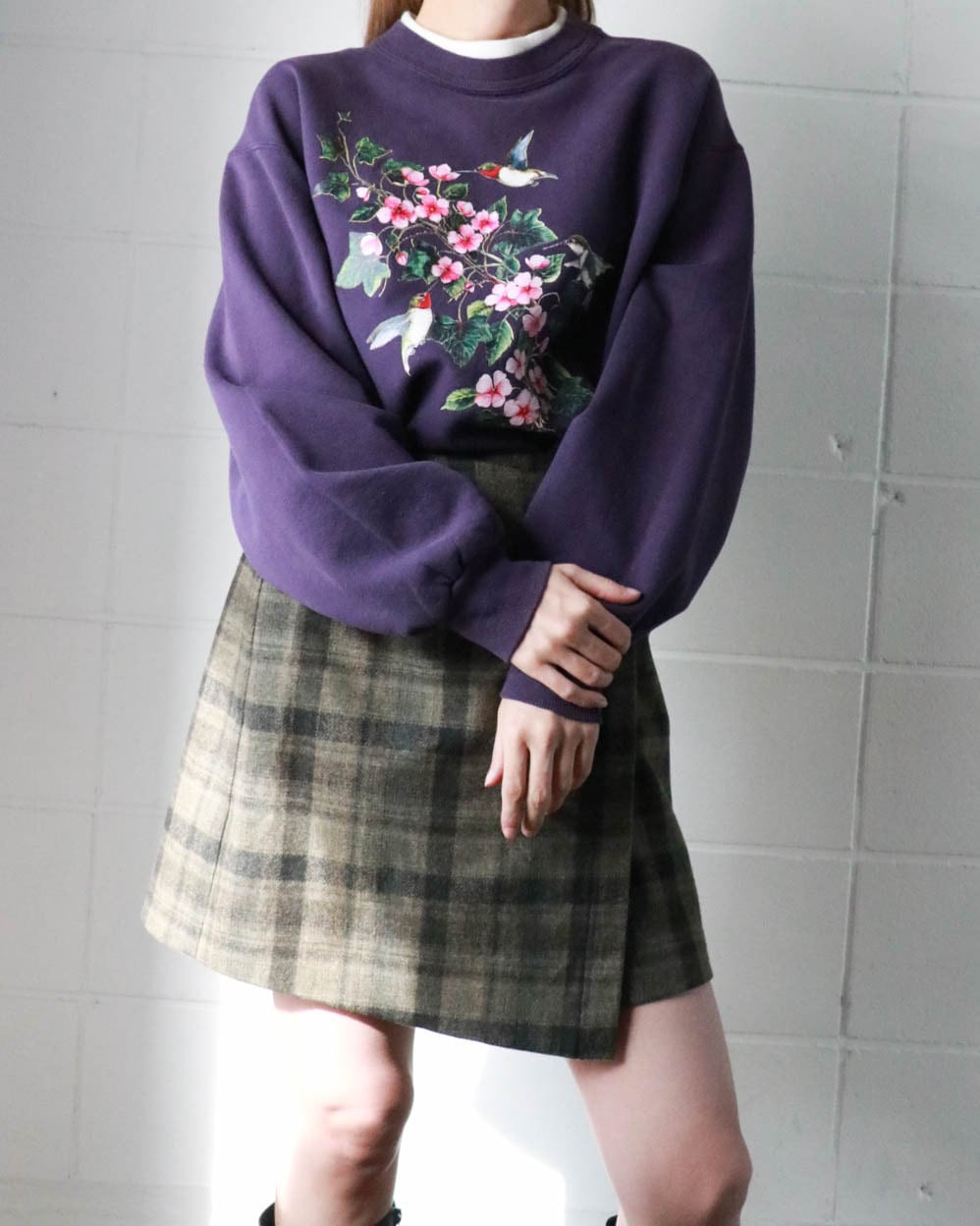お花と鳥モチーフのパープルスエットが入荷。首元はレイヤーデザインのモックネックに、ゆったりとしたボディー。写真のようにお好みのボトムズに合わせて、今の季節は羽織りの中で柄をチラッと見せて冬ファッションをお楽しみください。