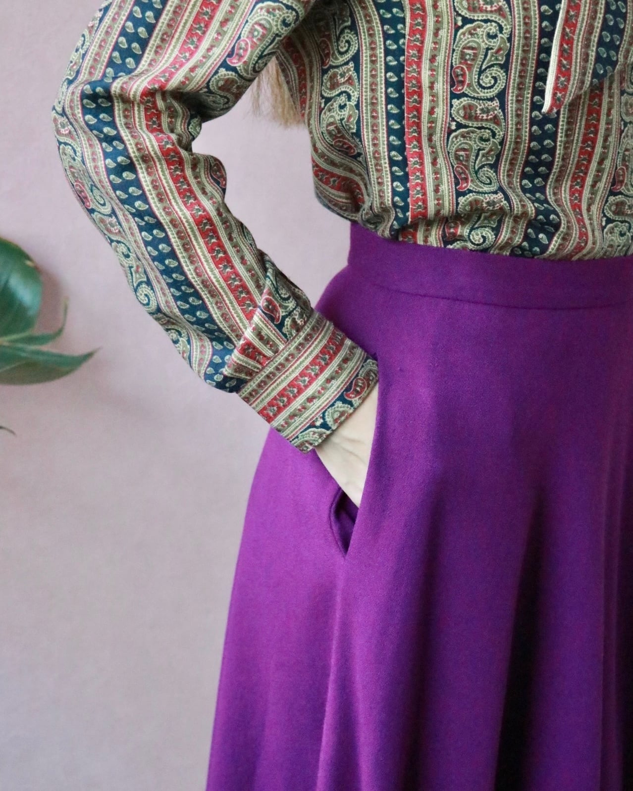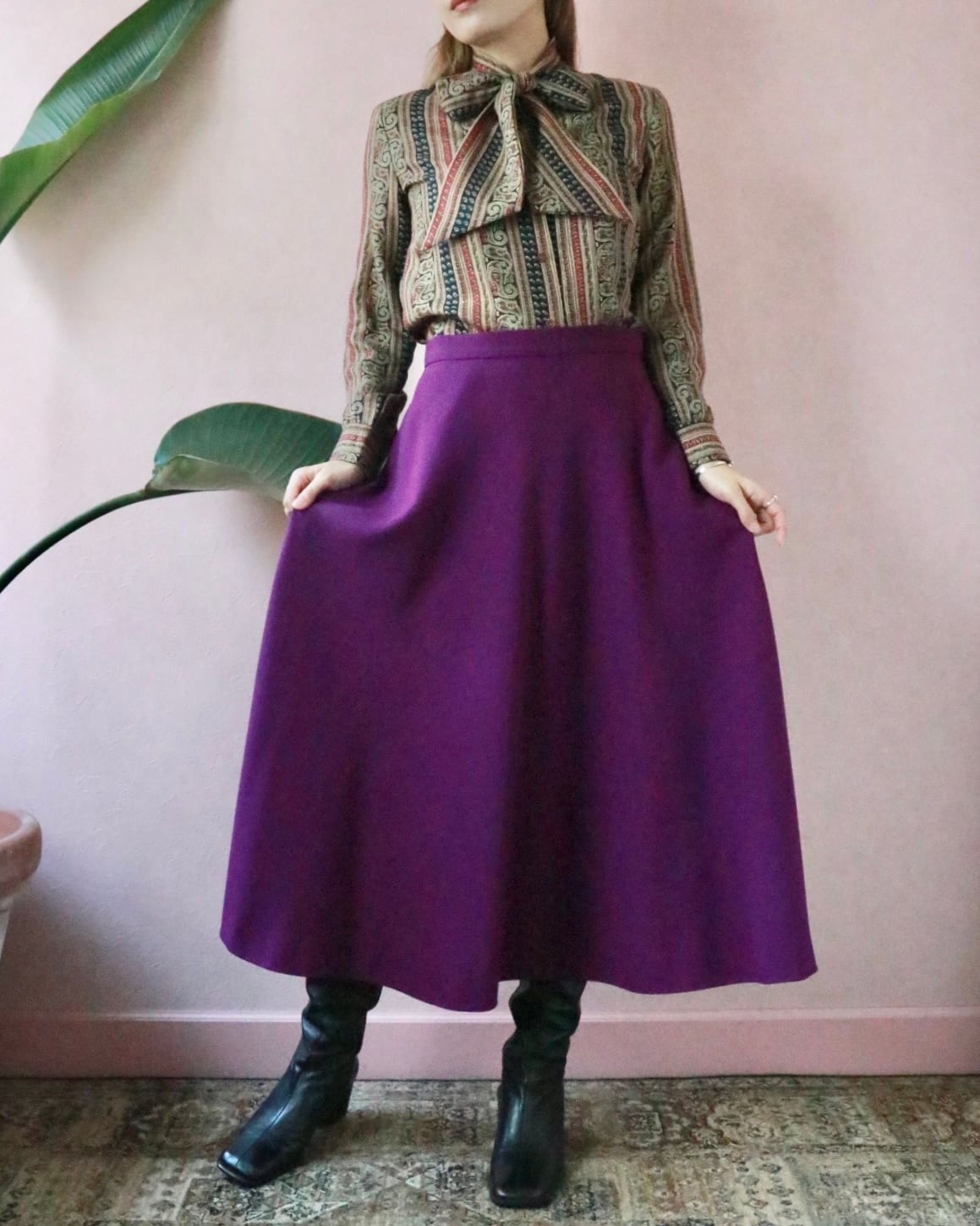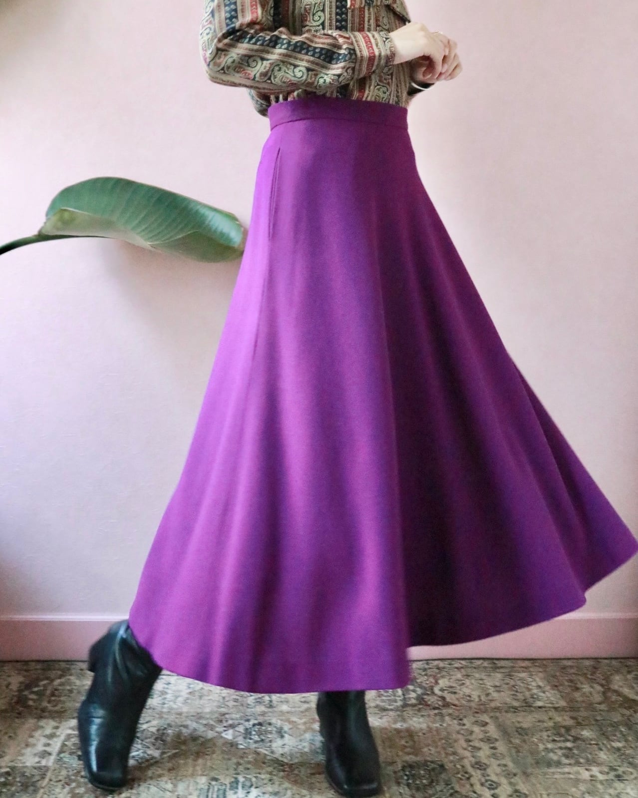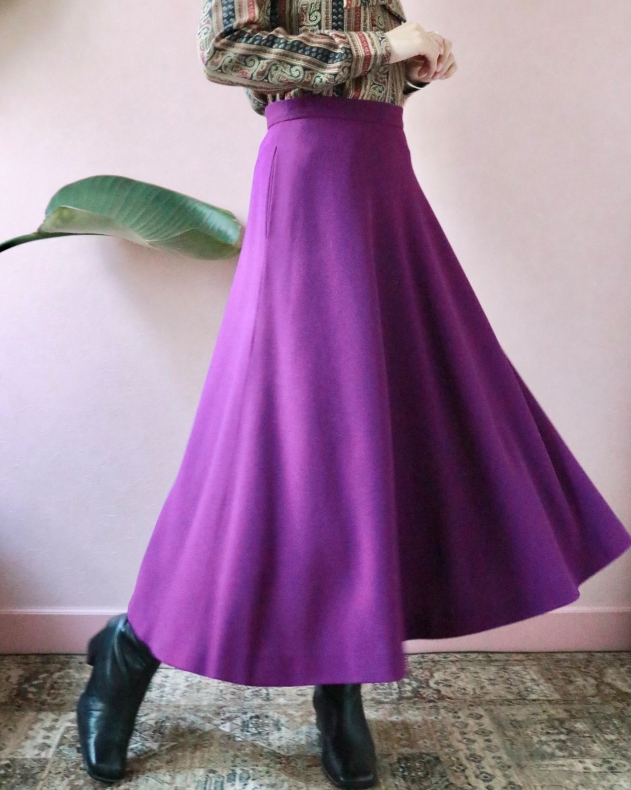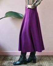 ボリューム感があり、歩くたびに揺れる動きがとっても綺麗。気分が高まるパープルカラー。ゆるっとしたシルエットのトップスと合わせてカジュアルにしたり、写真のようにフィット感のあるブラウスなどをインしてジャケットやコートにあわせて綺麗めで着るのもおすすめです。