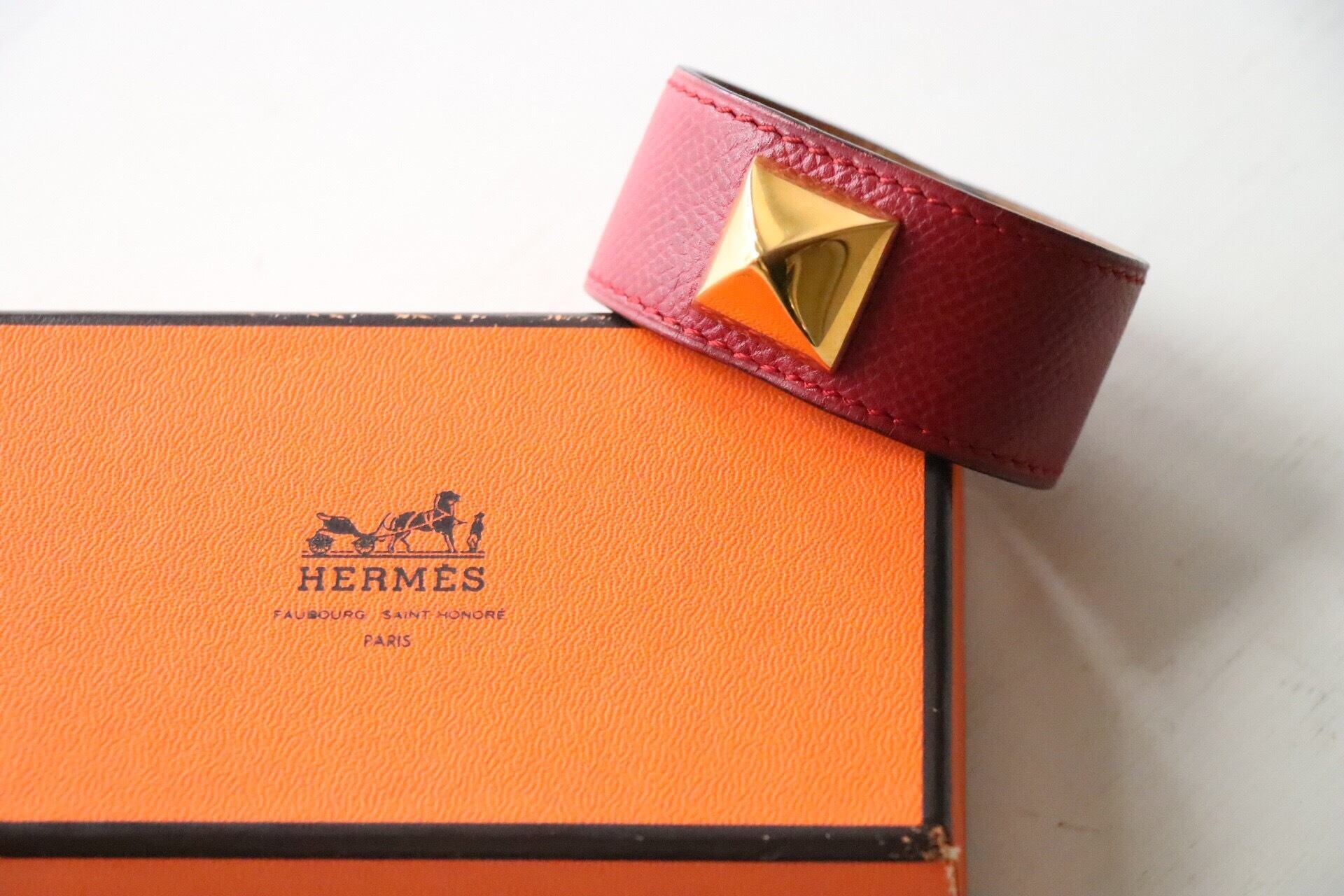 レッドレザーにゴールドのピラミッド型スタッズが施され、大胆なデザインながらもエルメスらしいエレガンスさを感じます