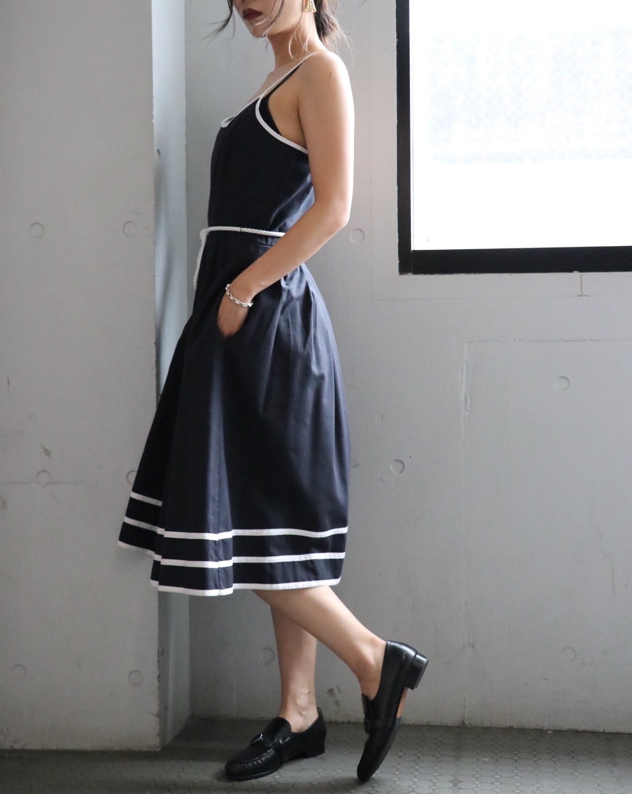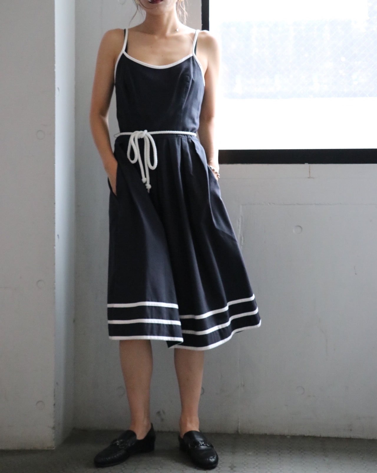 1980年代キャミソールワンピースです。デコルテから胸元を美しく演出するネックラインにふわりと広がるスカート。セクシーになりすぎないのは、ネイビー×ホワイトの大人の色味だからこそ。コットン素材で着心地よく、オールシーズン着用できます。これからの季節、ジャケットやデニムと合わせてギャップあるコーディネートを楽しんでみてはいかがでしょうか。