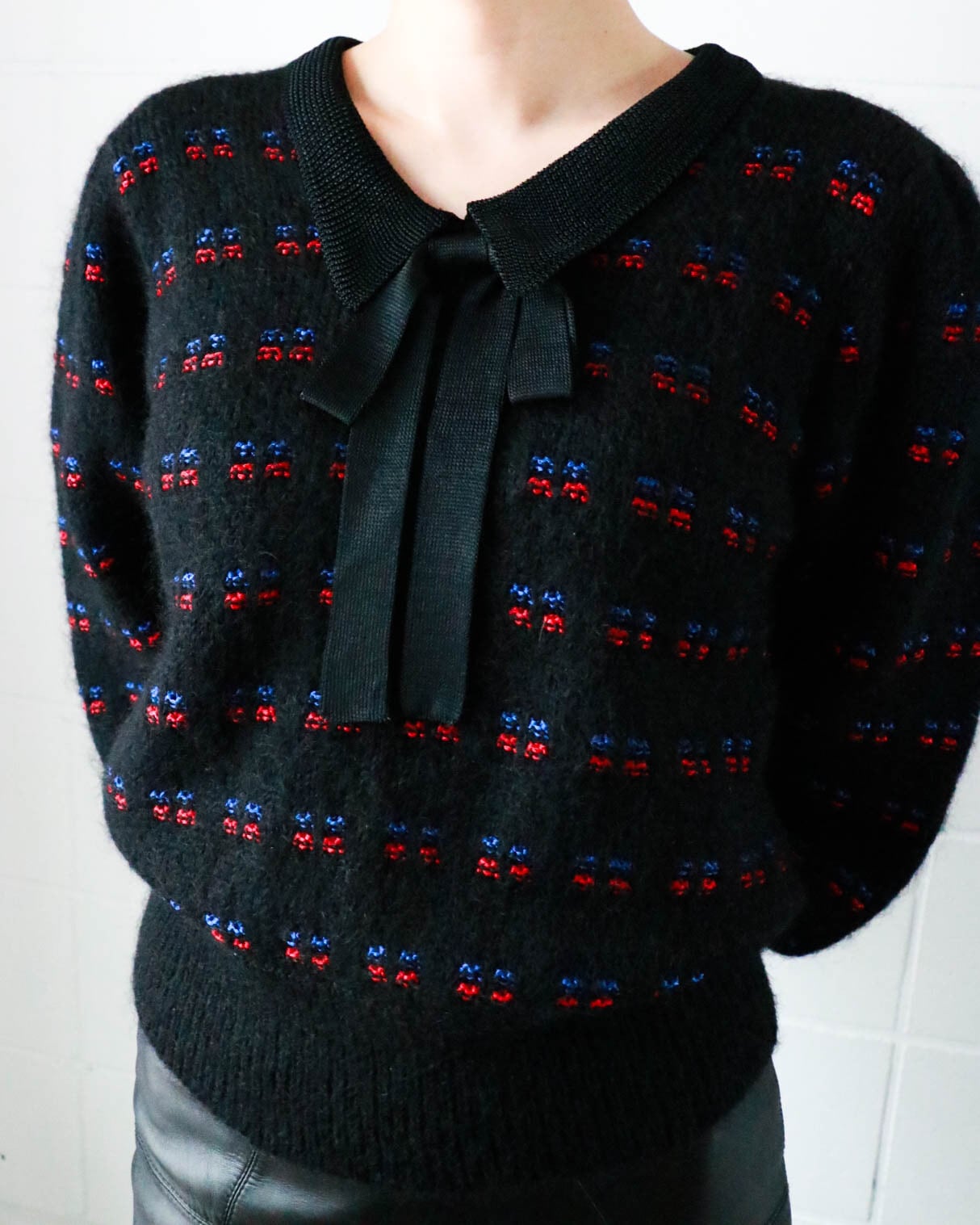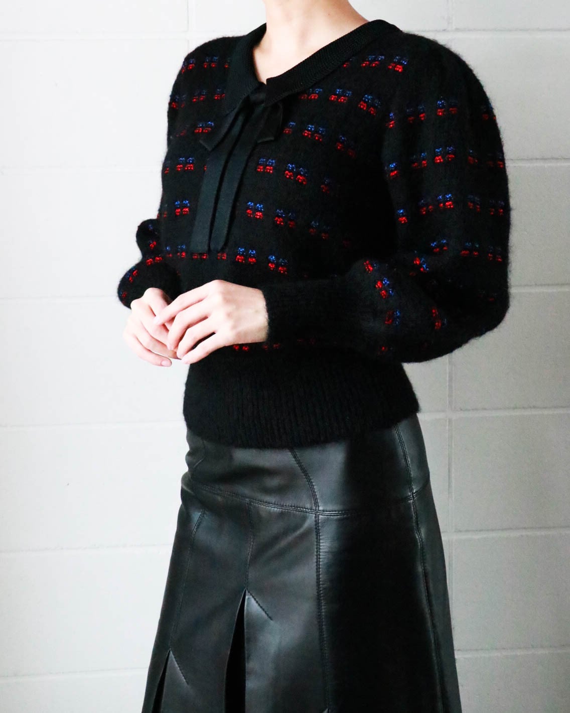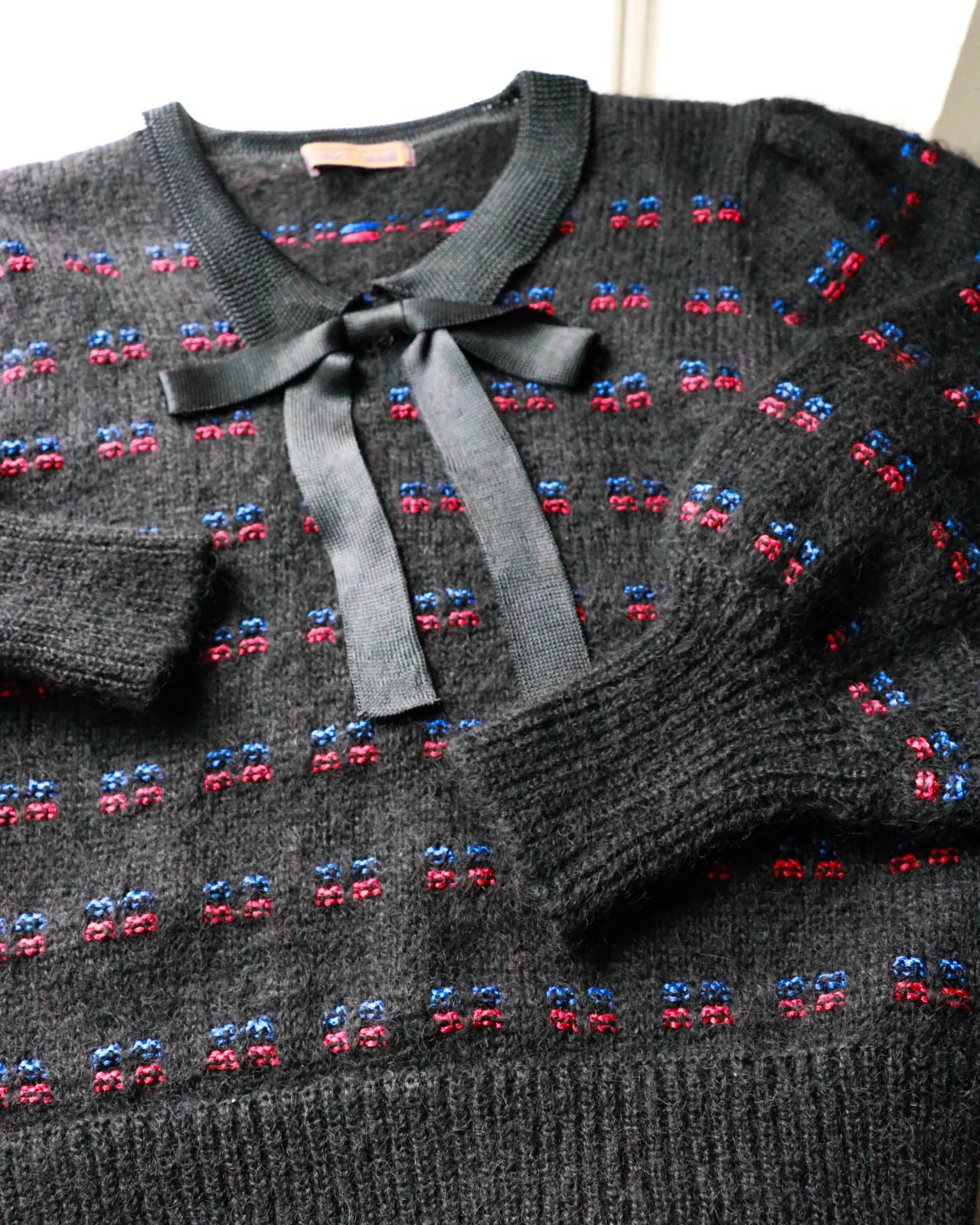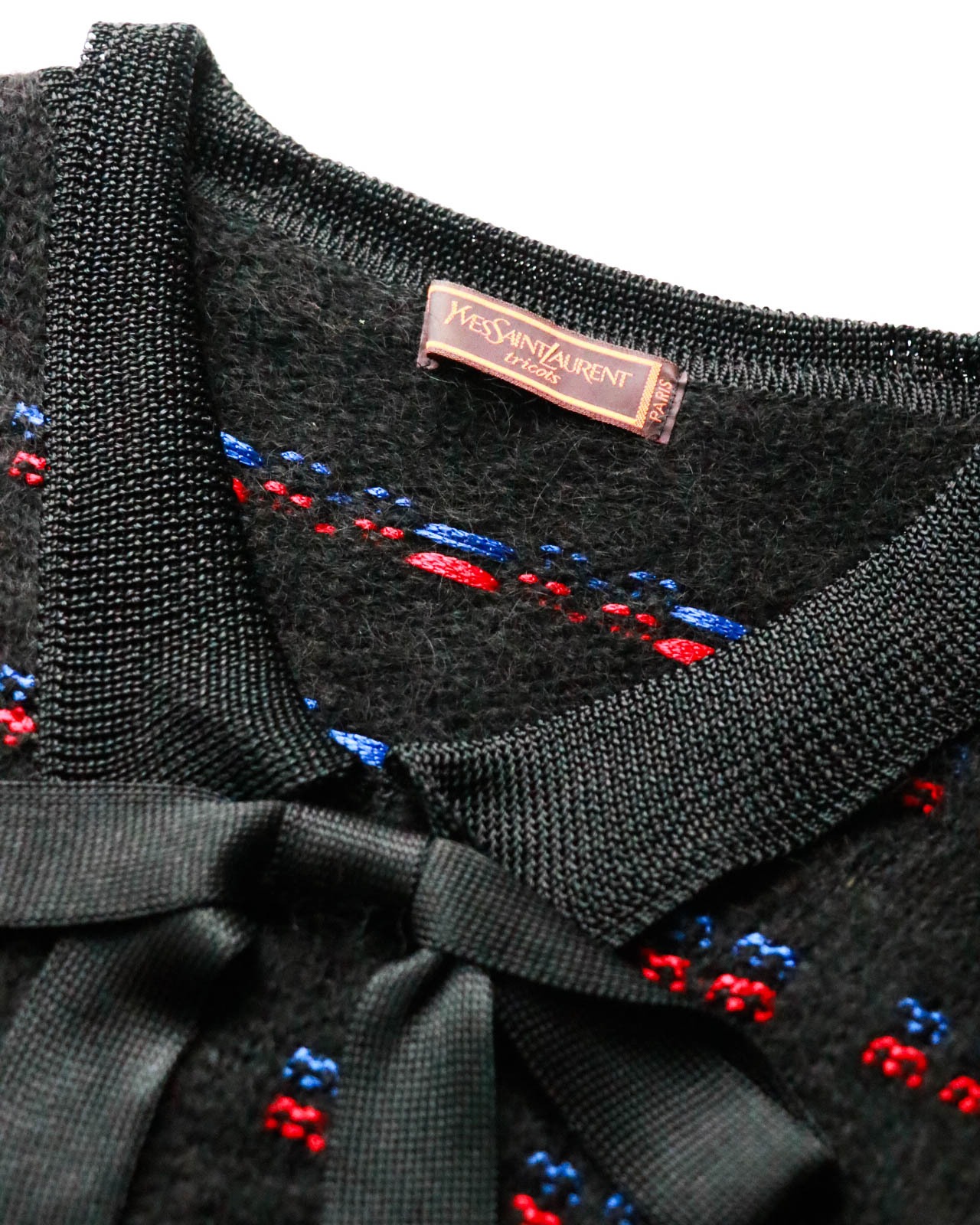 クラシカルな魅力が詰まったYves Saint Laurentのニットが入荷。ブラックニットに映えるレッドとブルーの編み模様が静かな存在感を放ちます。