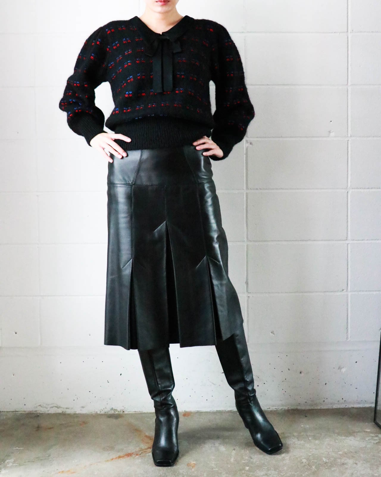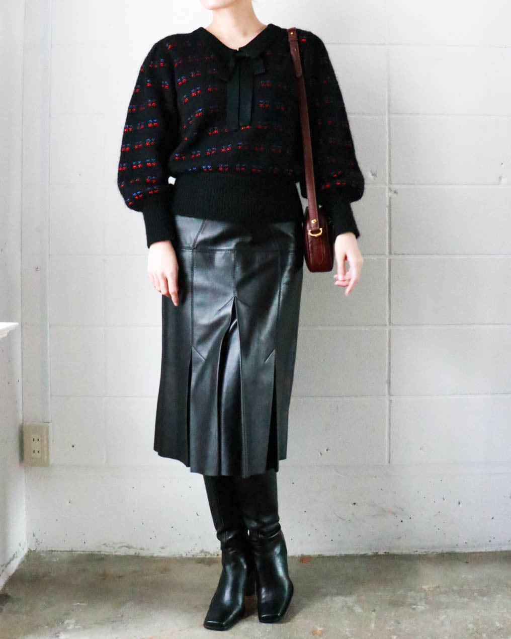 首元のリボンティールはクラシカルなムードの中にフェミニンなアクセントをプラス。甘さを抑えたデザインのため、パンツスタイルやレザーアイテムとも好印象です。