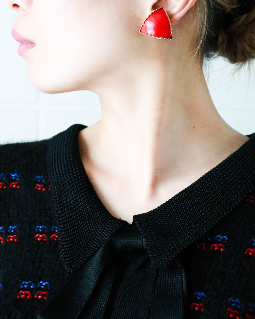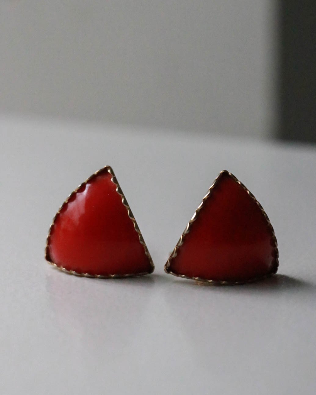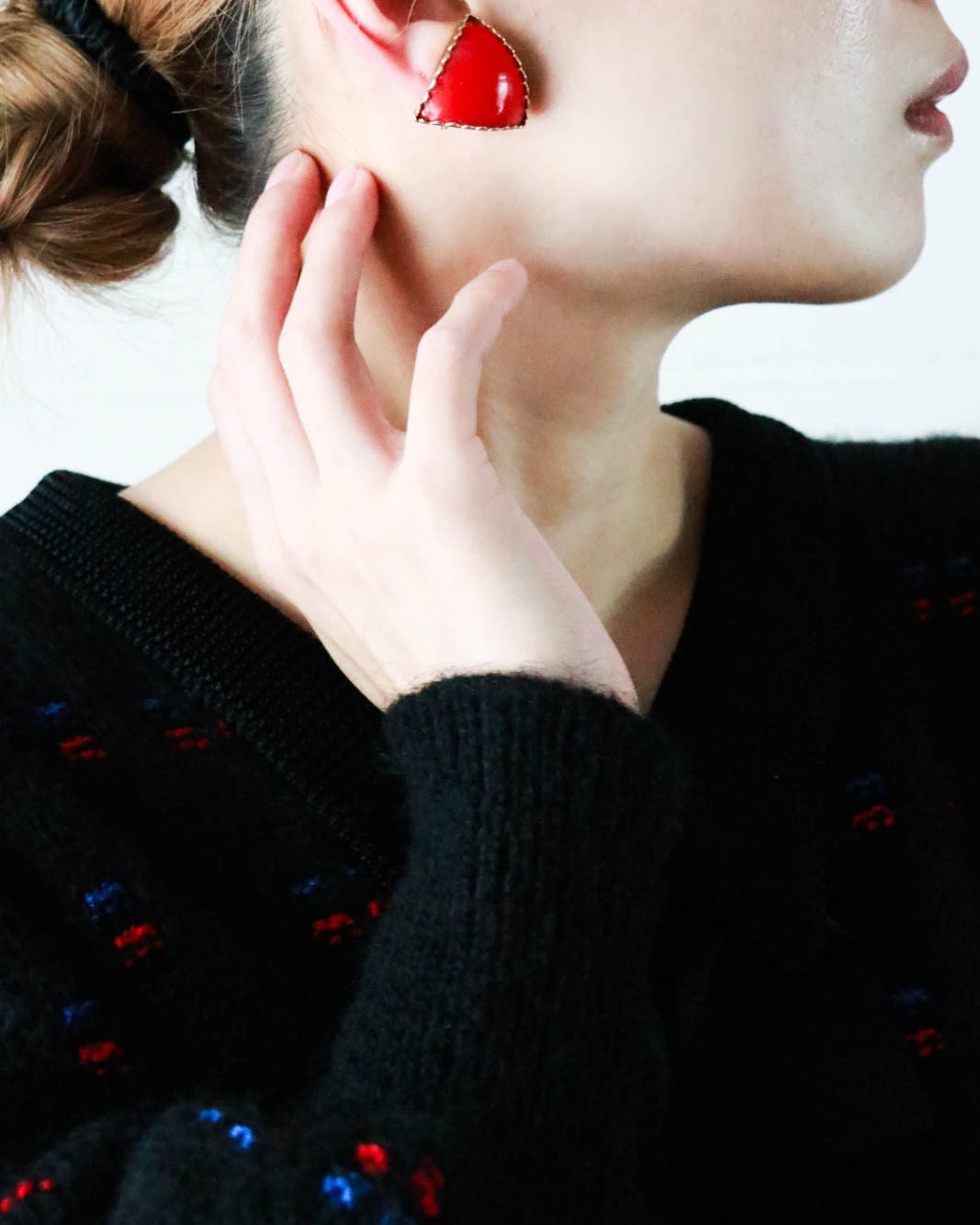 深みのあるレッドが印象的な、トライアングルモチーフのイヤリング。艶ややかな表情と繊細な縁取りが耳元に凛とした存在感を与えます。スタイリングのアクセントになるデザインでシンプルなニットやドレススタイルに合わせるだけで洗練されたムードを演出してくれます。