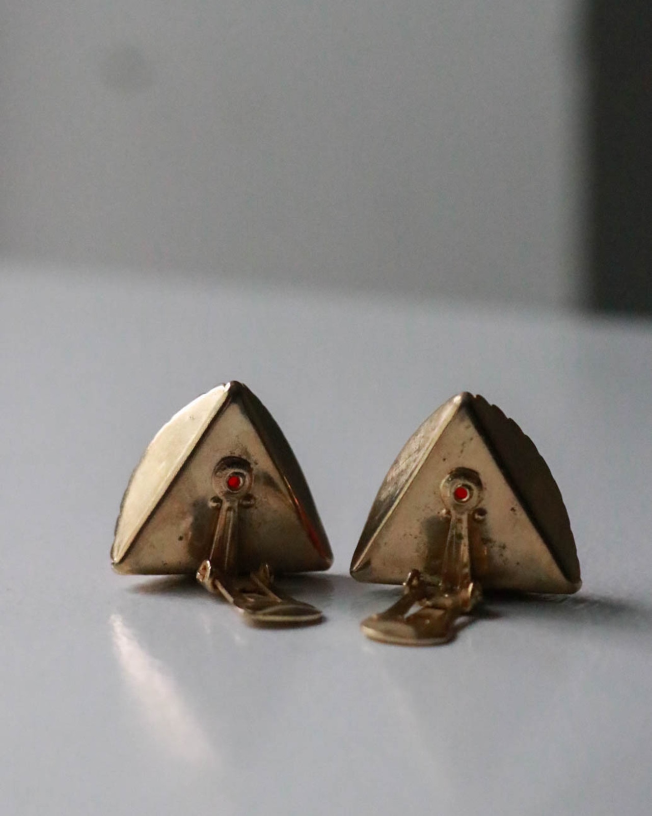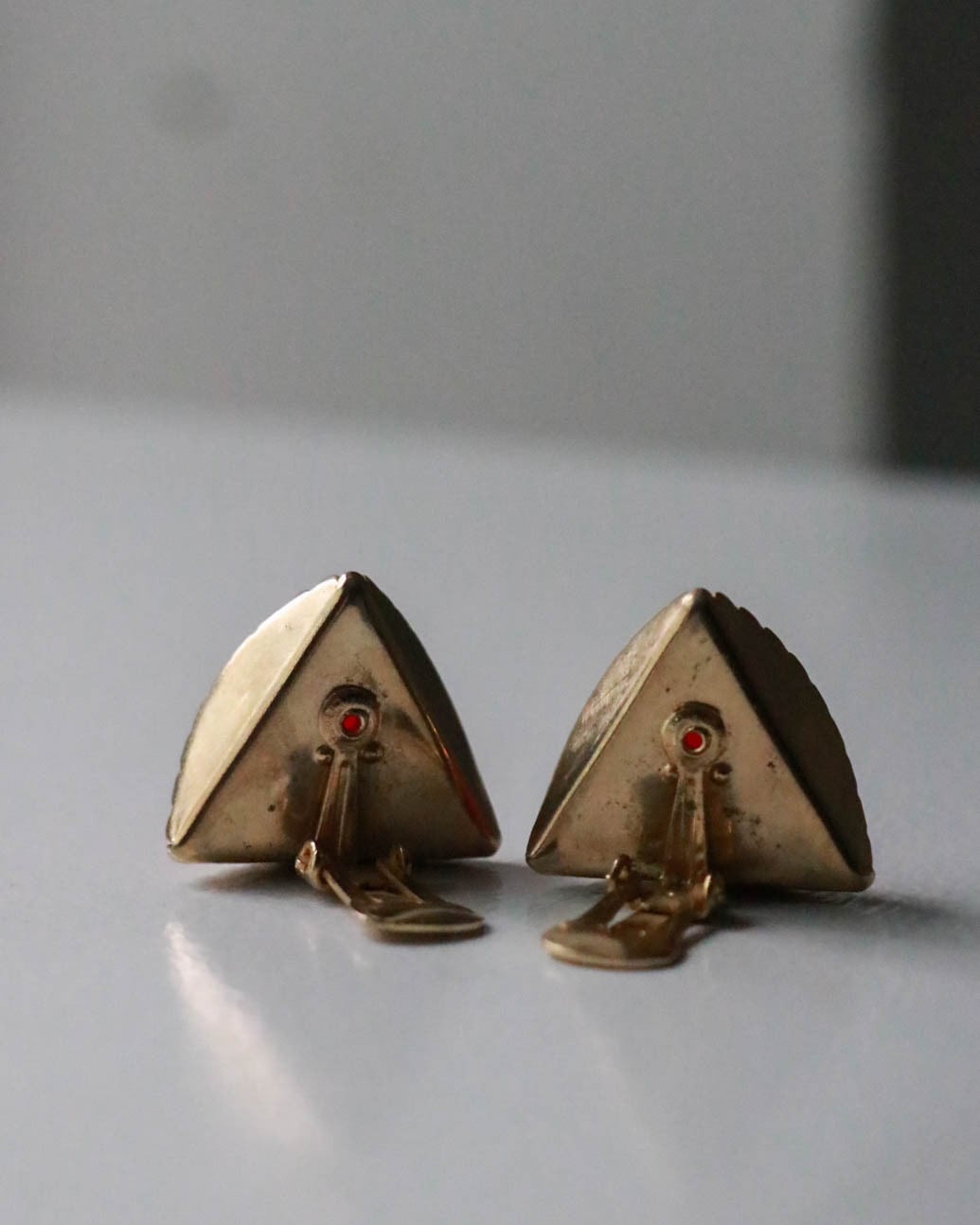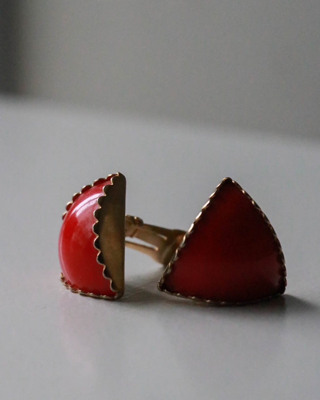 深みのあるレッドが印象的な、トライアングルモチーフのイヤリング。艶ややかな表情と繊細な縁取りが耳元に凛とした存在感を与えます。スタイリングのアクセントになるデザインでシンプルなニットやドレススタイルに合わせるだけで洗練されたムードを演出してくれます。