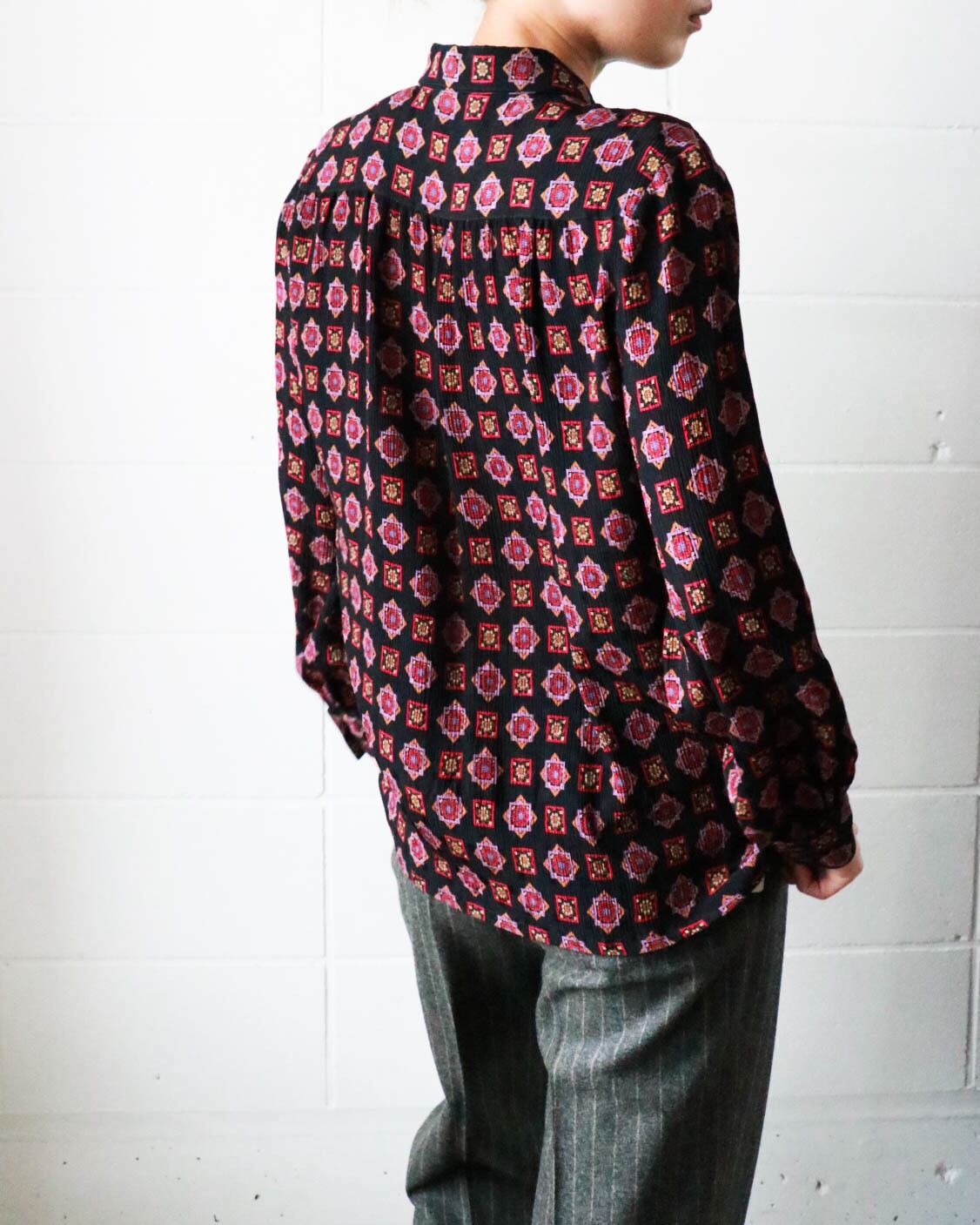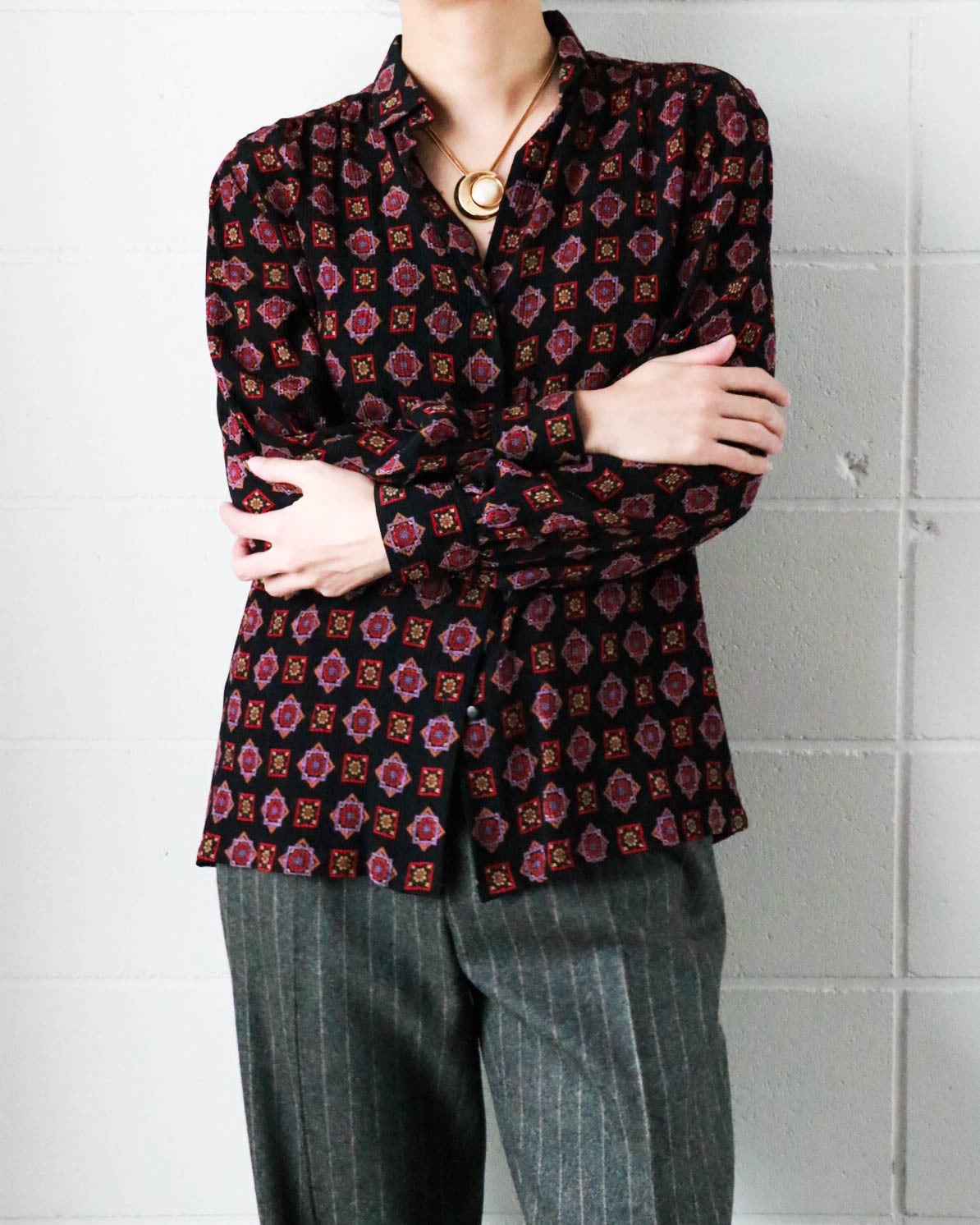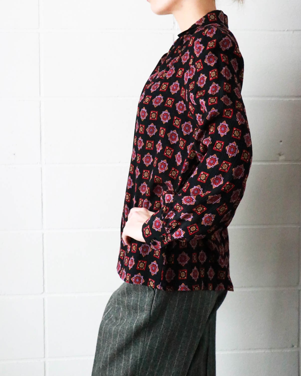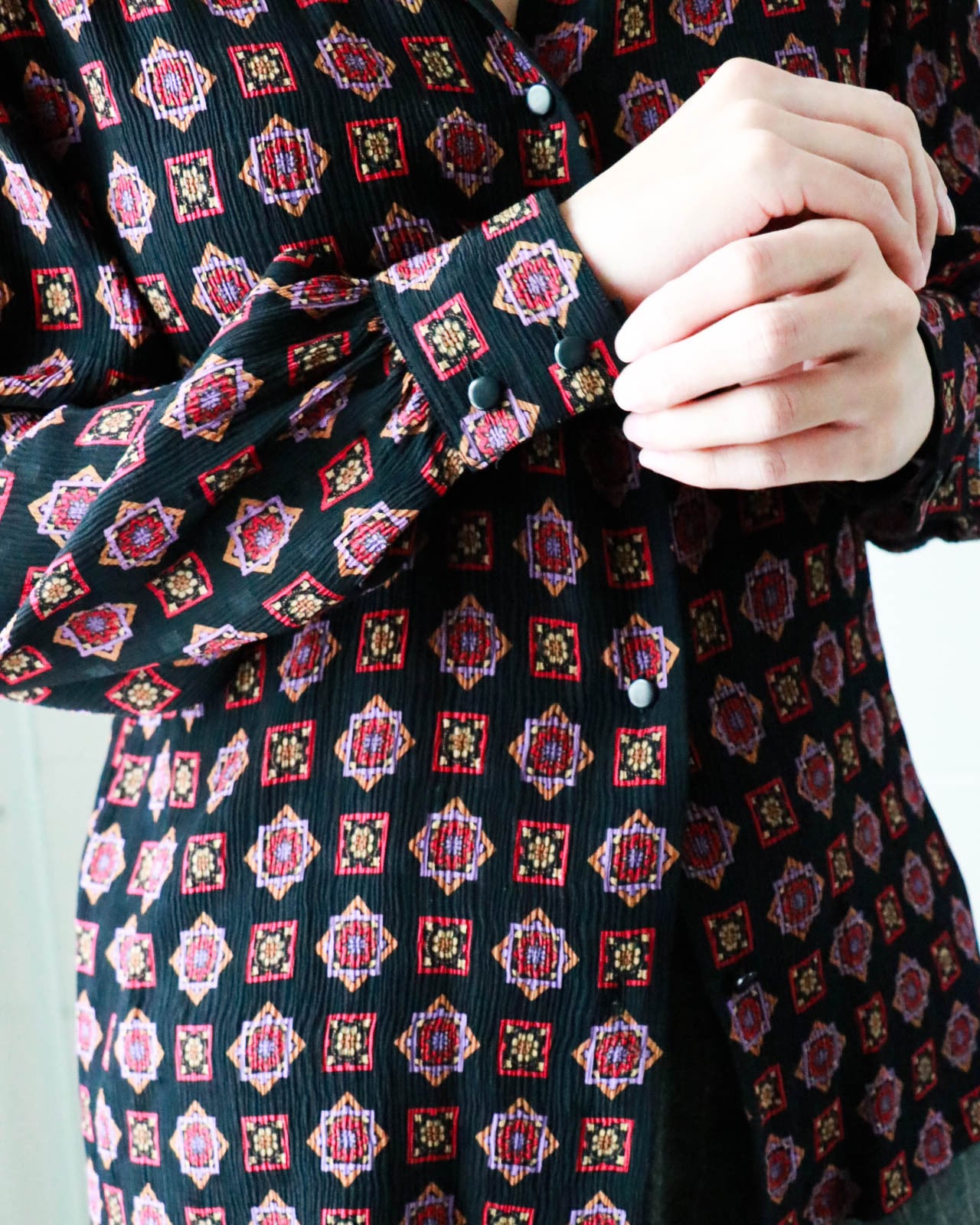 ブラックベースに映えるボルドー×レッドの幾何学柄が印象的な、