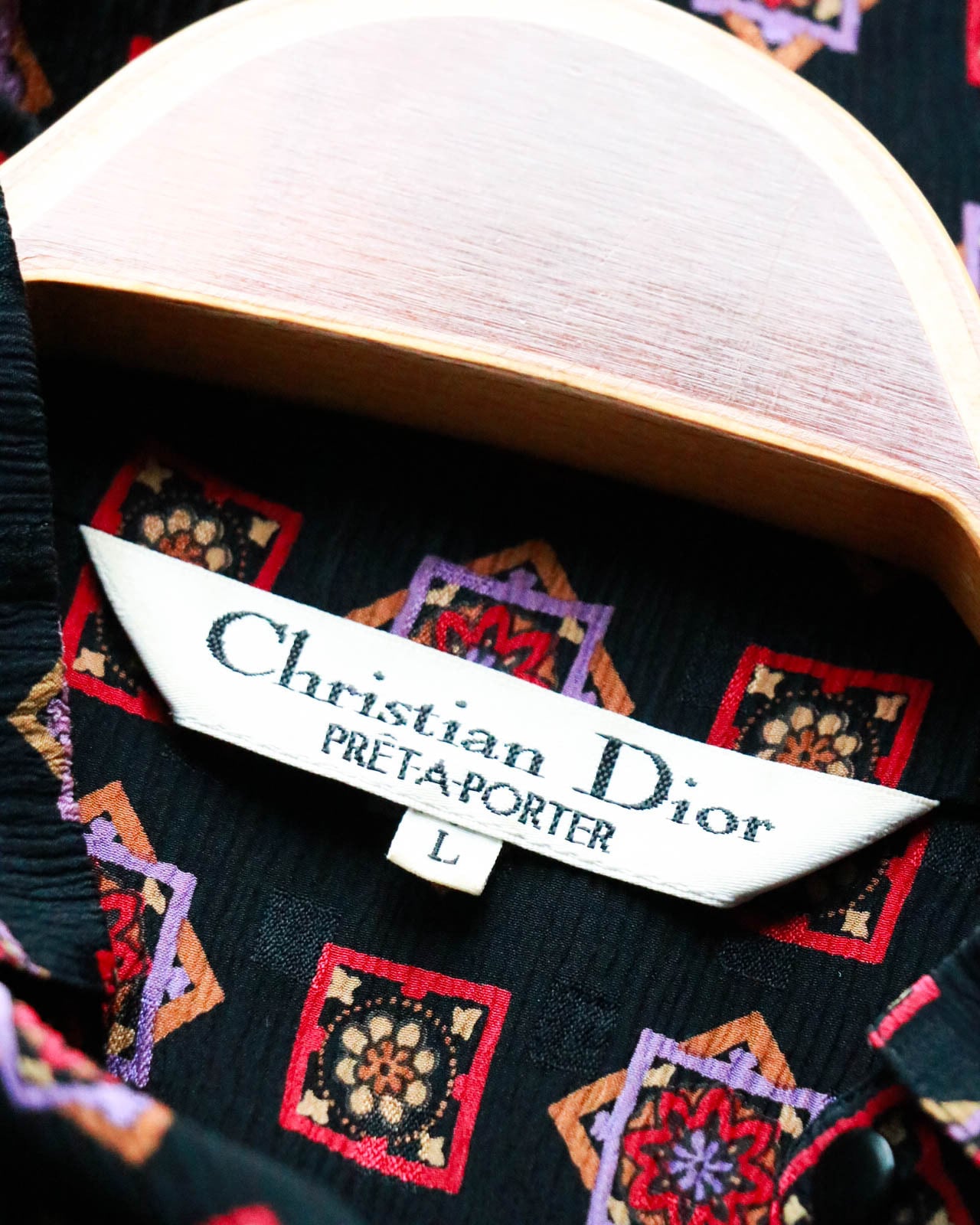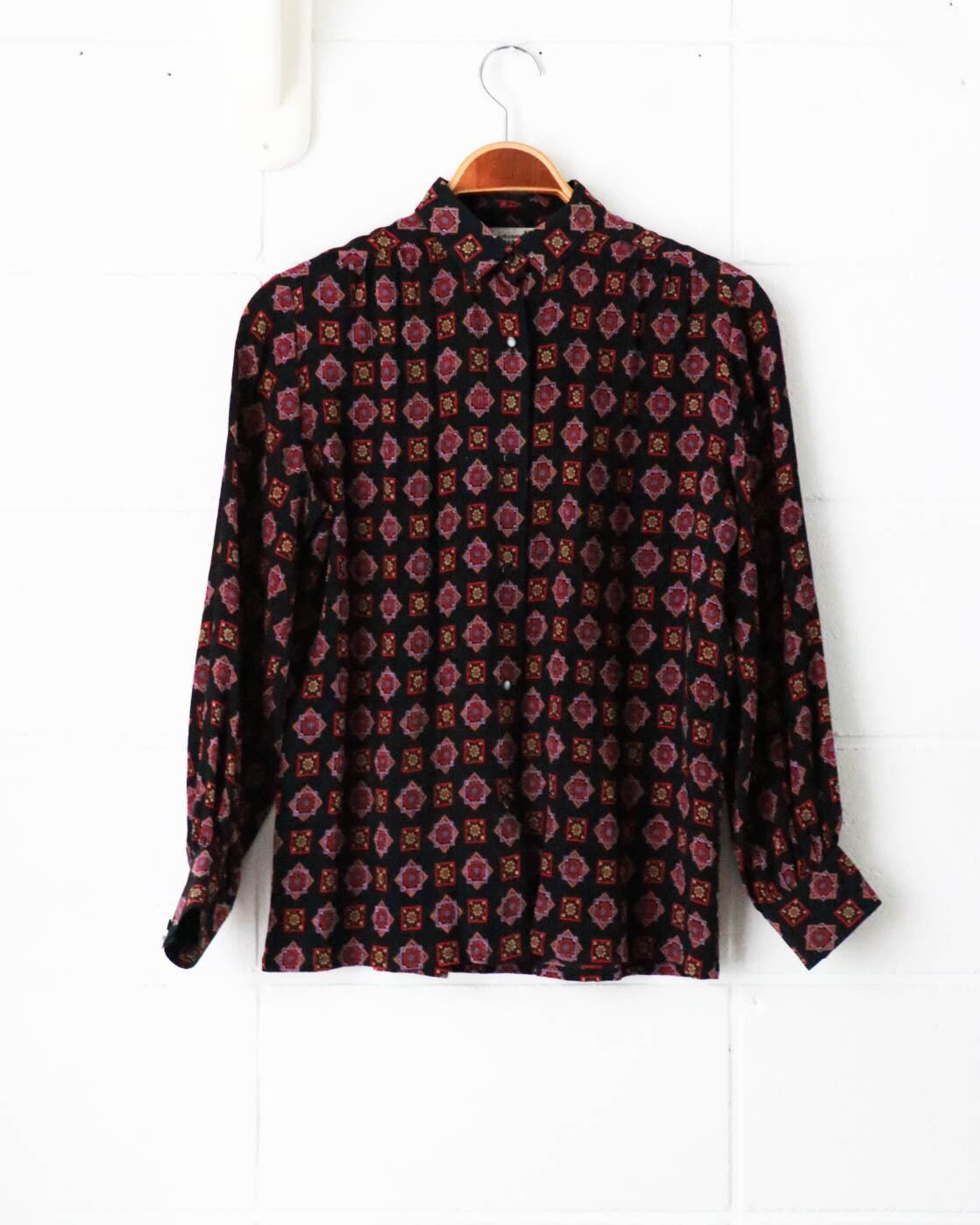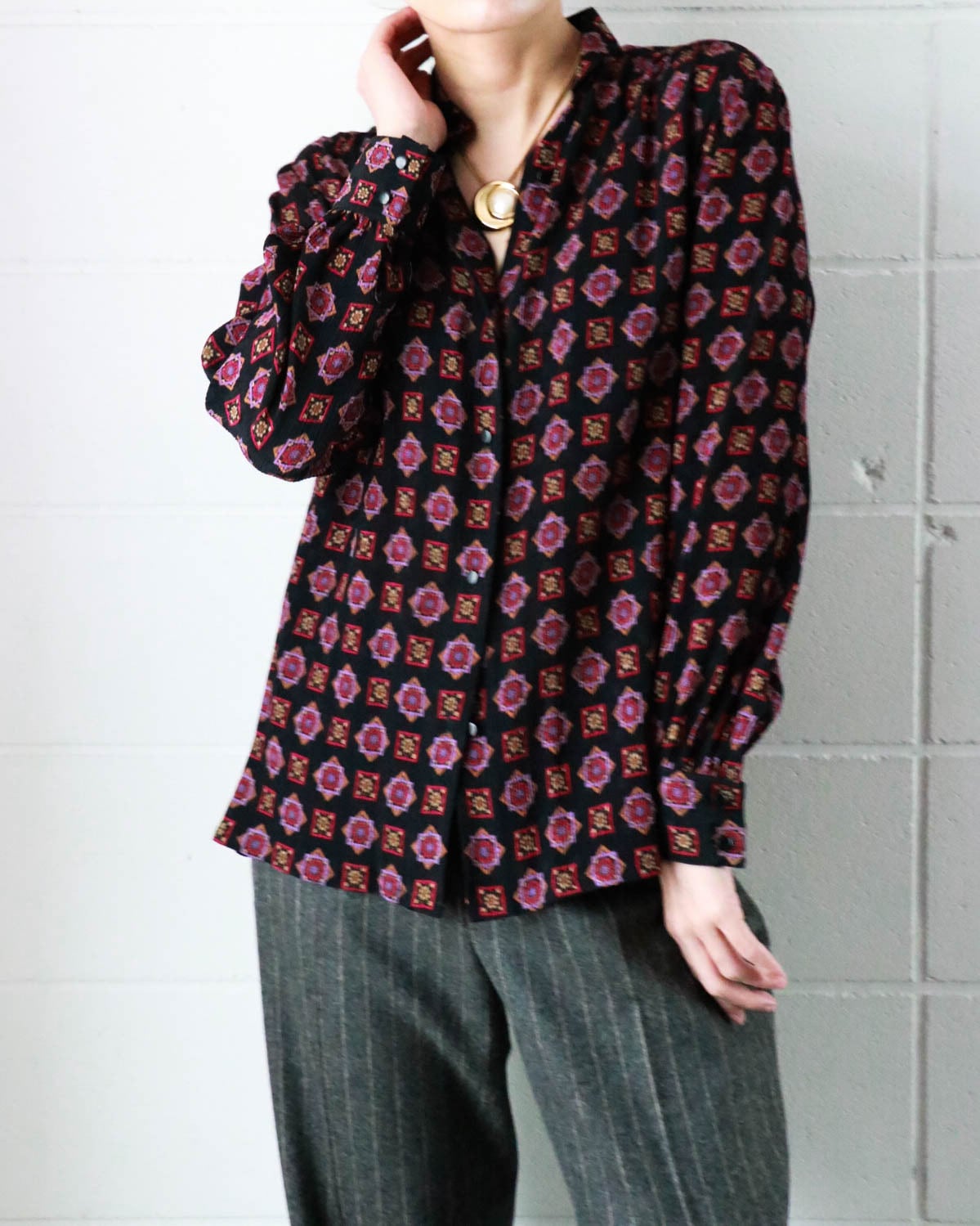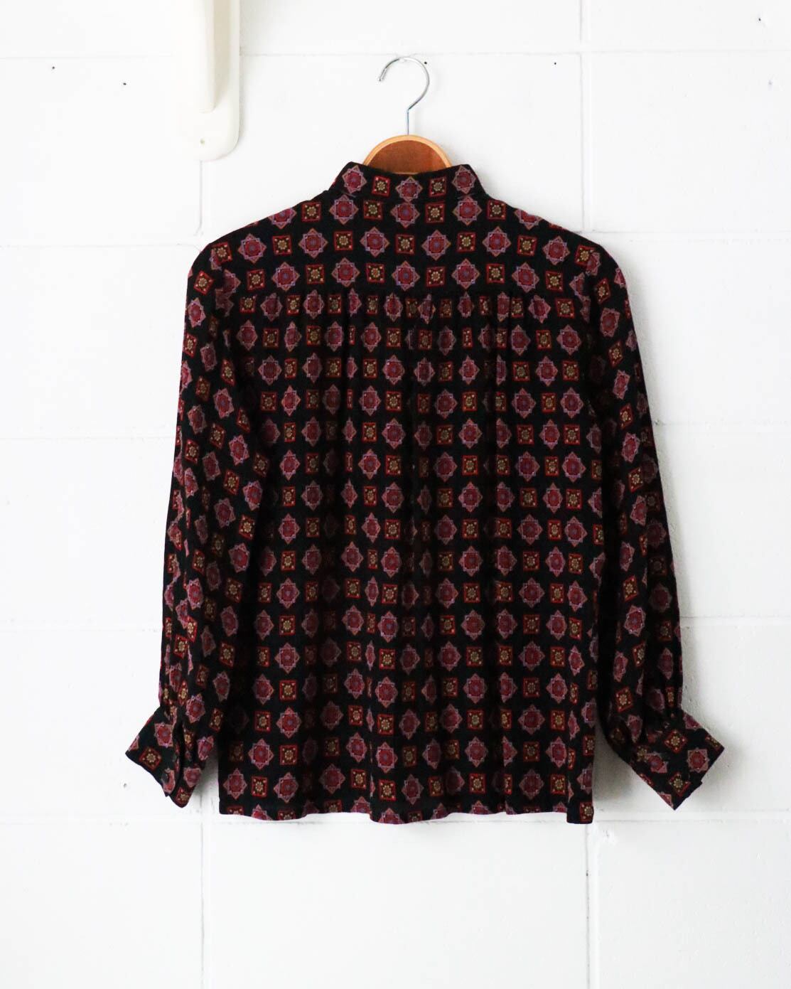 ブラックベースに映えるボルドー×レッドの幾何学柄が印象的な、
