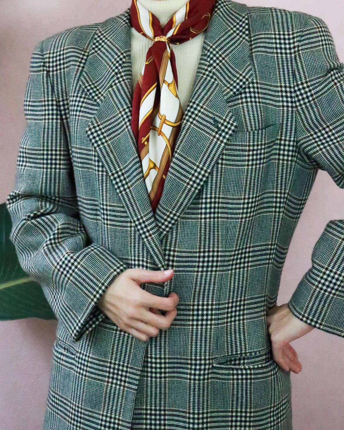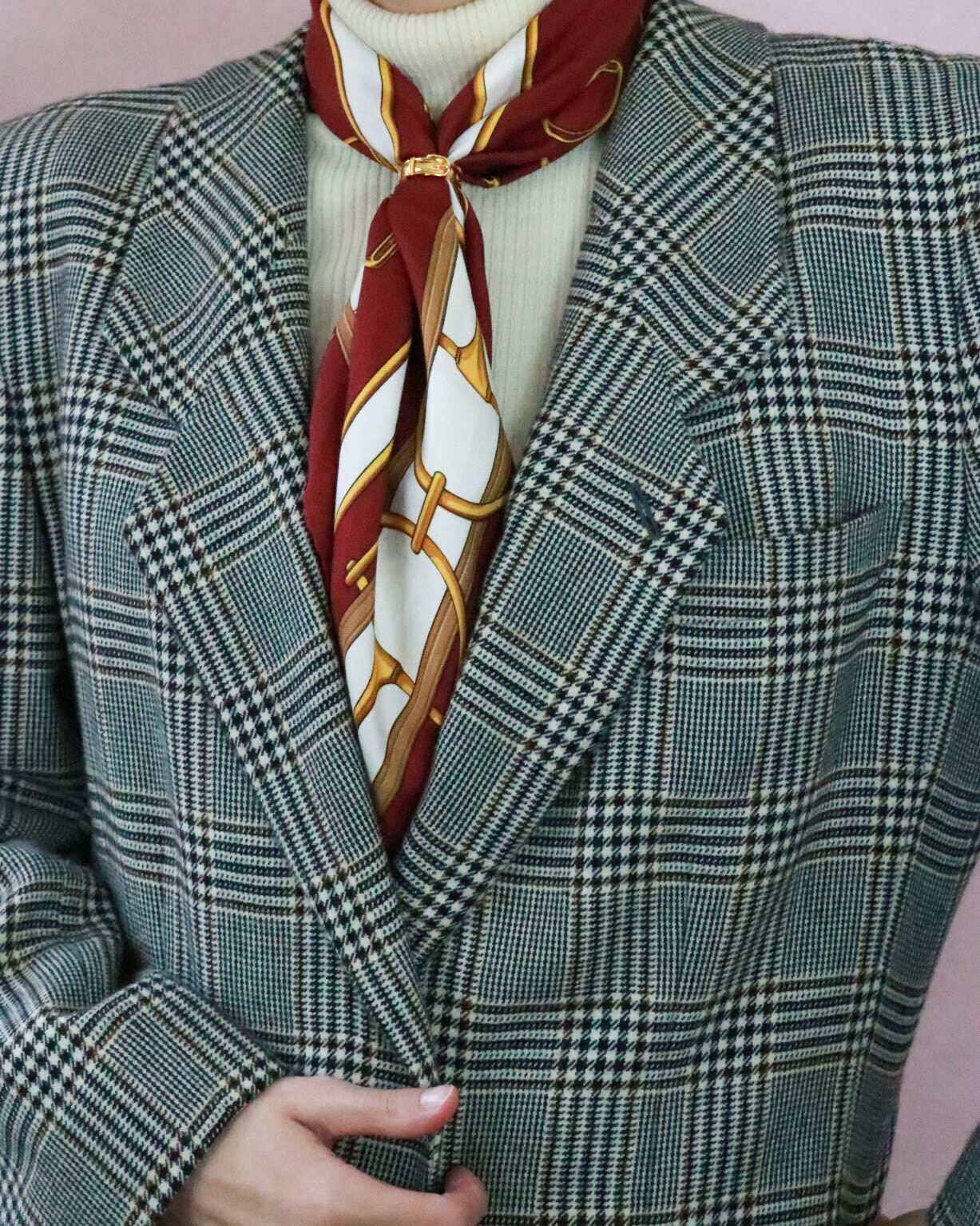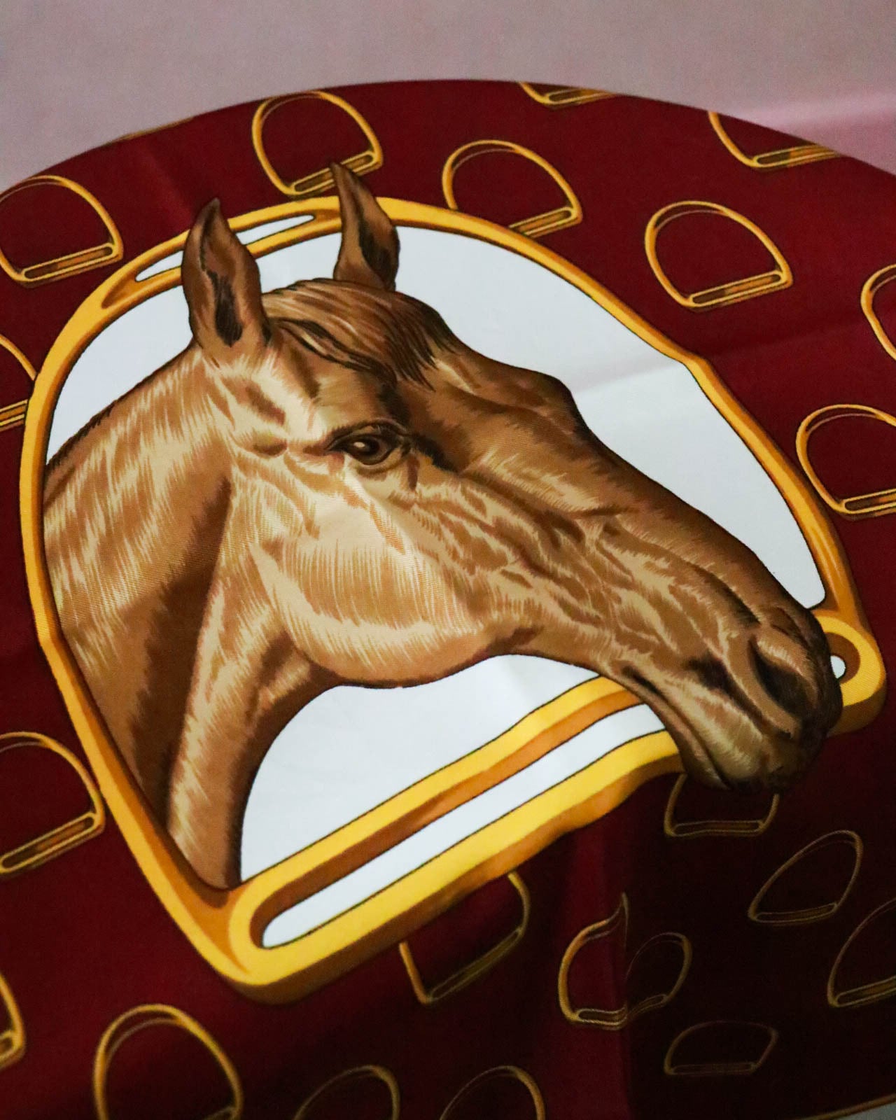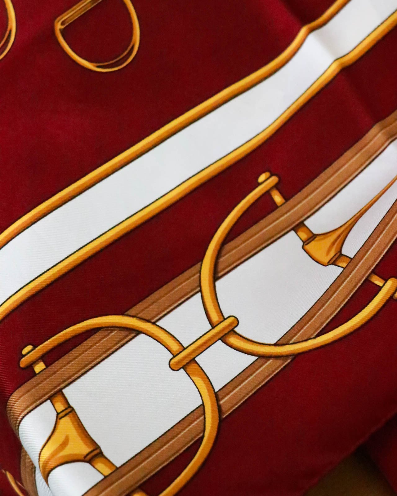 ダークレッドベースのシルク素材に、ブランド象徴の馬ロゴやホースビットが並んだクラシカルなデザイン。上品な配色で、手軽にスタイリングに取り入れやすいので、スカーフ初心者の方にもオススメです。