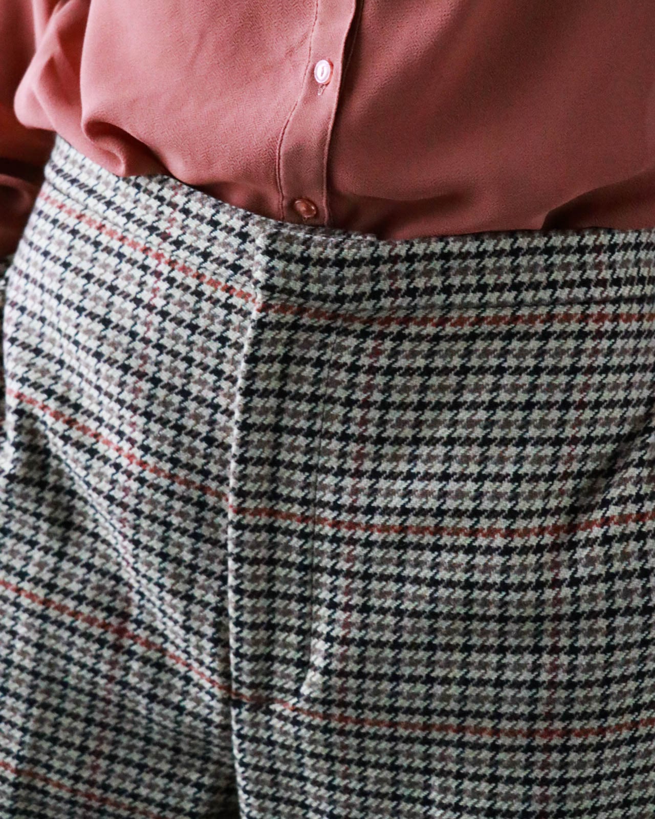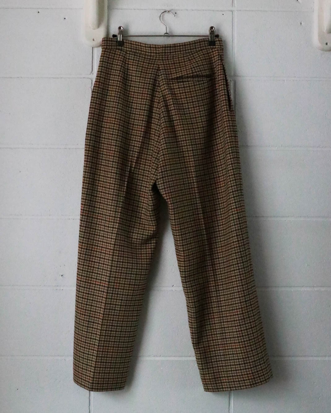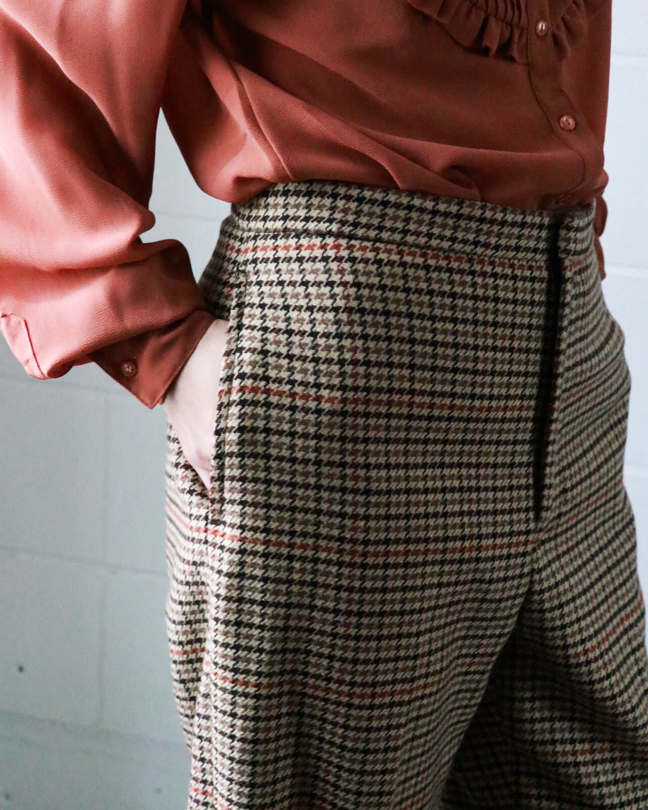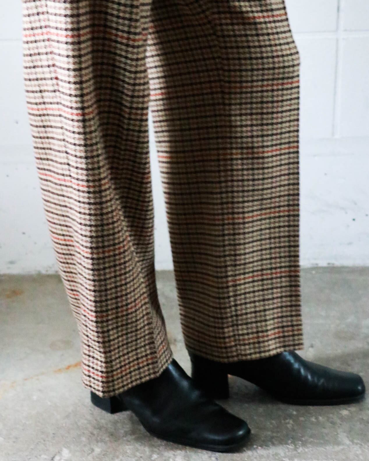 クラシックなムードが漂う、チェックパンツ。落ち着いたブラウンベースにチェック柄が施され、トラッドでありながらも女性らしい柔らかさを感じさせる一本です。