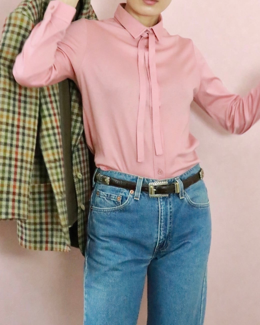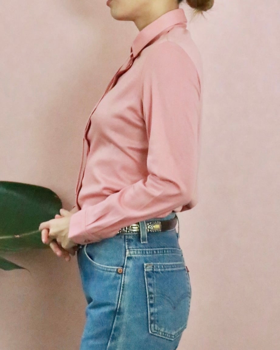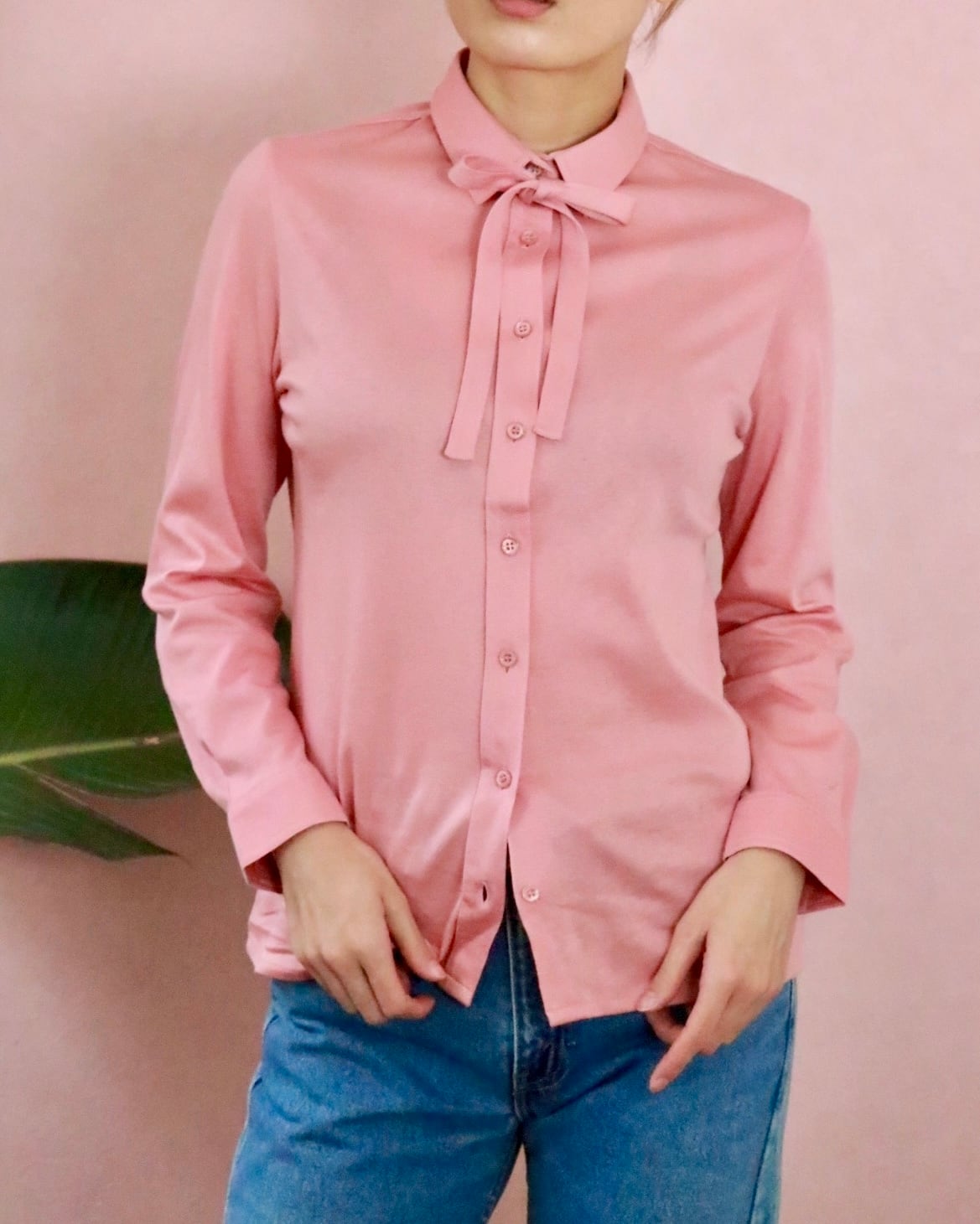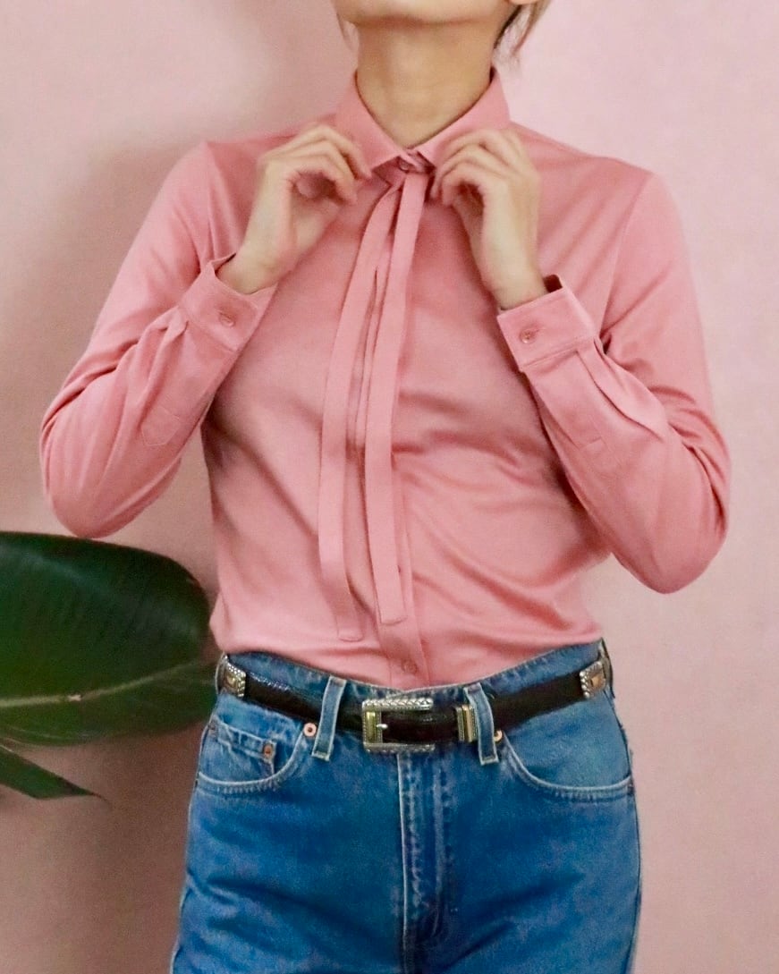 1884年にできたイギリスのブランド、イエーガー。こちらは華奢なリボンが特徴のライトピンクブラウス。ソフトな肌触りでフィット感のあるボディー。ボトムも合わせやすく、年中大活躍します。