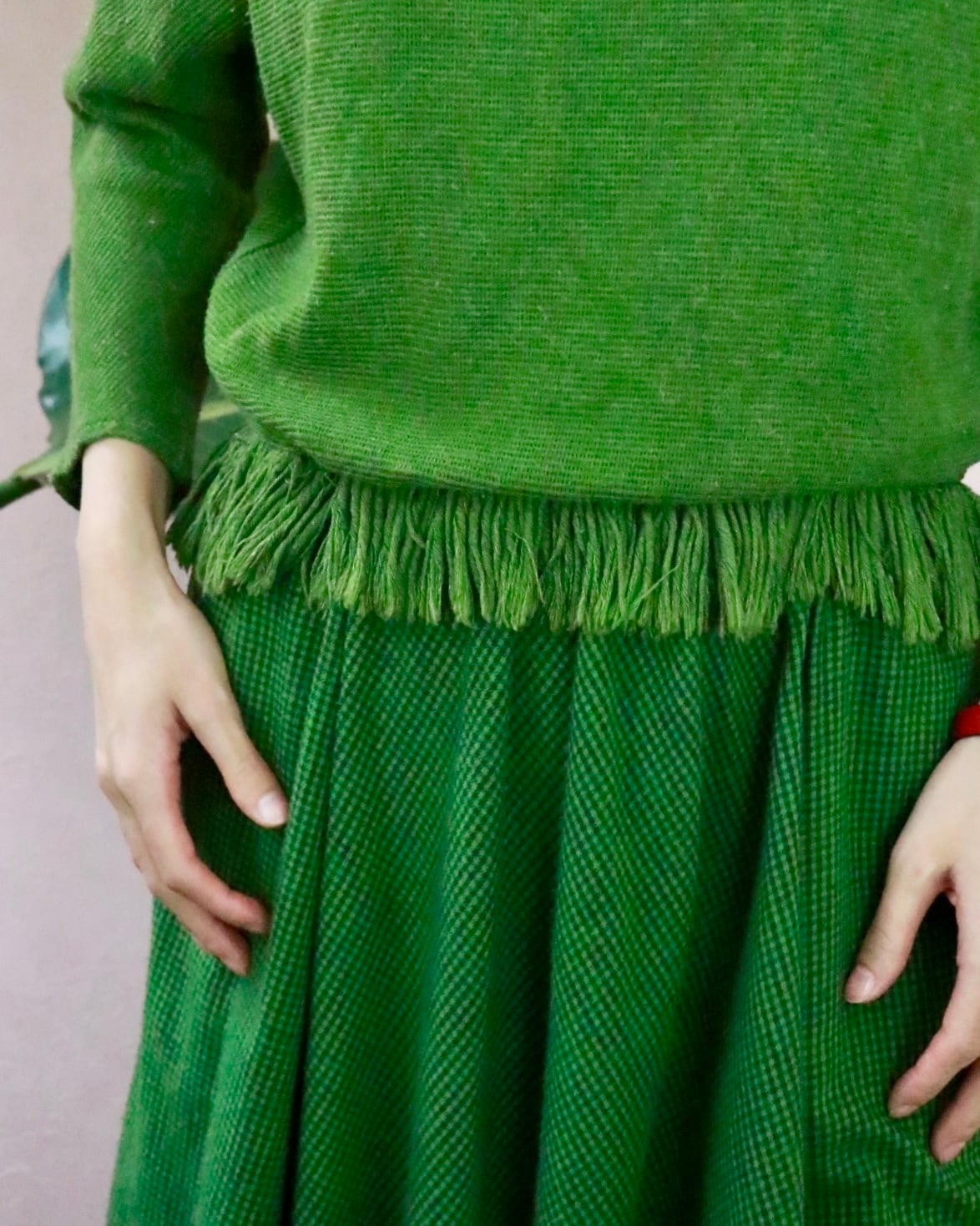 愛らしいフリンジのディテールが首元とウエスト部を華やかにみせます。
