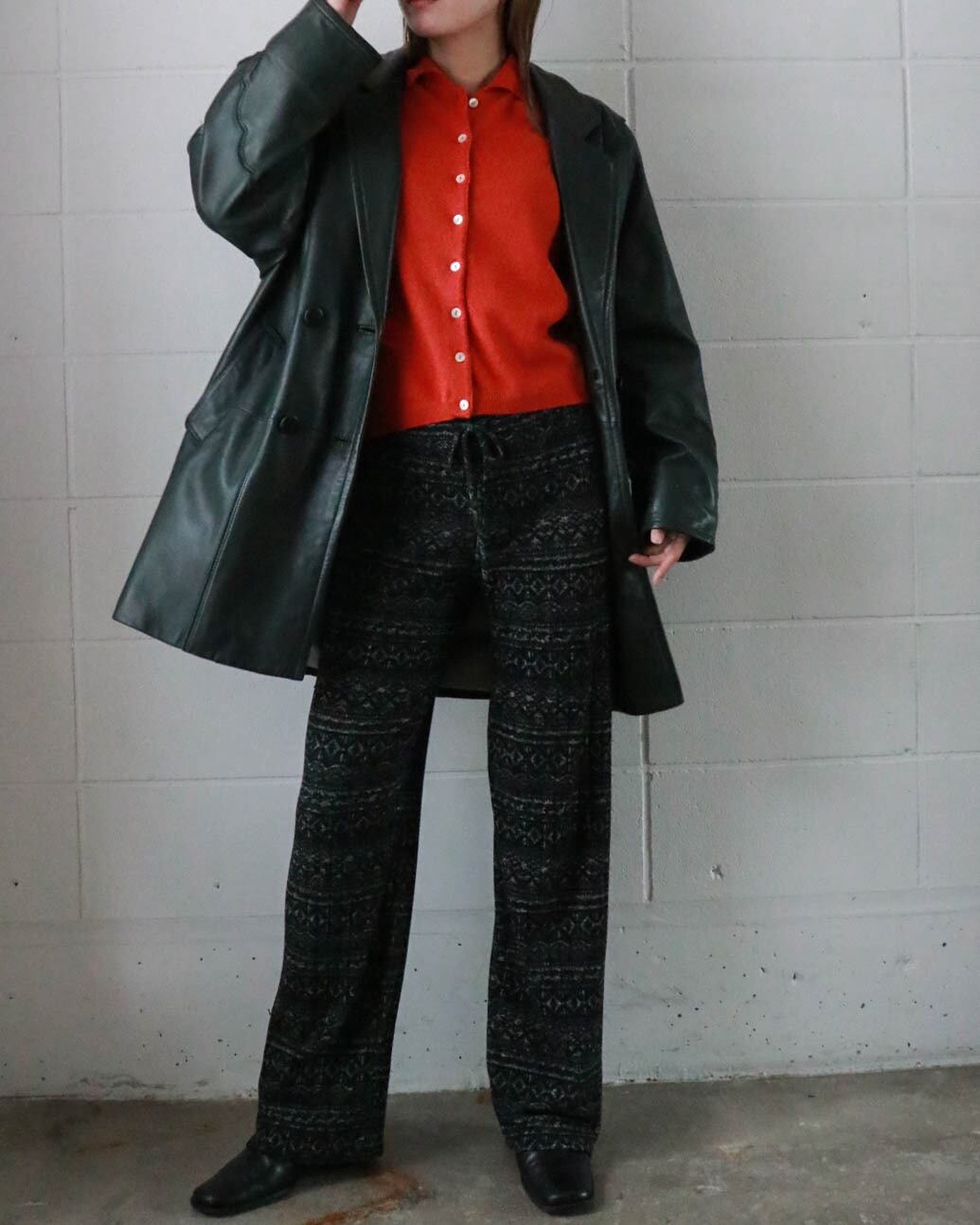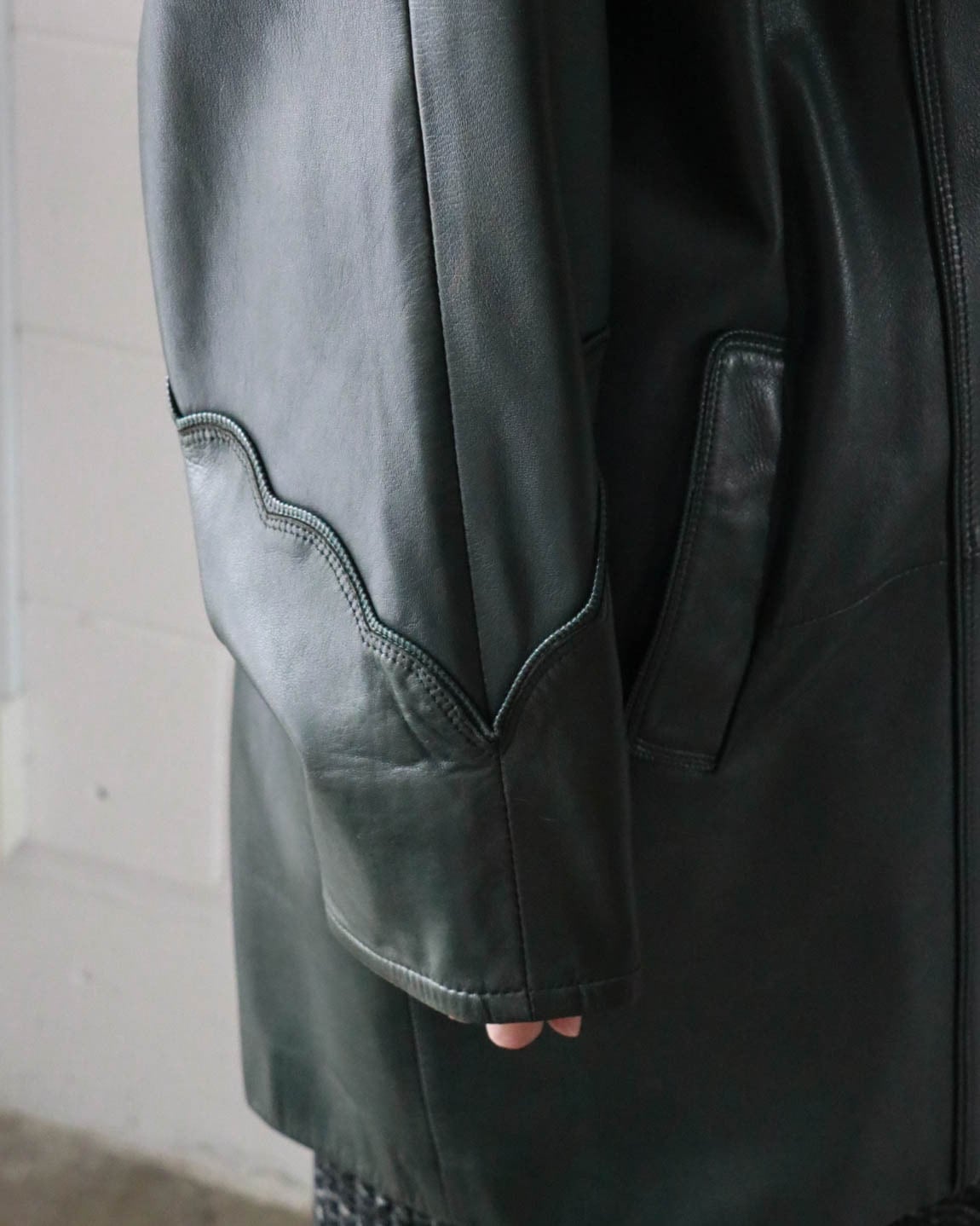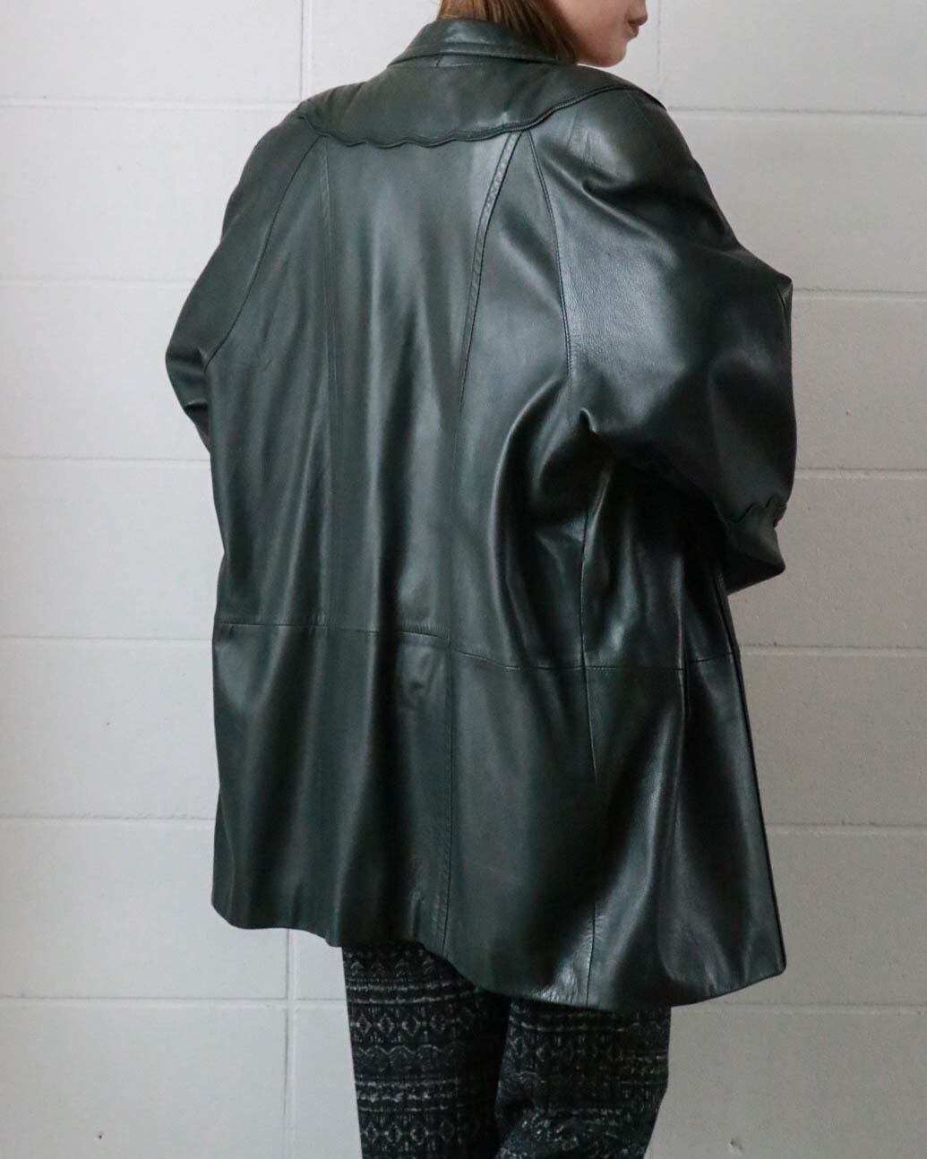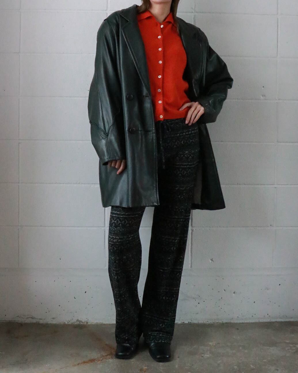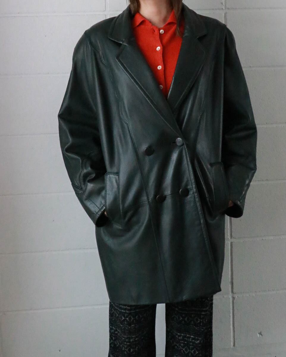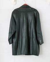 ダークグリーンのレザーコートはピエールバルマンのヴィンテージ。ゆったりとしたボディーがが洗練されたデザインで、どんなスタイルにもエッジをプラスしてくれます。肌寒い季節大活躍するアウター、お早めにどうぞ。