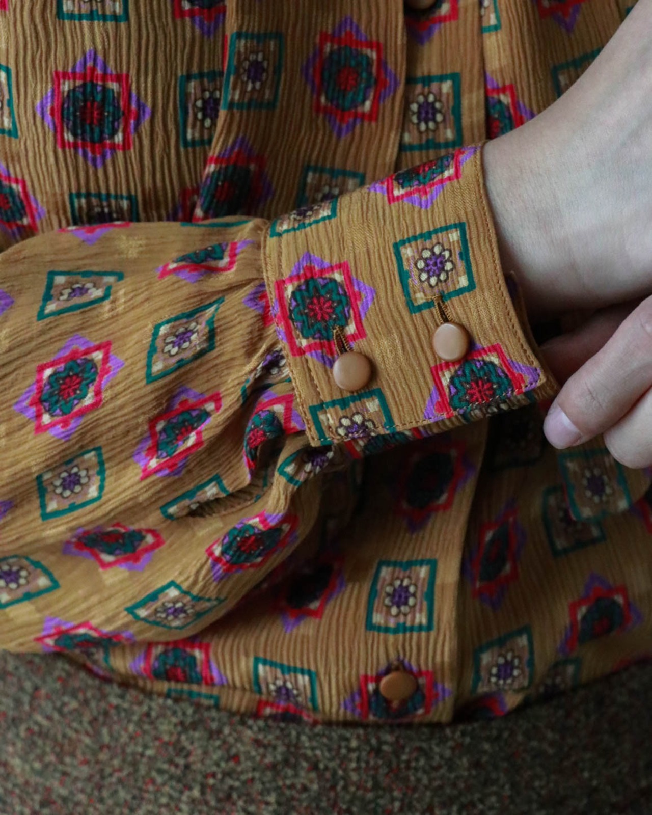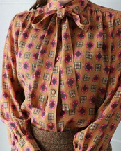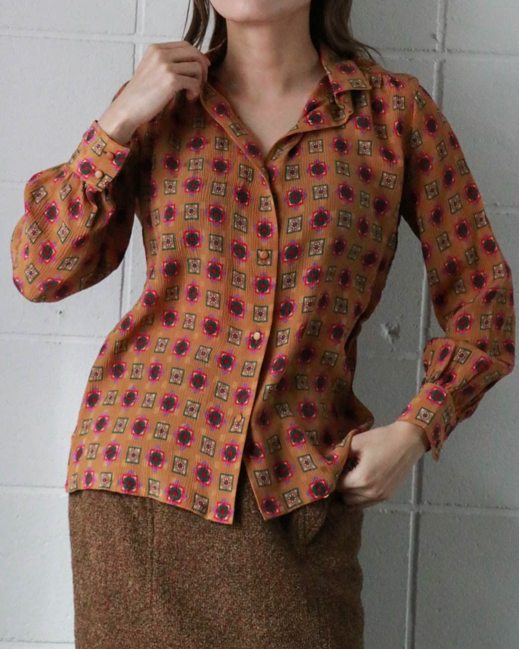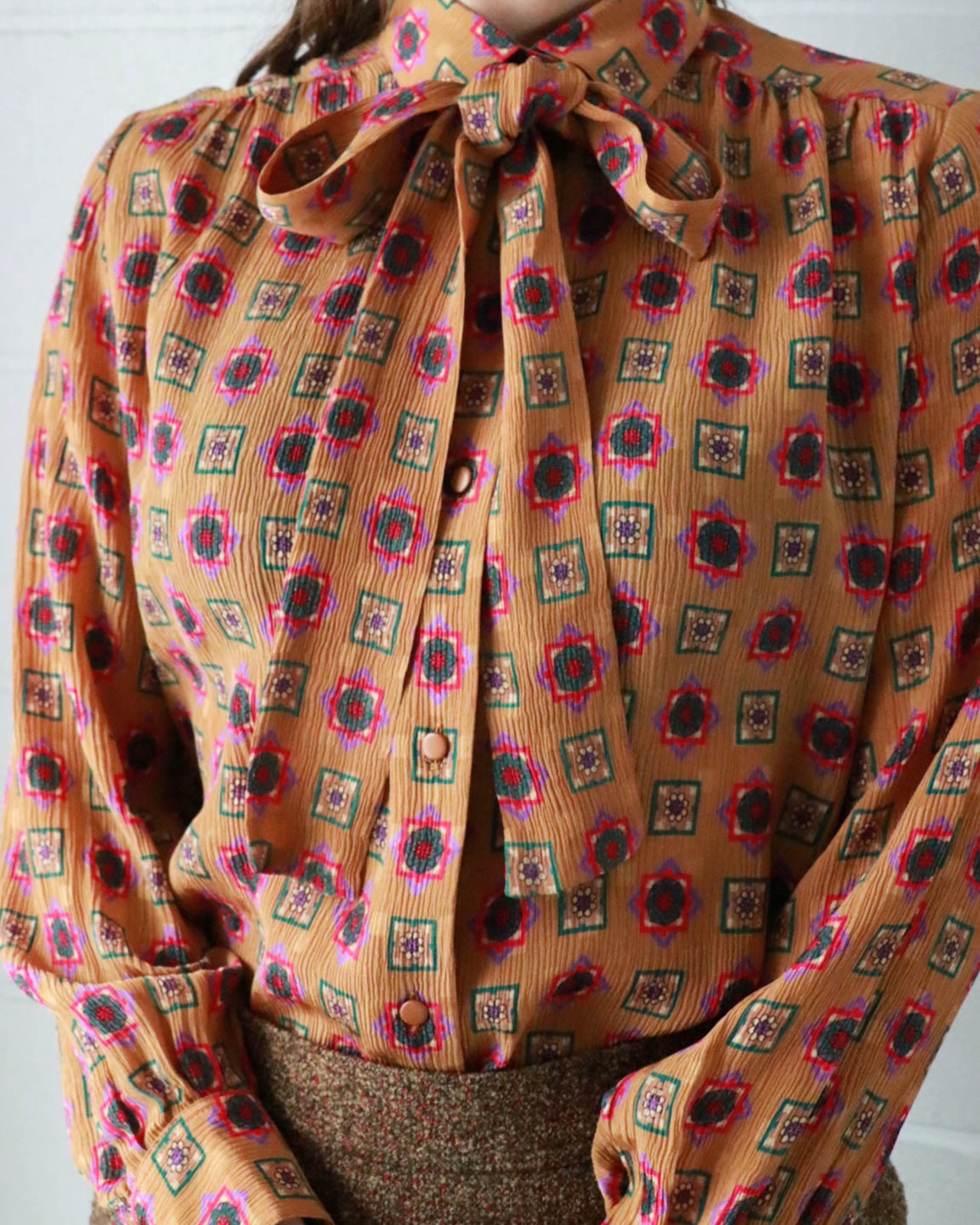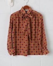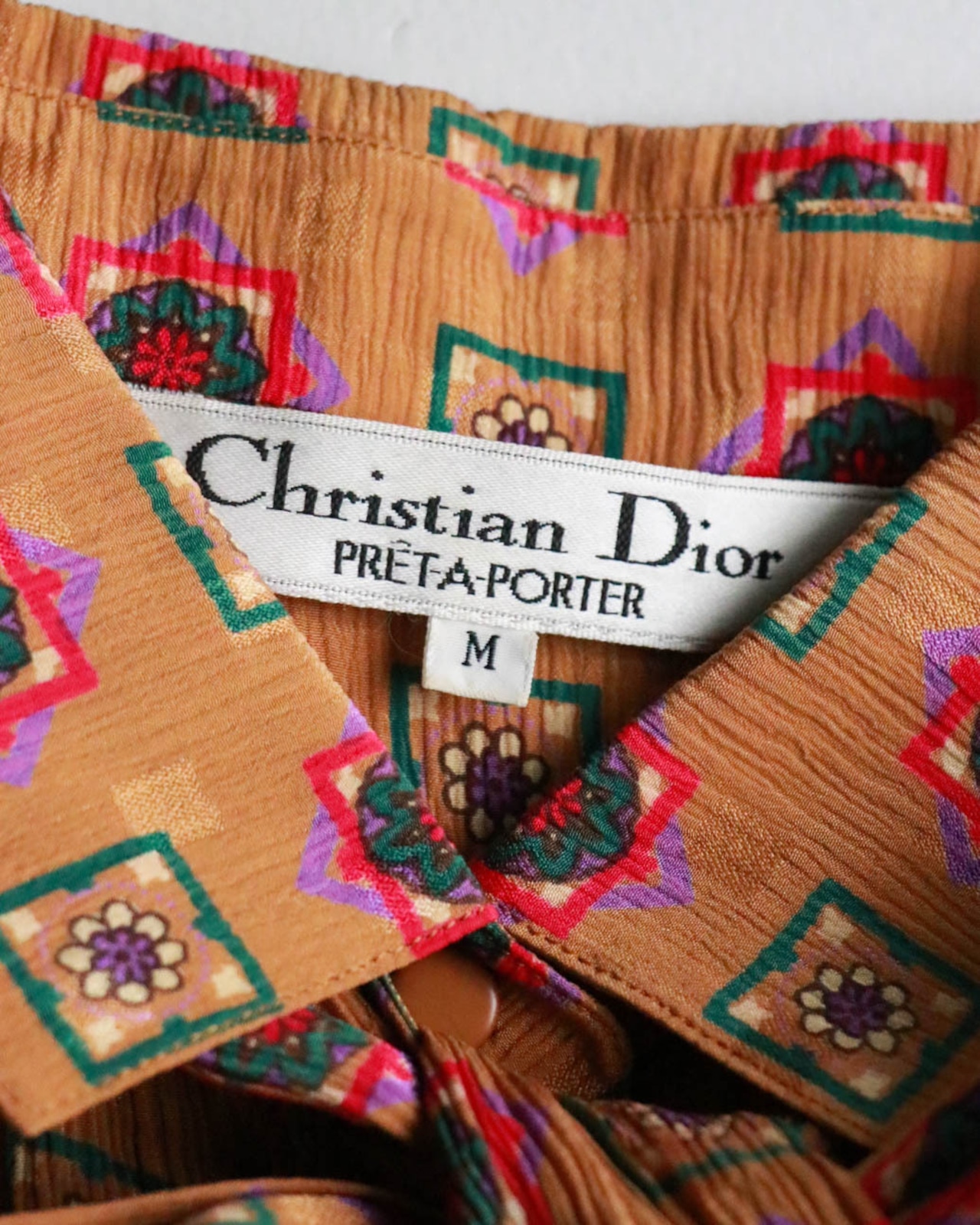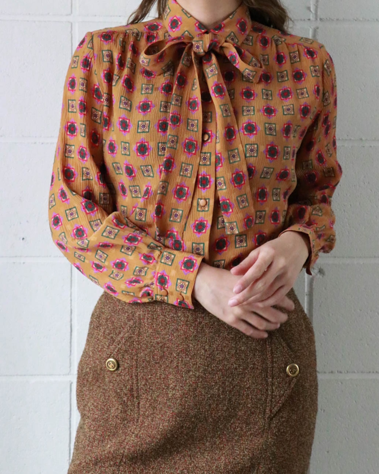 温かみのあるキャメルブラウンに幾何学柄にフローラルが溶け合うディオールらしいプリント。首元のボウタイがクラシカルなムードを添え、さりげなく女性らしさを引き立ててくれる一枚です。