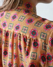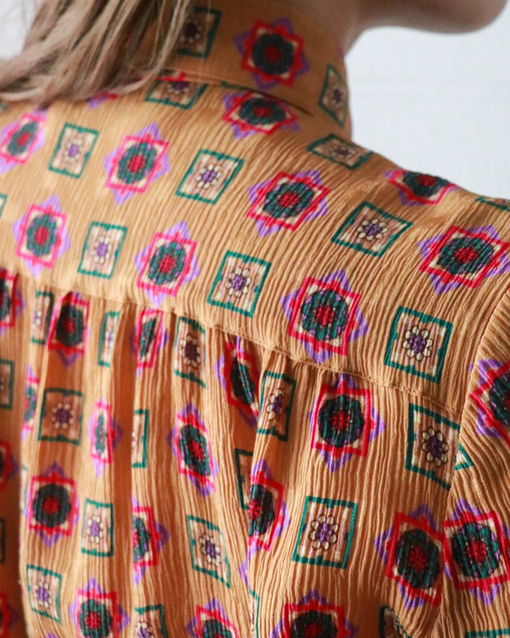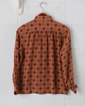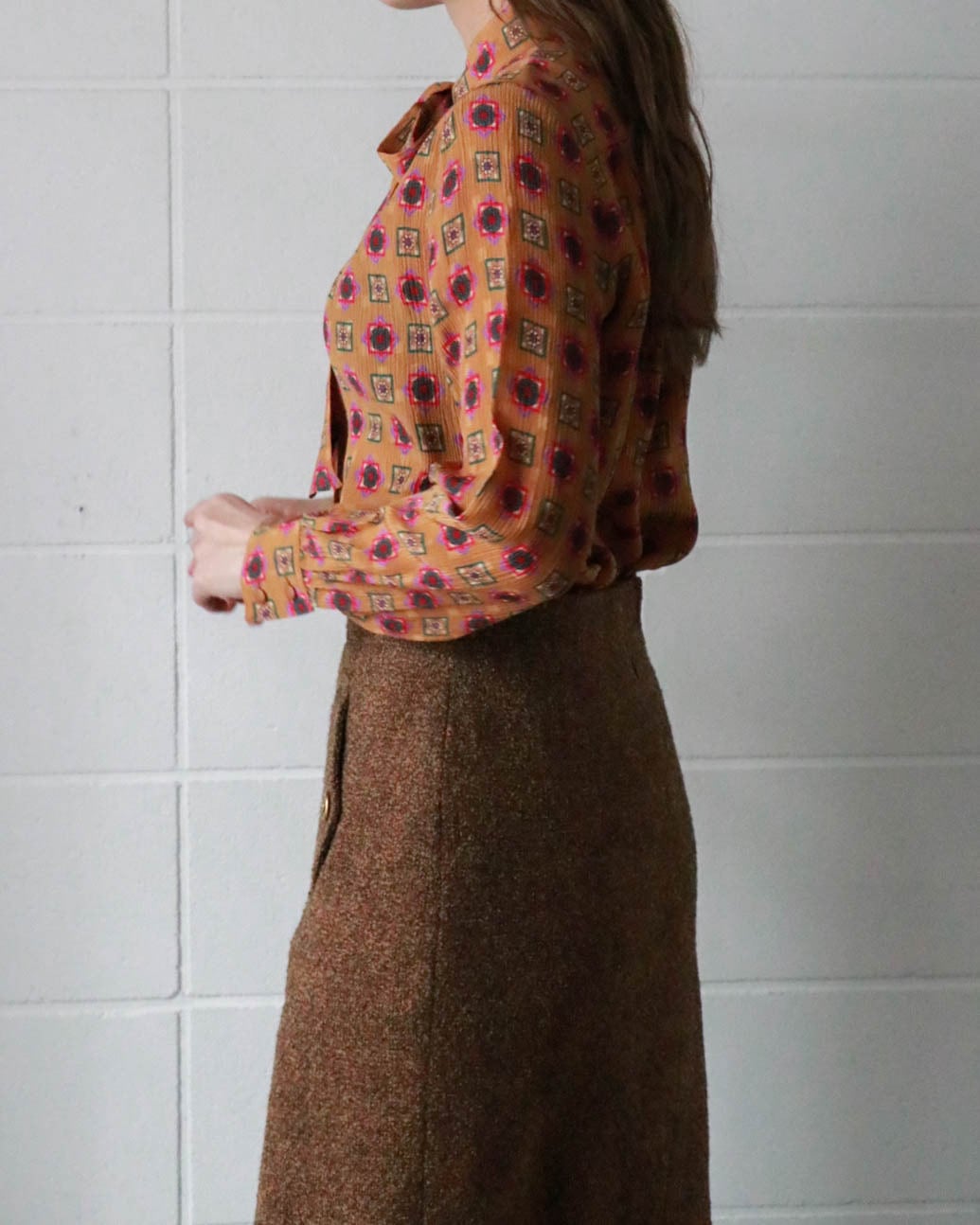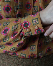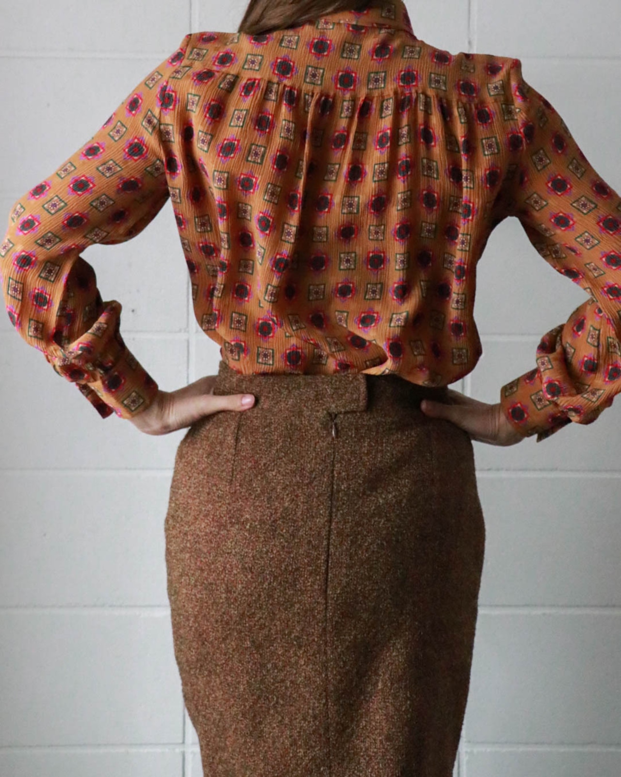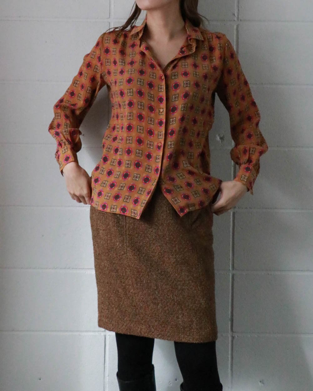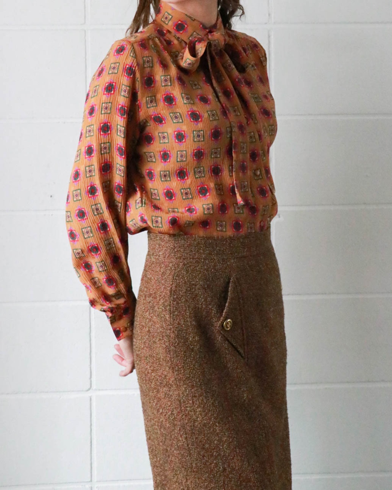 温かみのあるキャメルブラウンに幾何学柄にフローラルが溶け合うディオールらしいプリント。首元のボウタイがクラシカルなムードを添え、さりげなく女性らしさを引き立ててくれる一枚です。