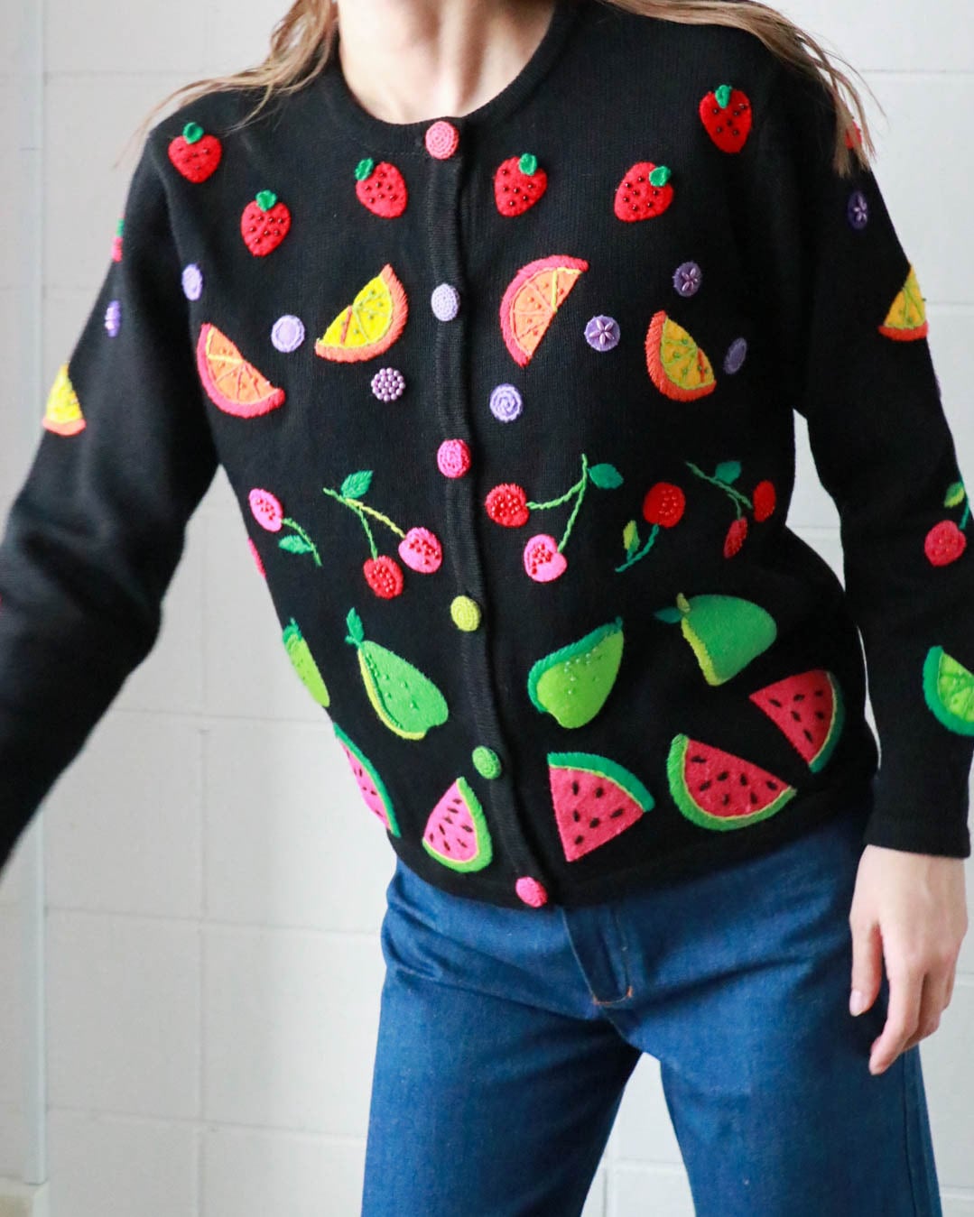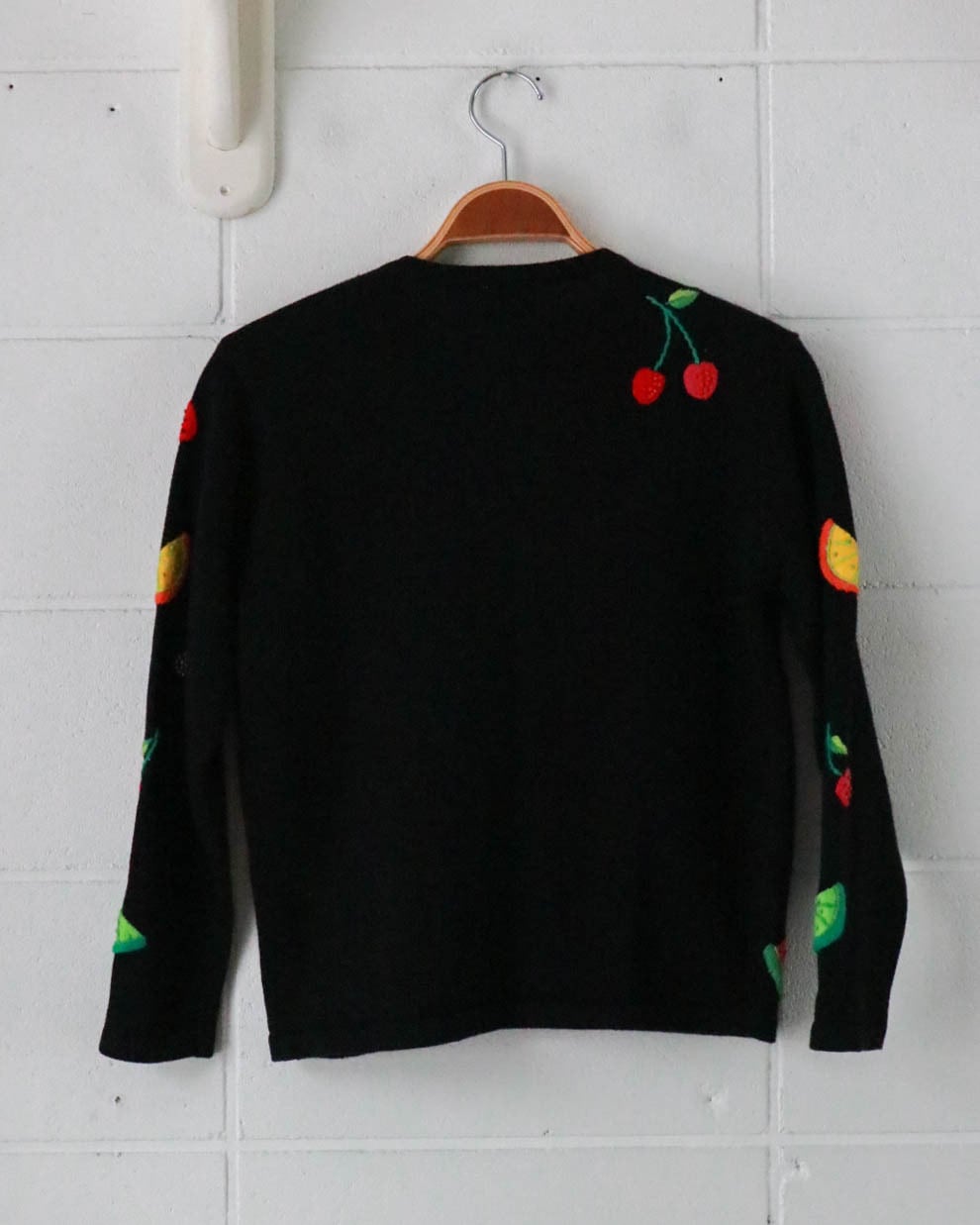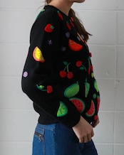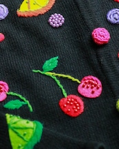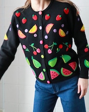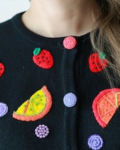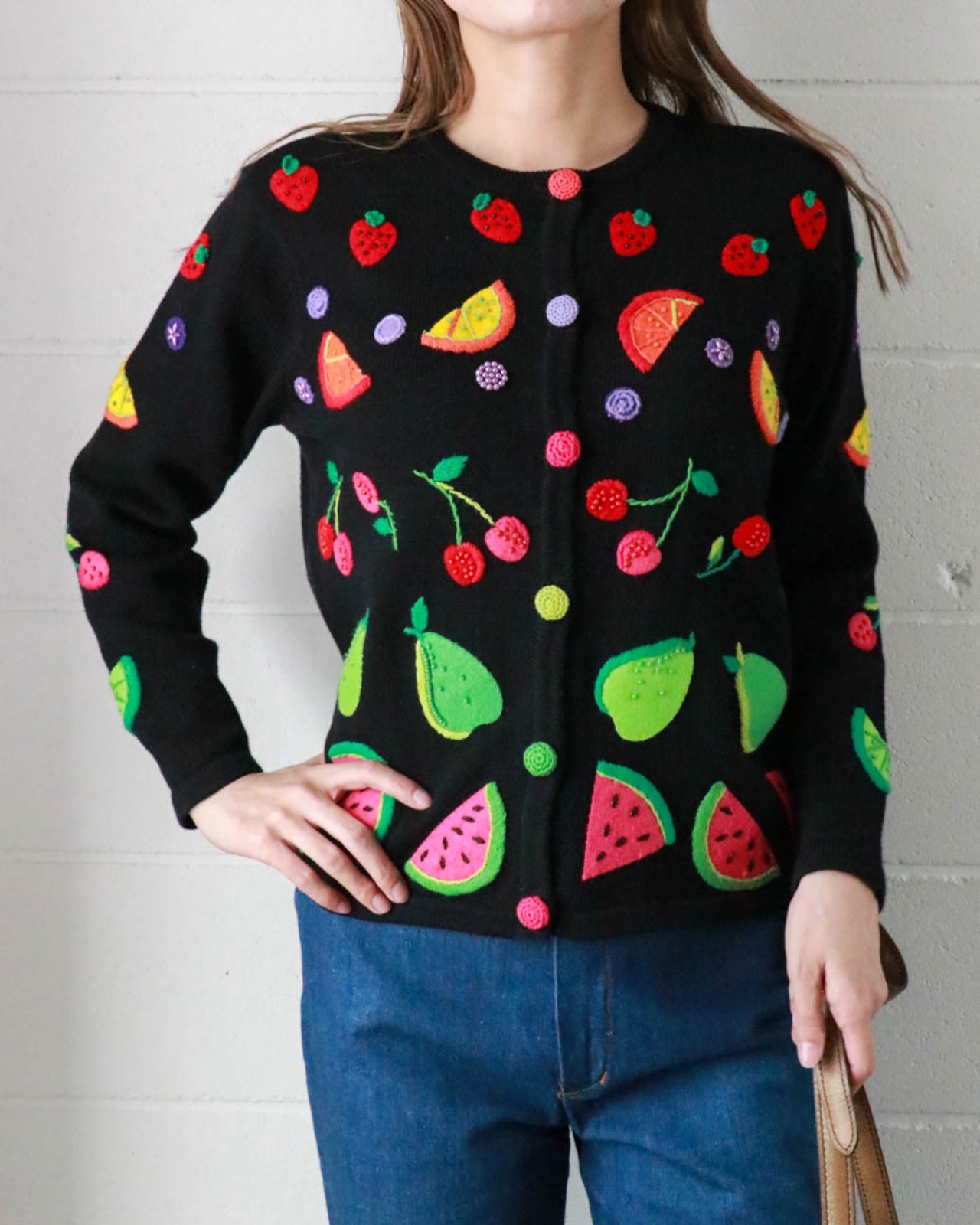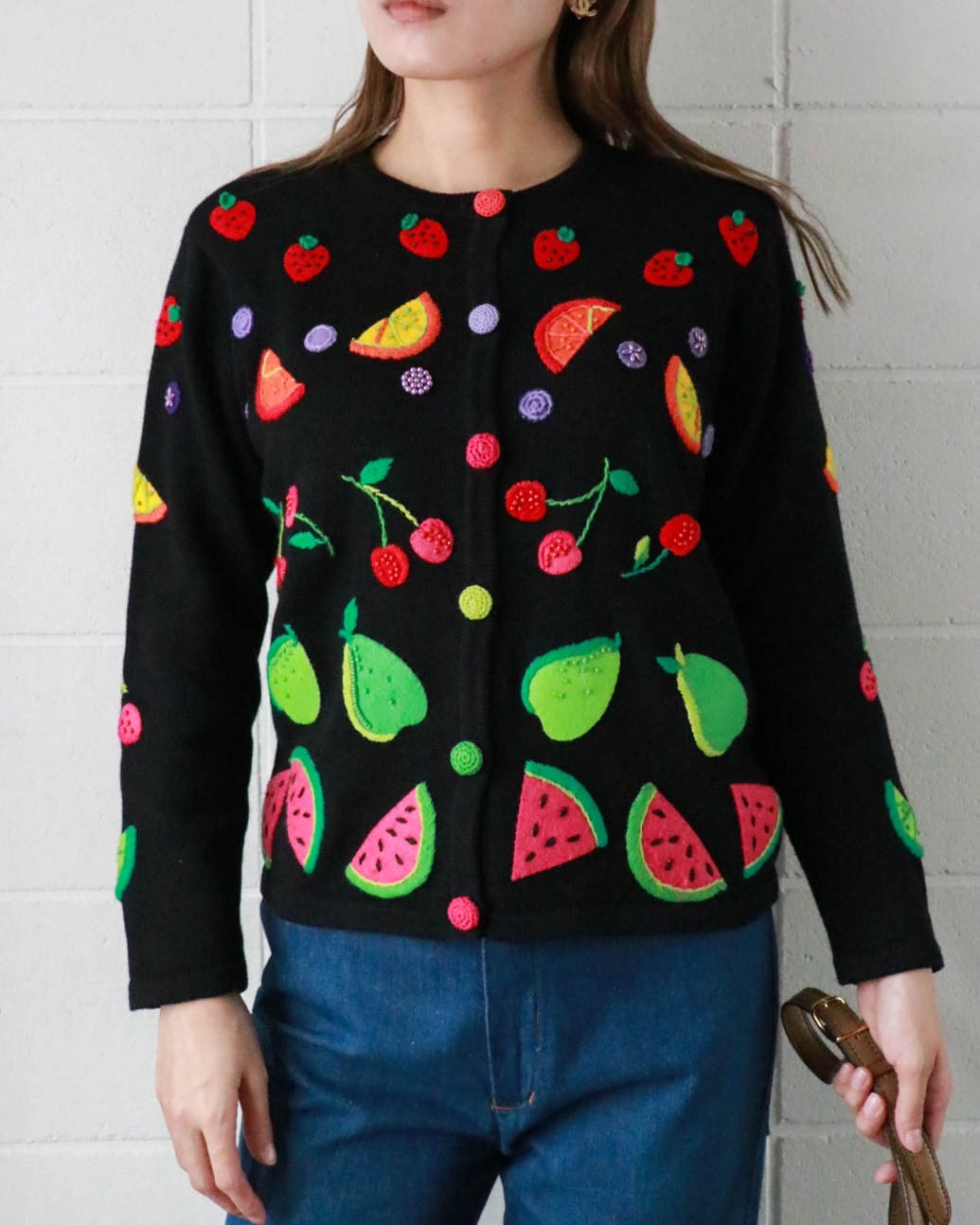 ブラックニットにカラフルなフルーツモチーフを散りばめた遊び心たっぷりのニットカーディガン。