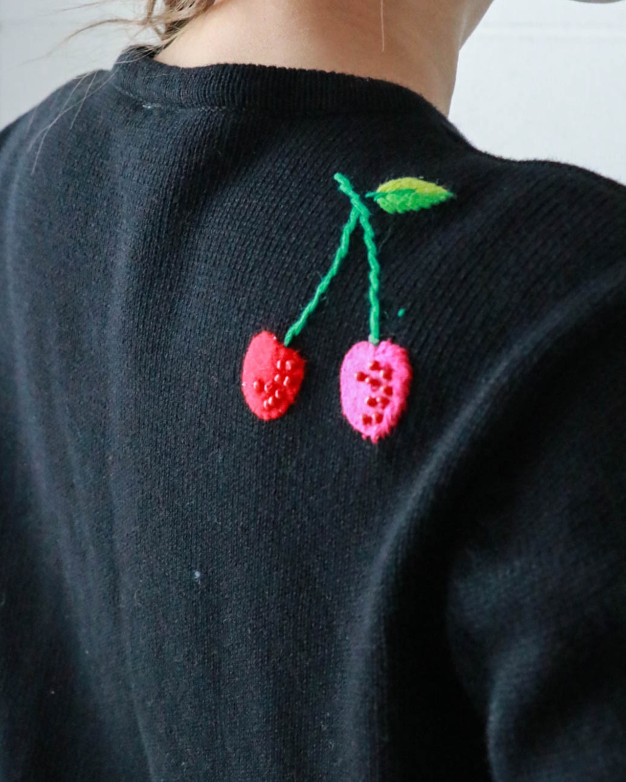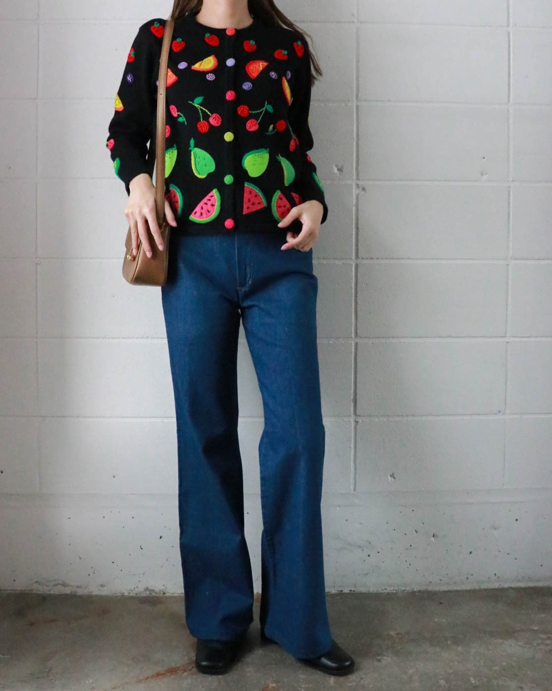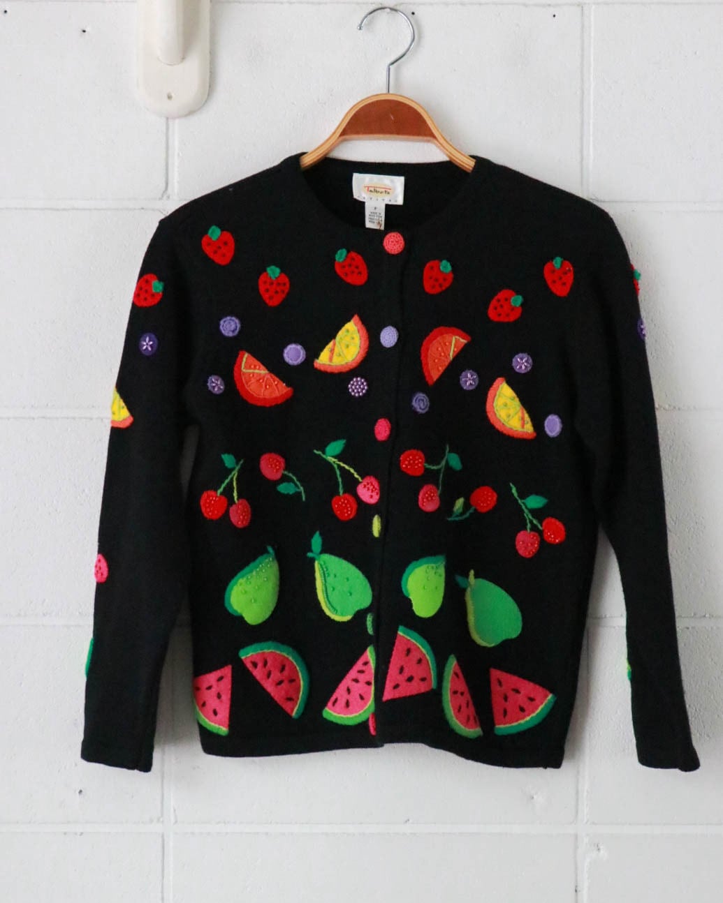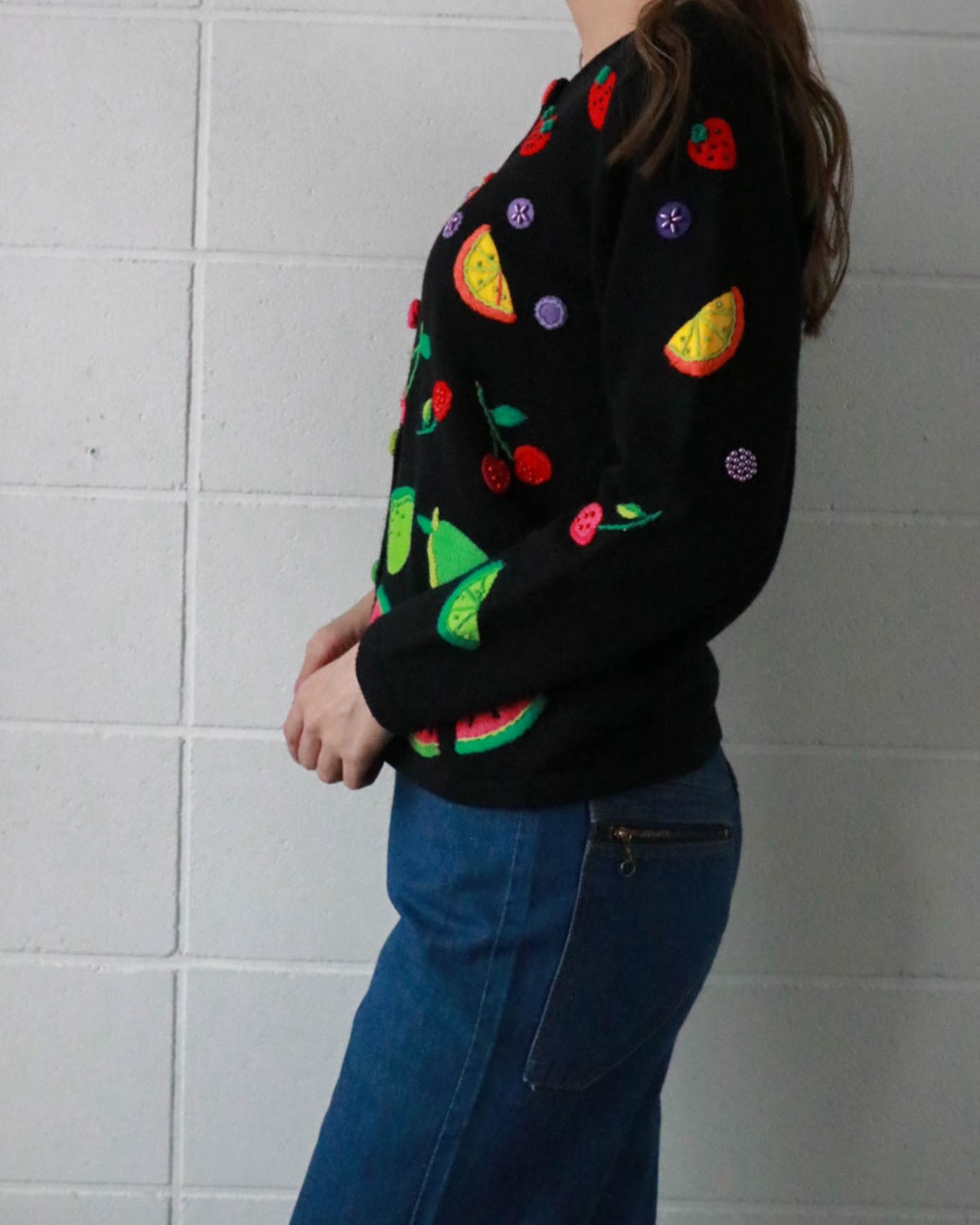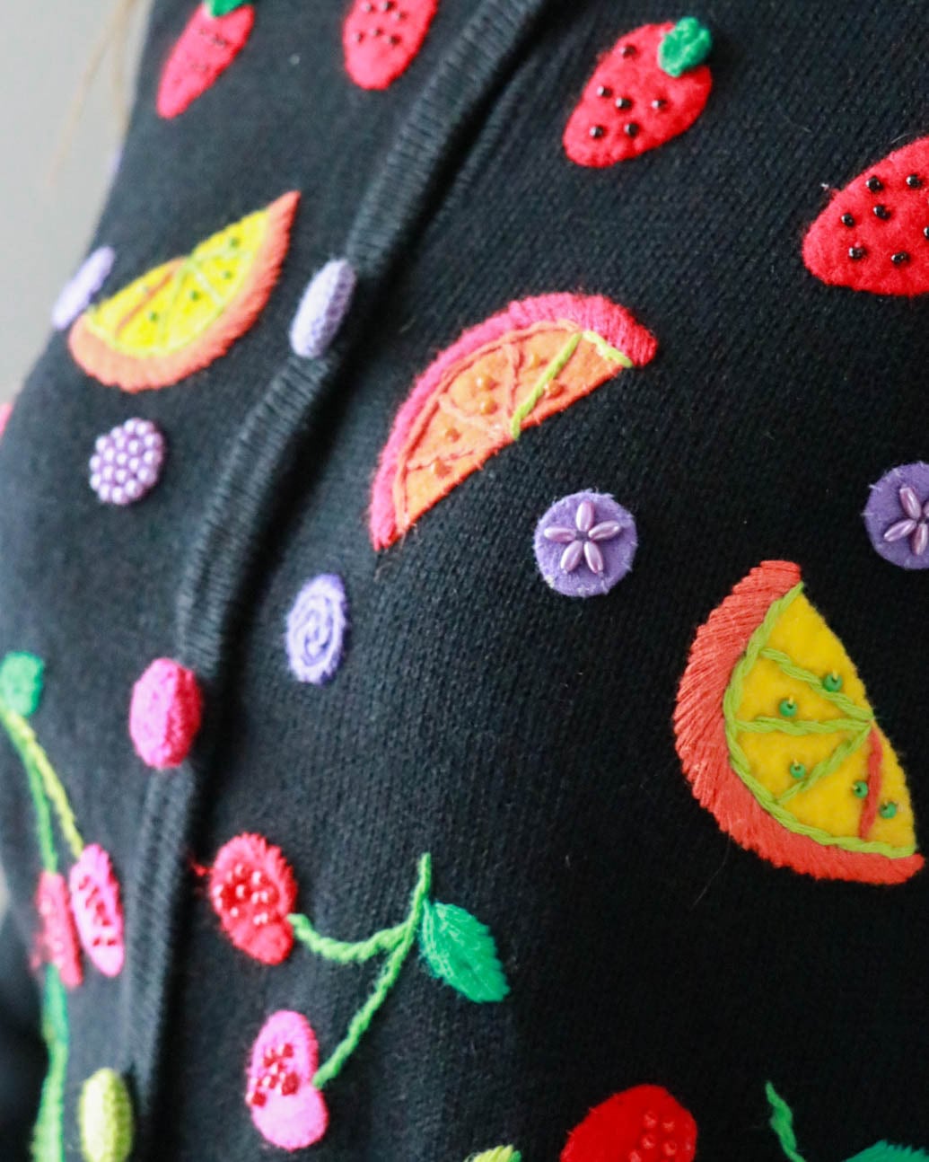 ブラックニットにカラフルなフルーツモチーフを散りばめた遊び心たっぷりのニットカーディガン。