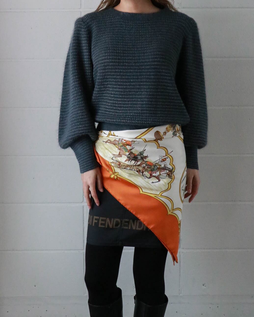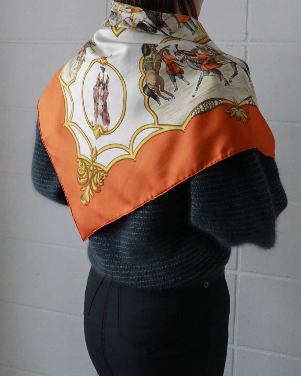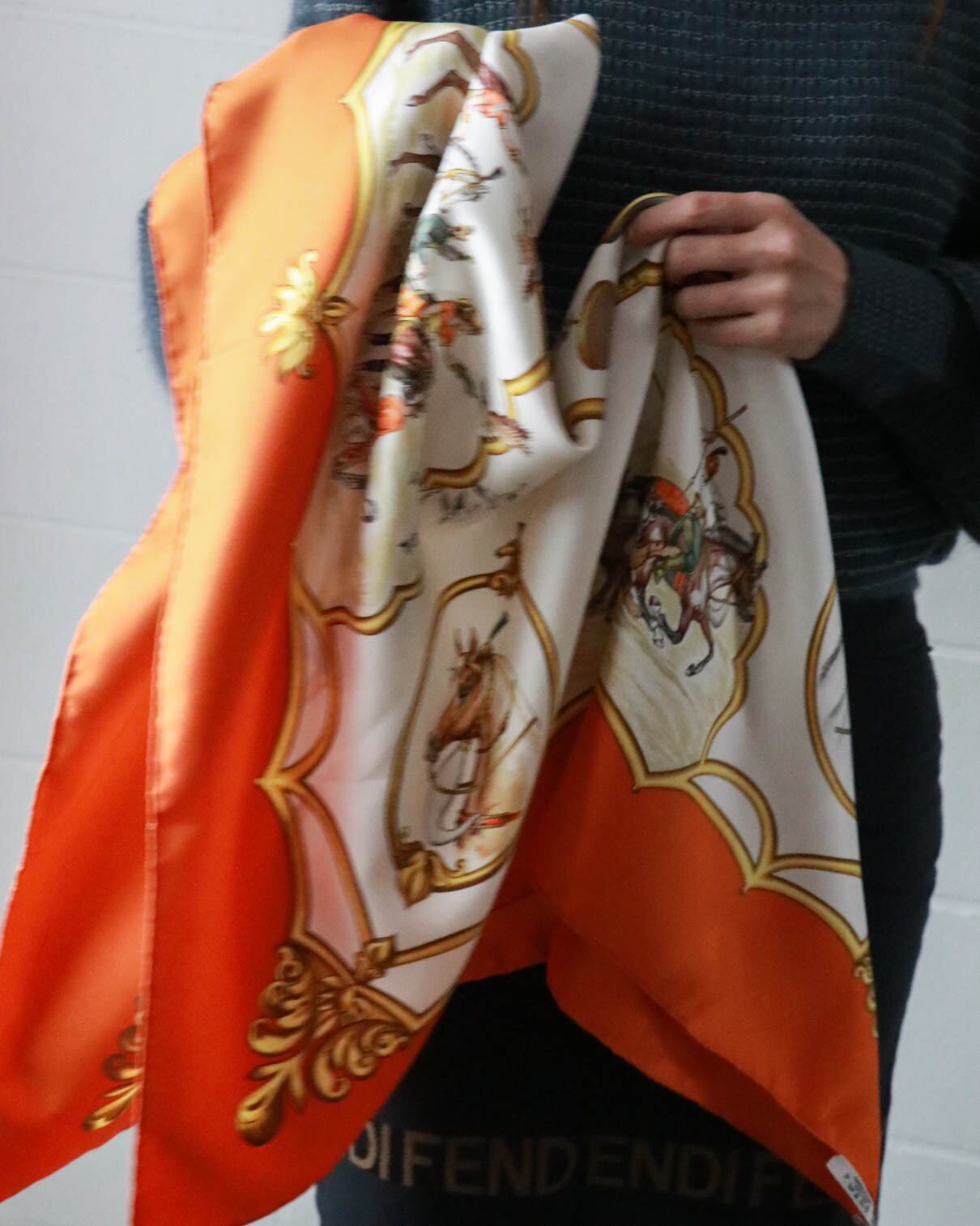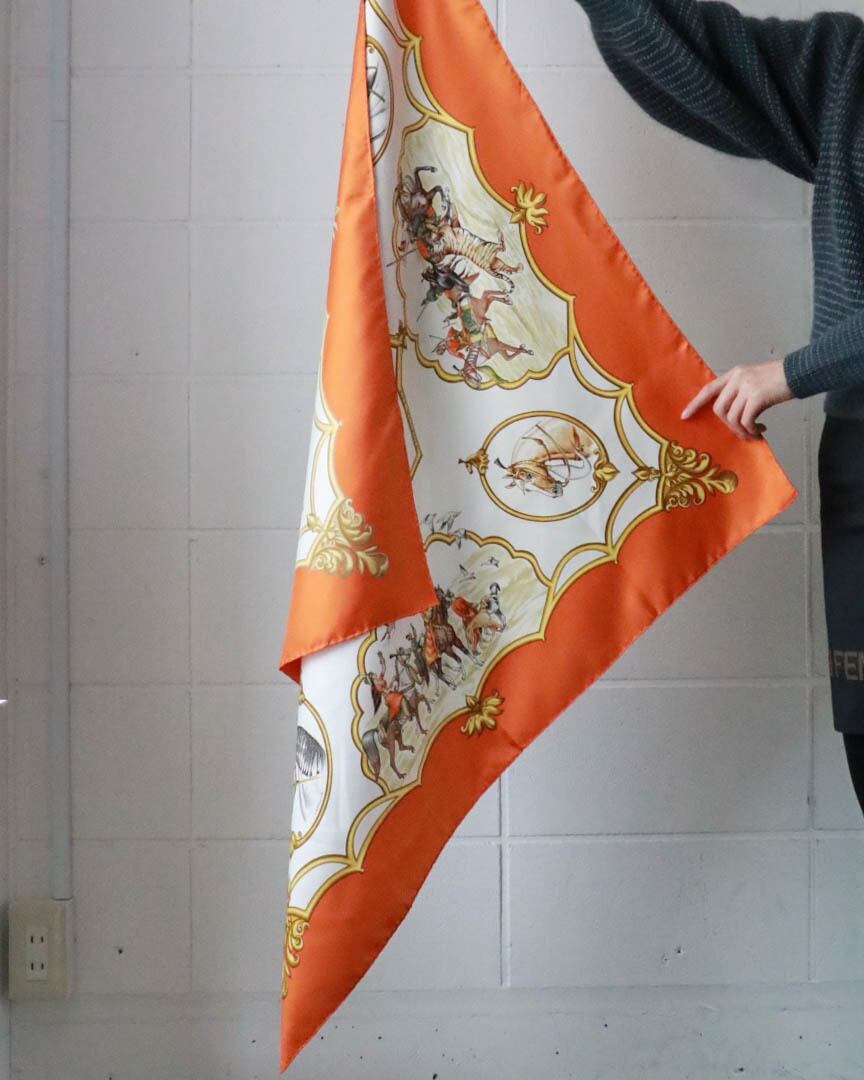 エルメスの80年代後半の名作カレ。こちらはオレンジボーダーラインがこれからのシーズンにぐっとはまる。ムガル帝国をテーマにしたデザインがとてもクラシカルな一枚。