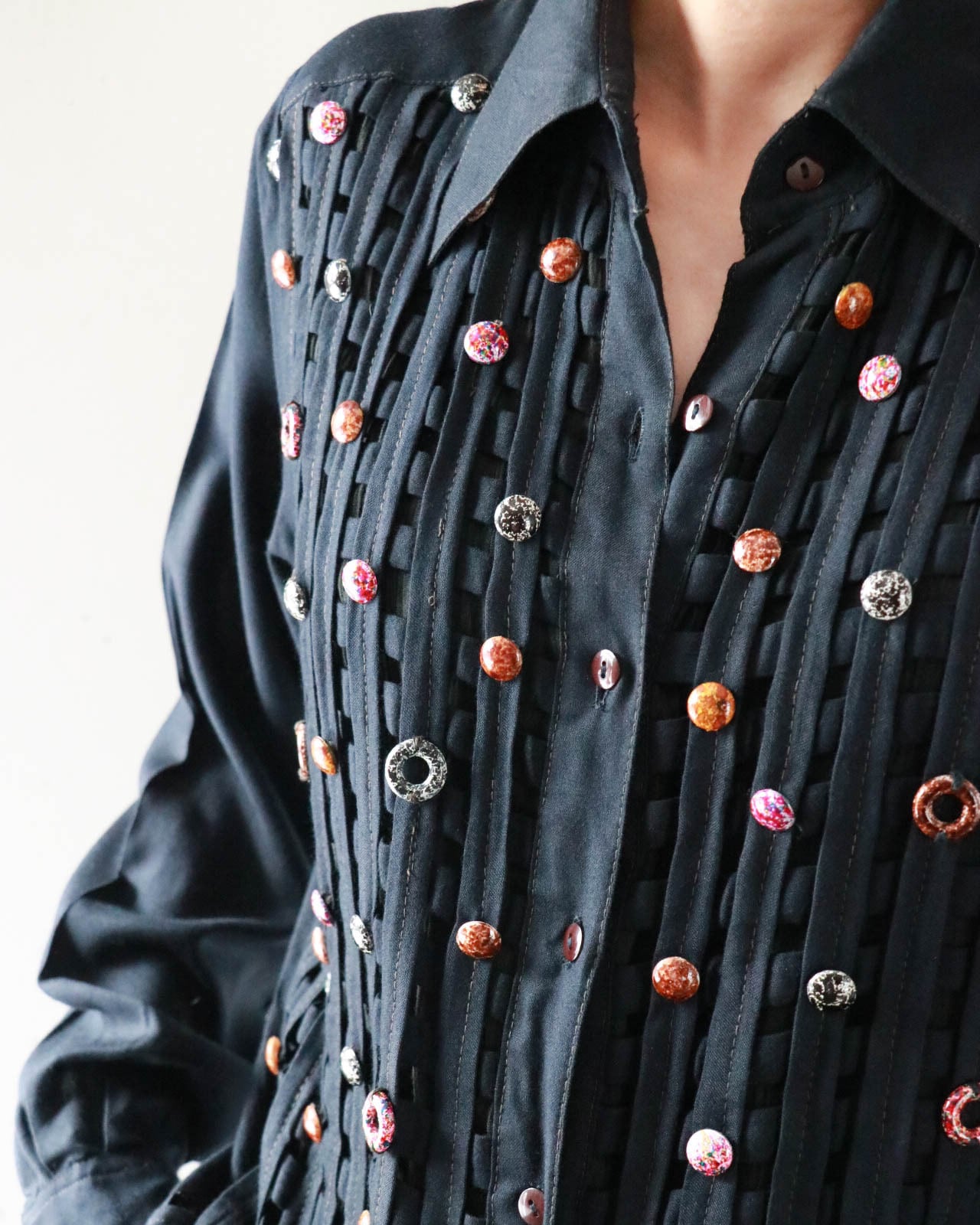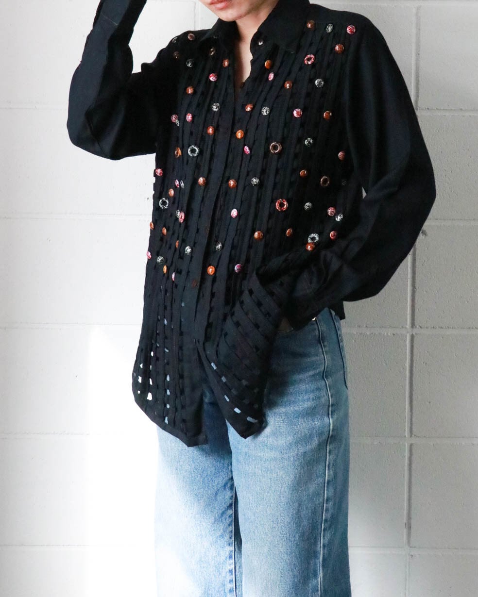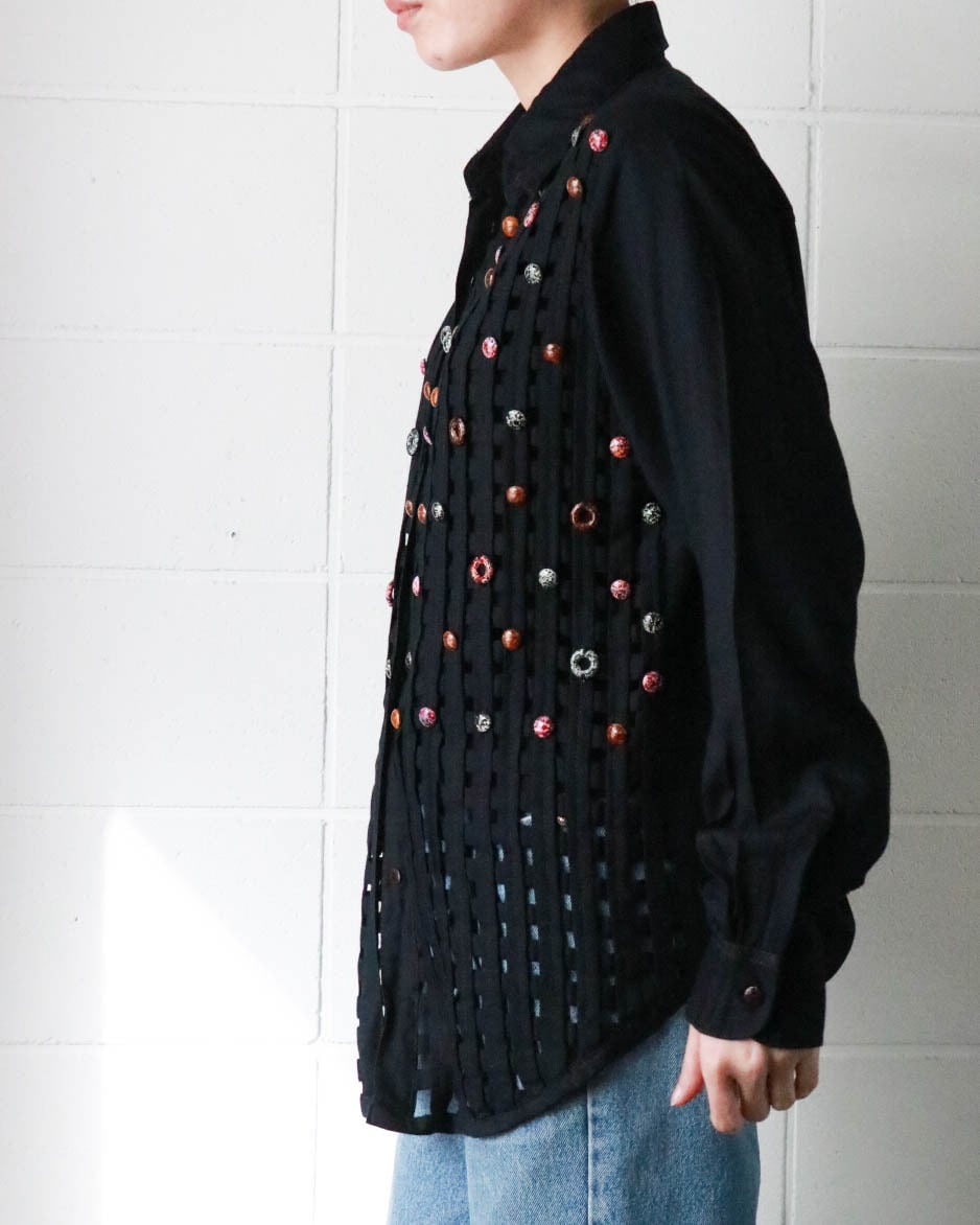カットワークとカラフルなボタンのデザインがユニークな黒シャツが入荷。