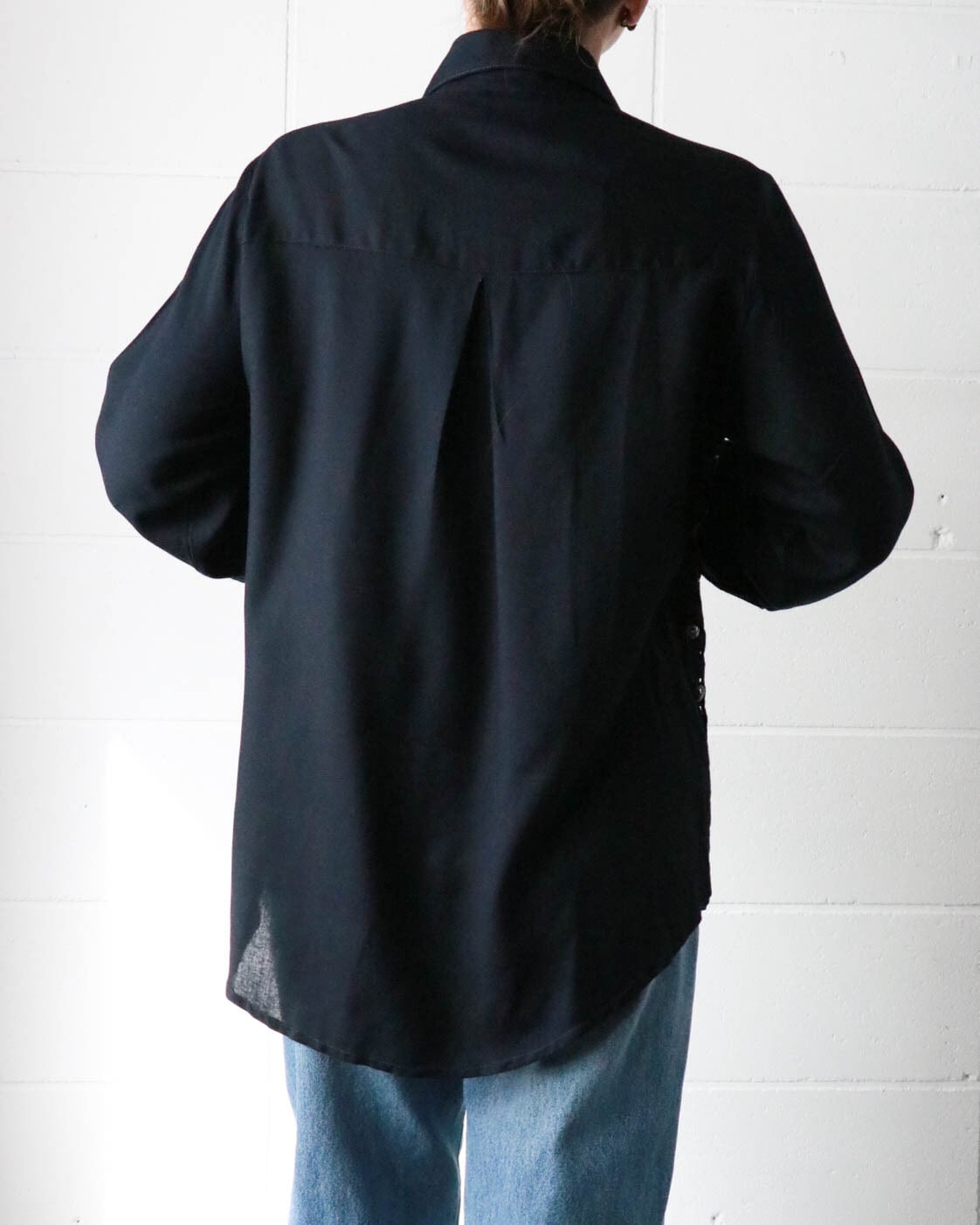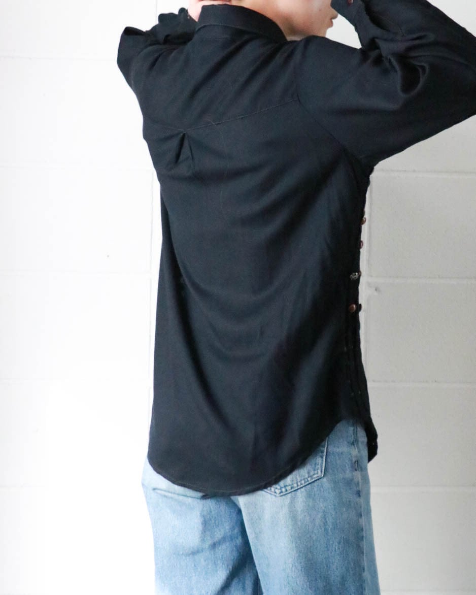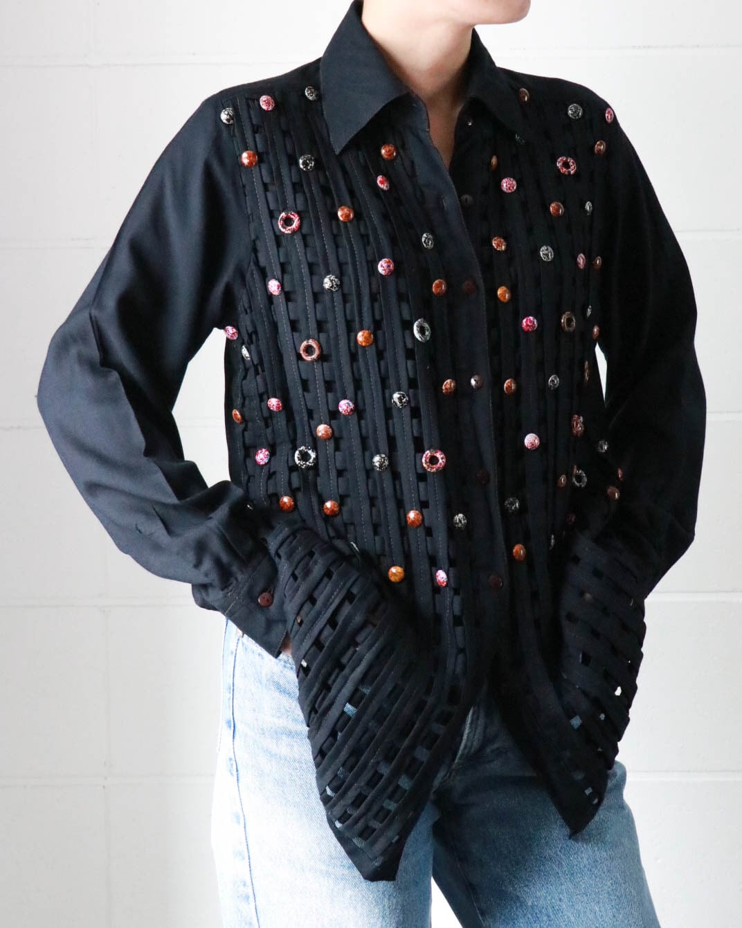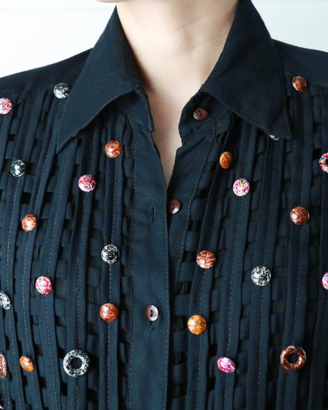 カットワークとカラフルなボタンのデザインがユニークな黒シャツが入荷。
