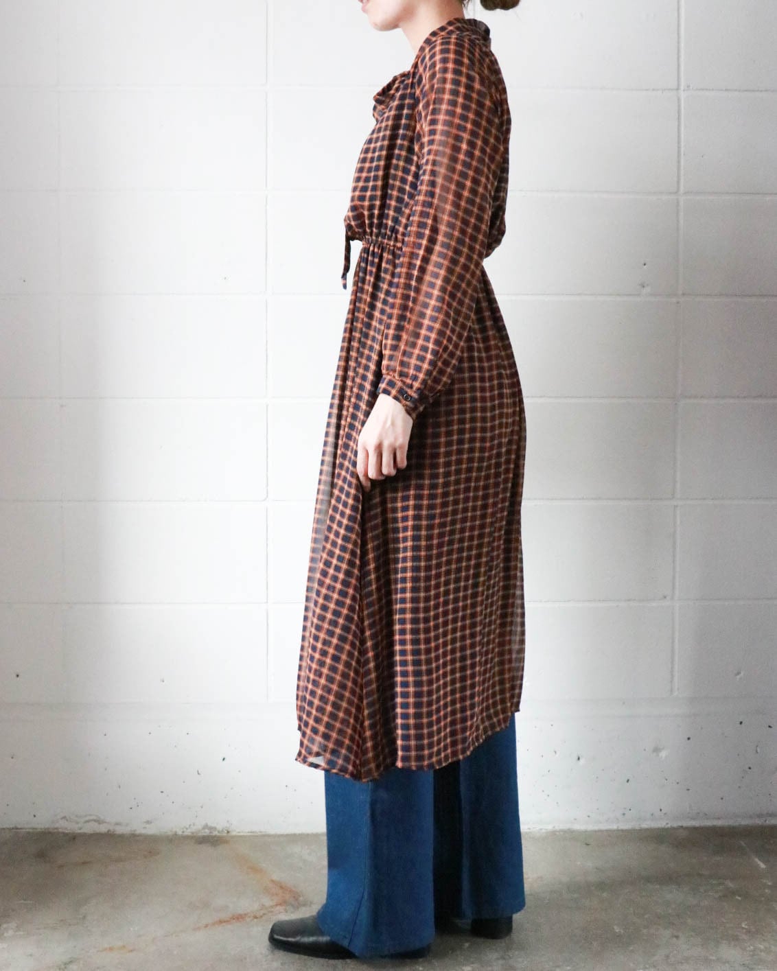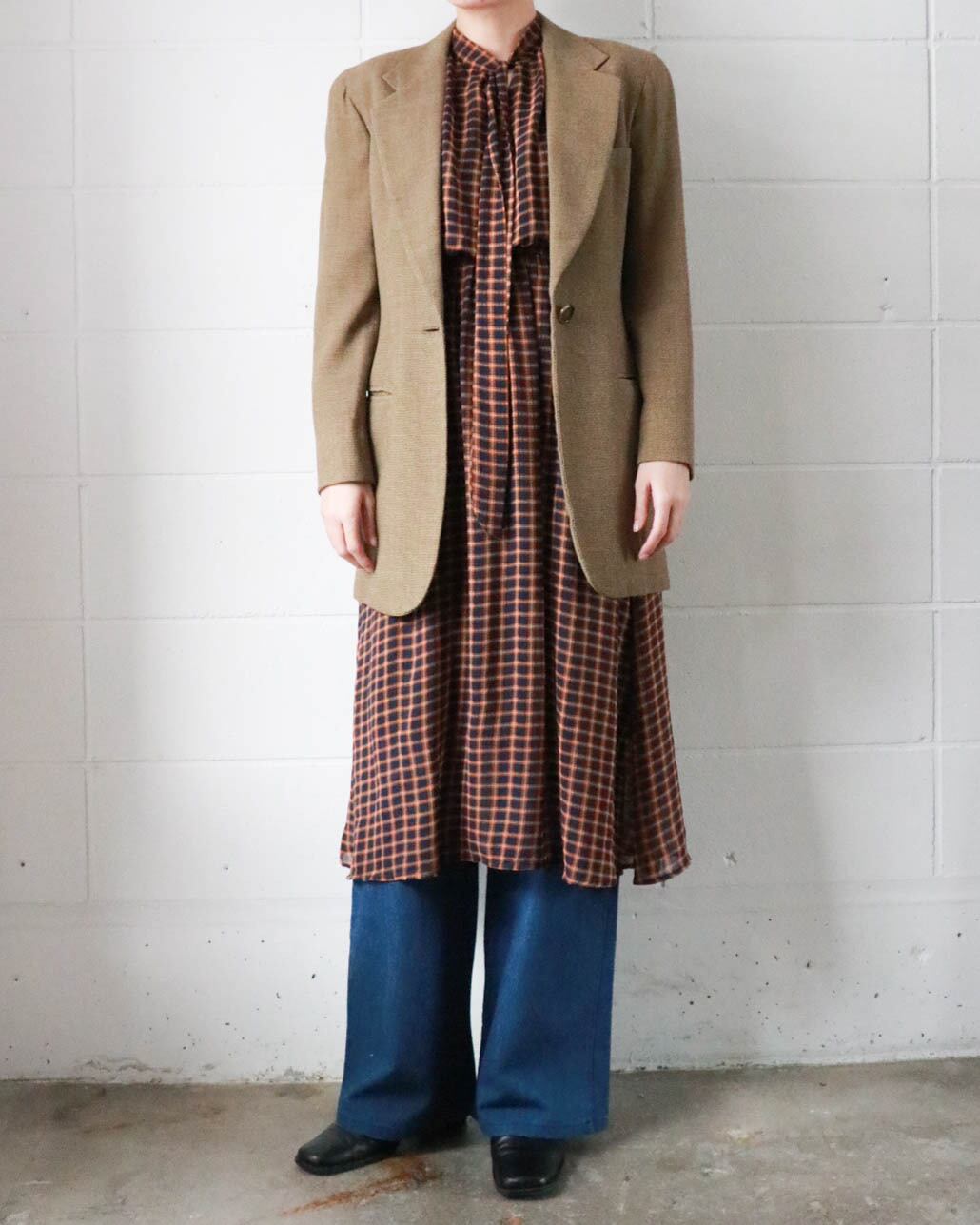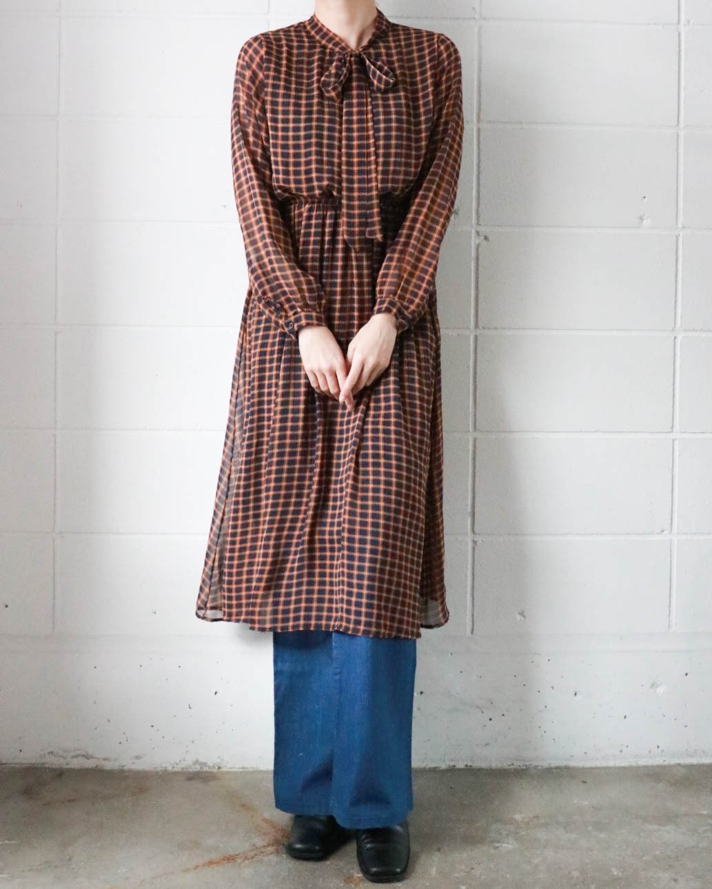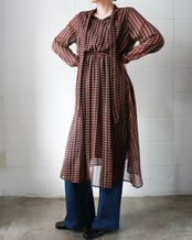 クラシカルなチェック柄に、ほんのり透け感のある軽やかな素材。首元のボウタイが、甘さを添えつつ全体を凛と引き締めてくれる1着です。