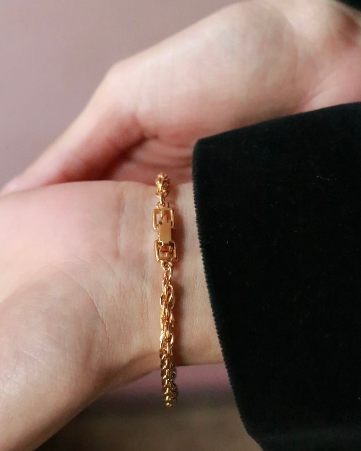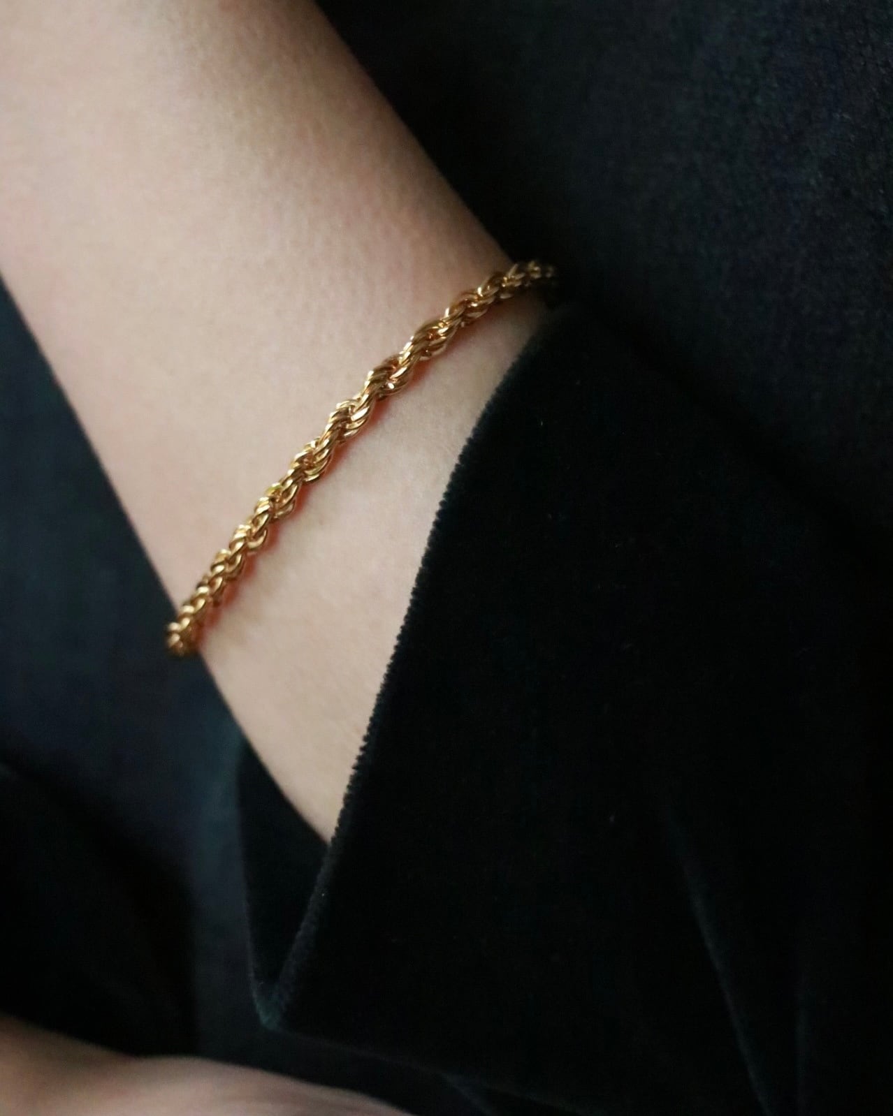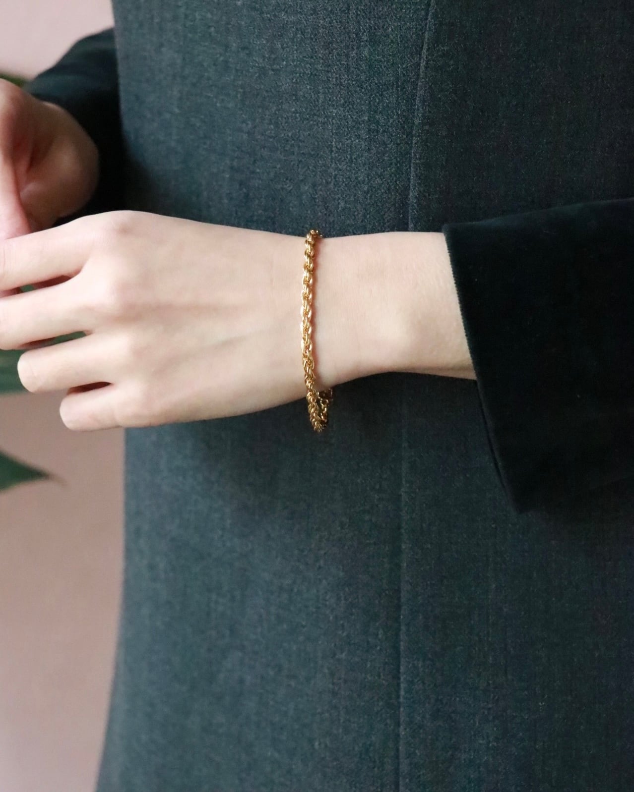 一本でもサマになる存在感の太さですが、時計や手持ちのブレスレットと重ねても煌めくツイストチェーンが手元に華やぎを添えてくれる。