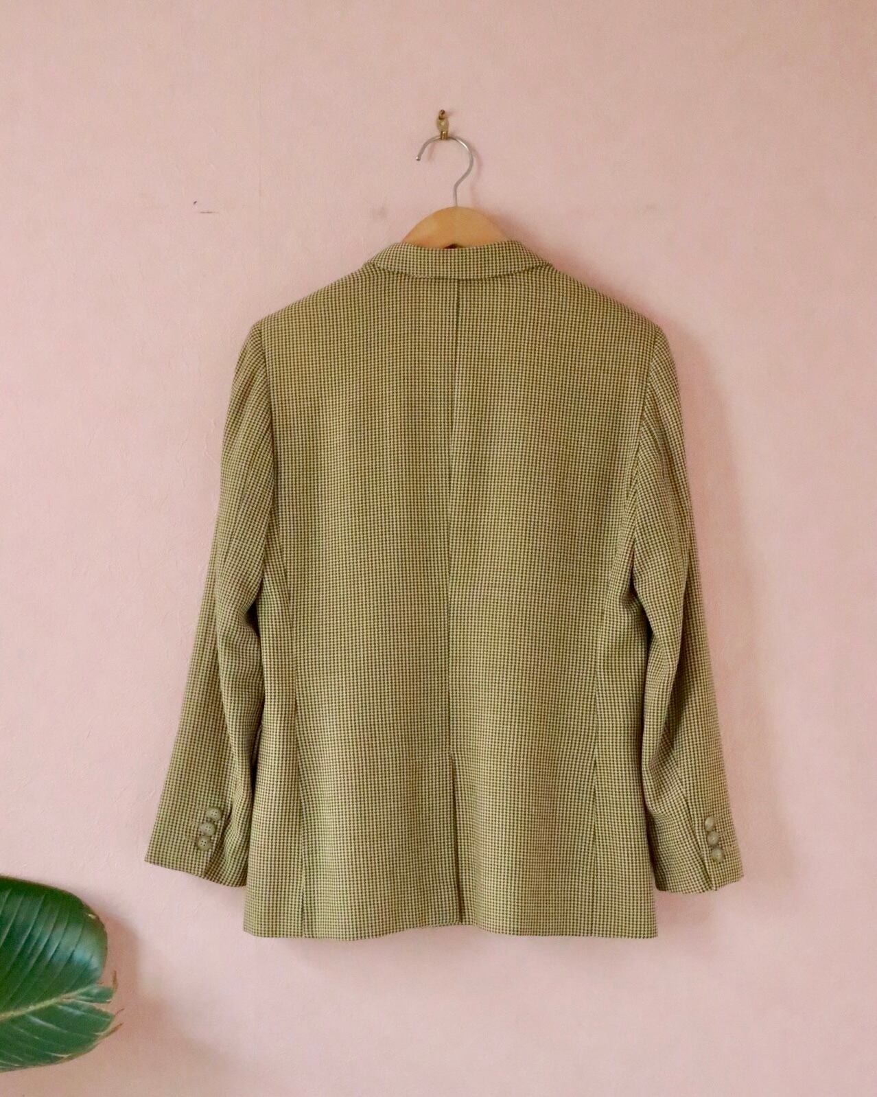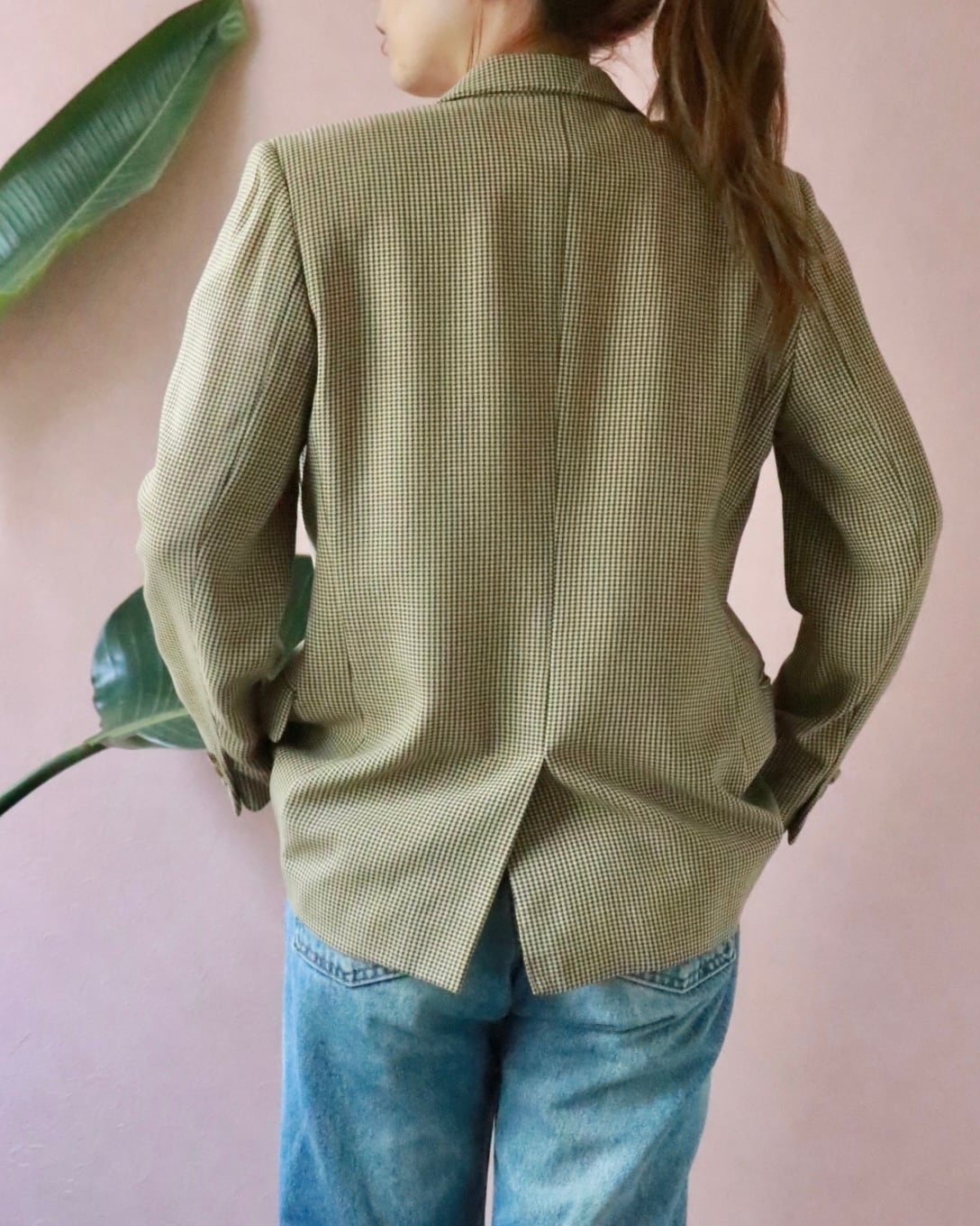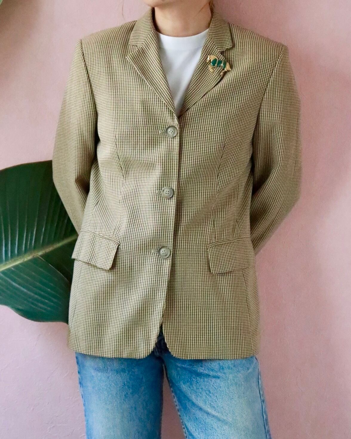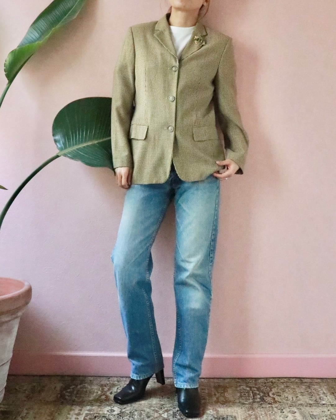 ベージュ×ブラウンの組み合わせがクラシックながらもカジュアル寄りで、インナーを選ばずコーディネートを楽しめます。薄手のウール素材で、これから春に向けて大活躍するライトジャケット。写真の様にデニム&ブラウスやTシャツに合わせて春ファッションを先取りください♡