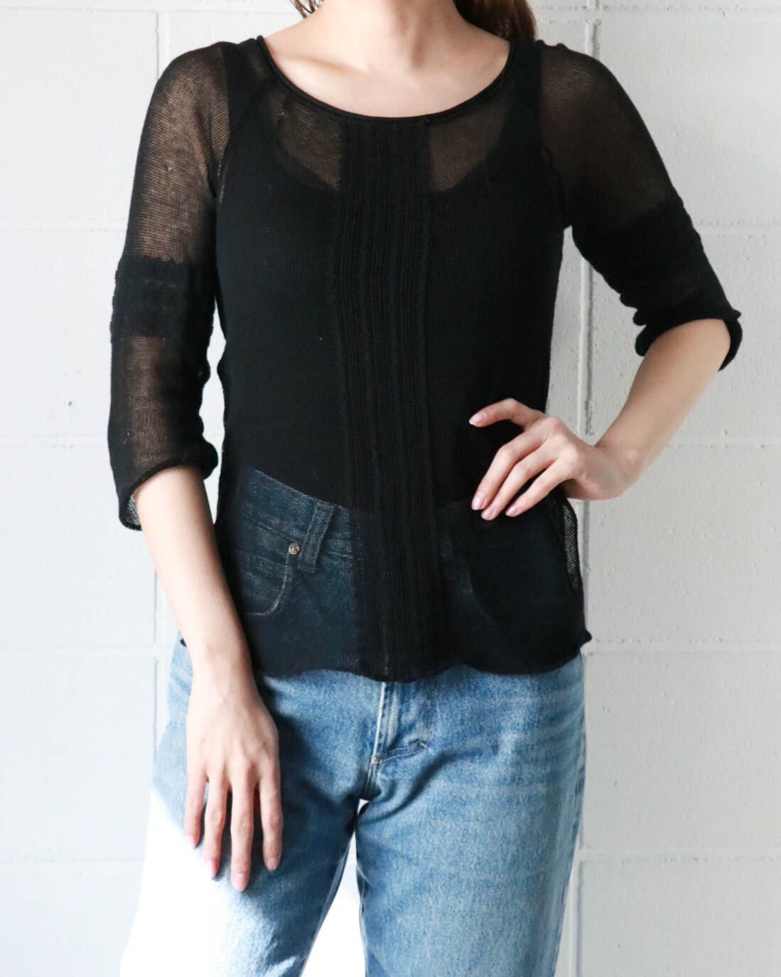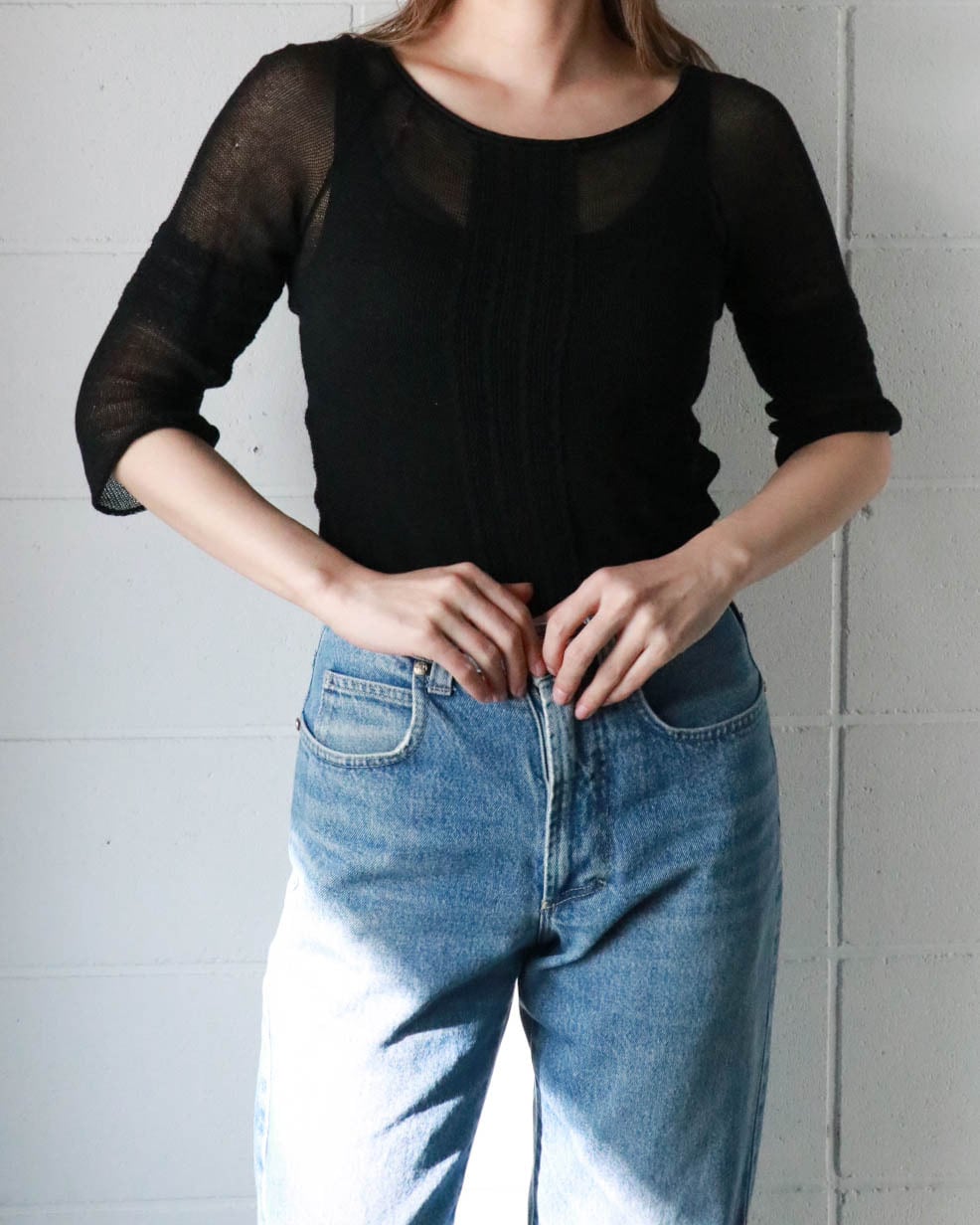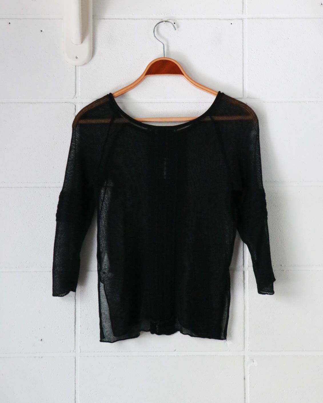 メッシュのブラックトップスはマックスアンドコーのもの。両側裾にスリットが入ったすっきりとしたボディーにストレッチの効いた着心地の良さ、バランスがとても良いカジュアルなトップス。重ね着も楽しめるので重視します。