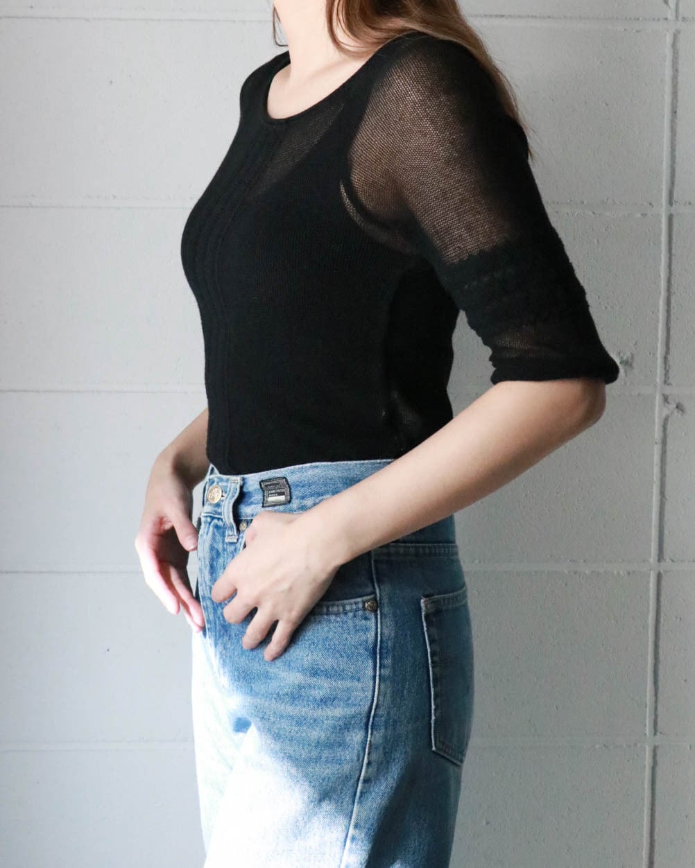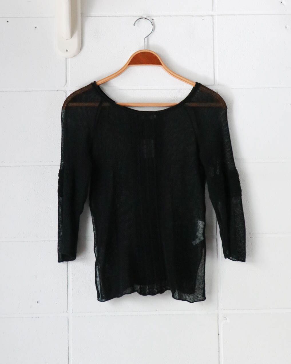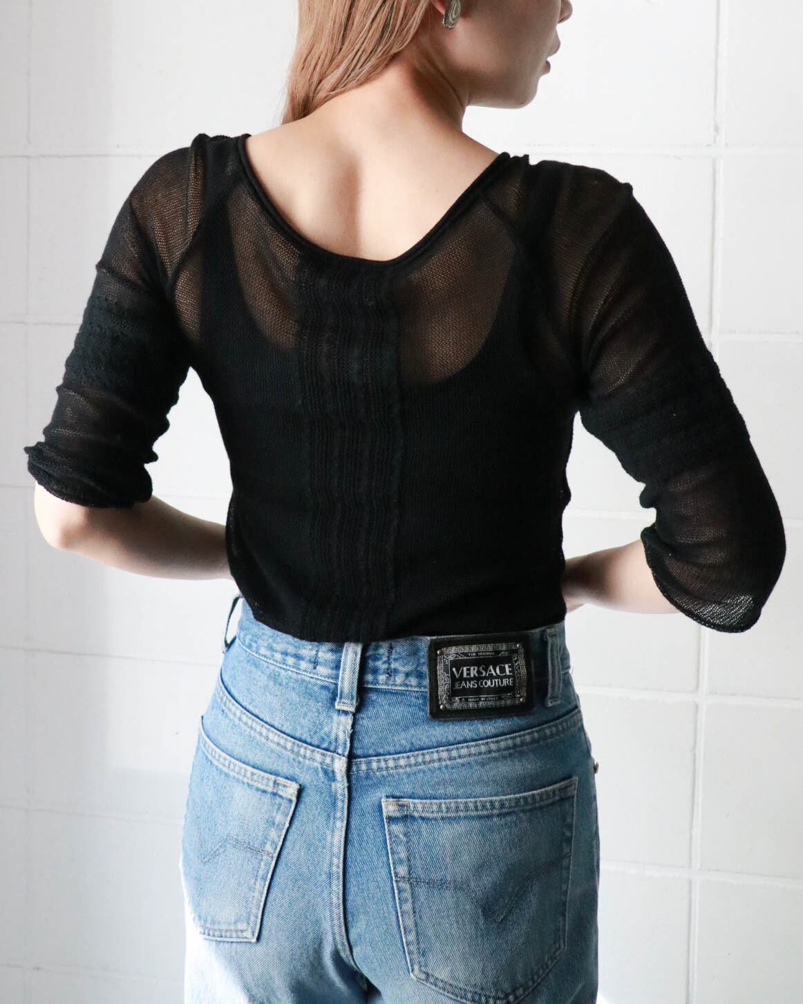 メッシュのブラックトップスはマックスアンドコーのもの。両側裾にスリットが入ったすっきりとしたボディーにストレッチの効いた着心地の良さ、バランスがとても良いカジュアルなトップス。重ね着も楽しめるので重視します。