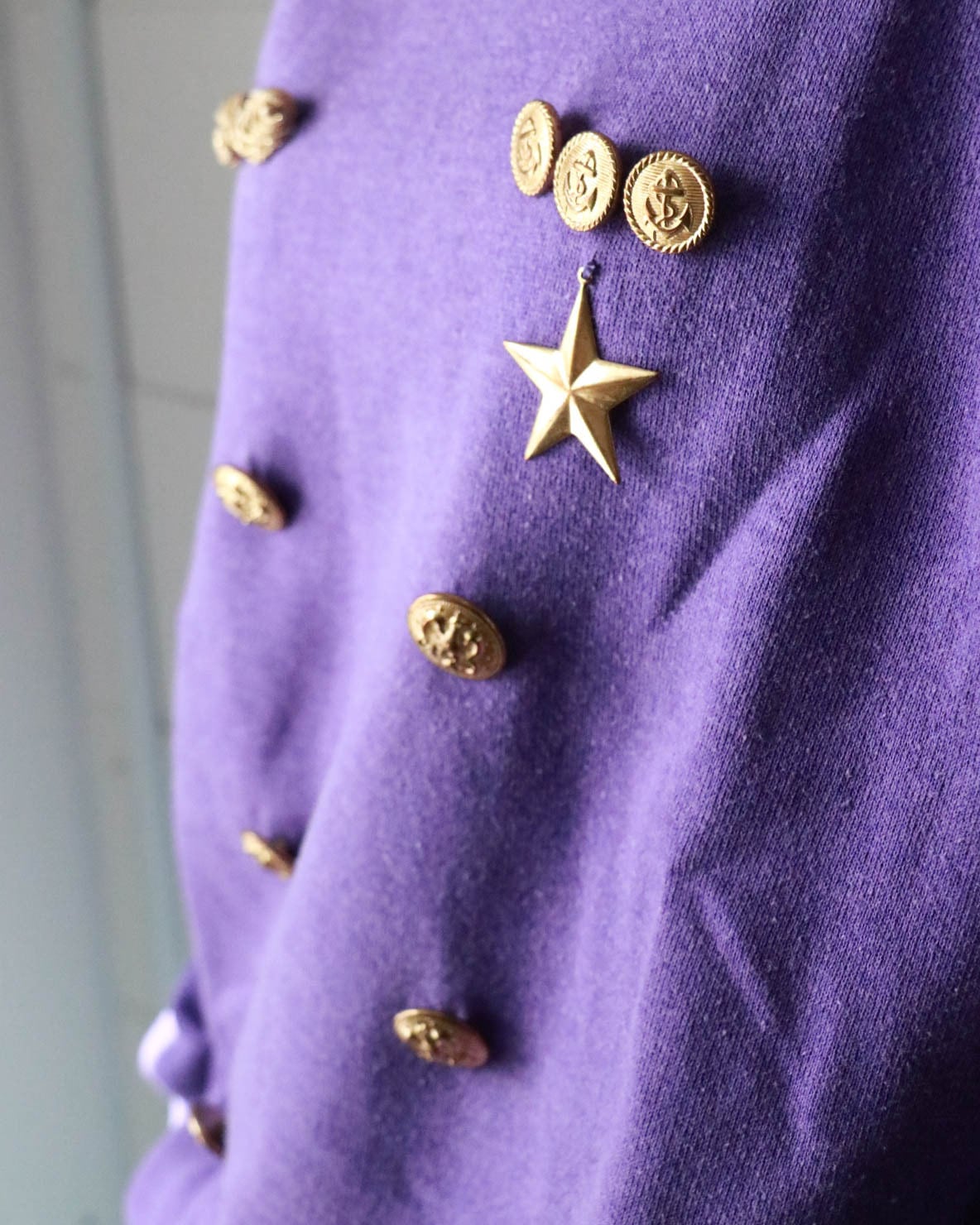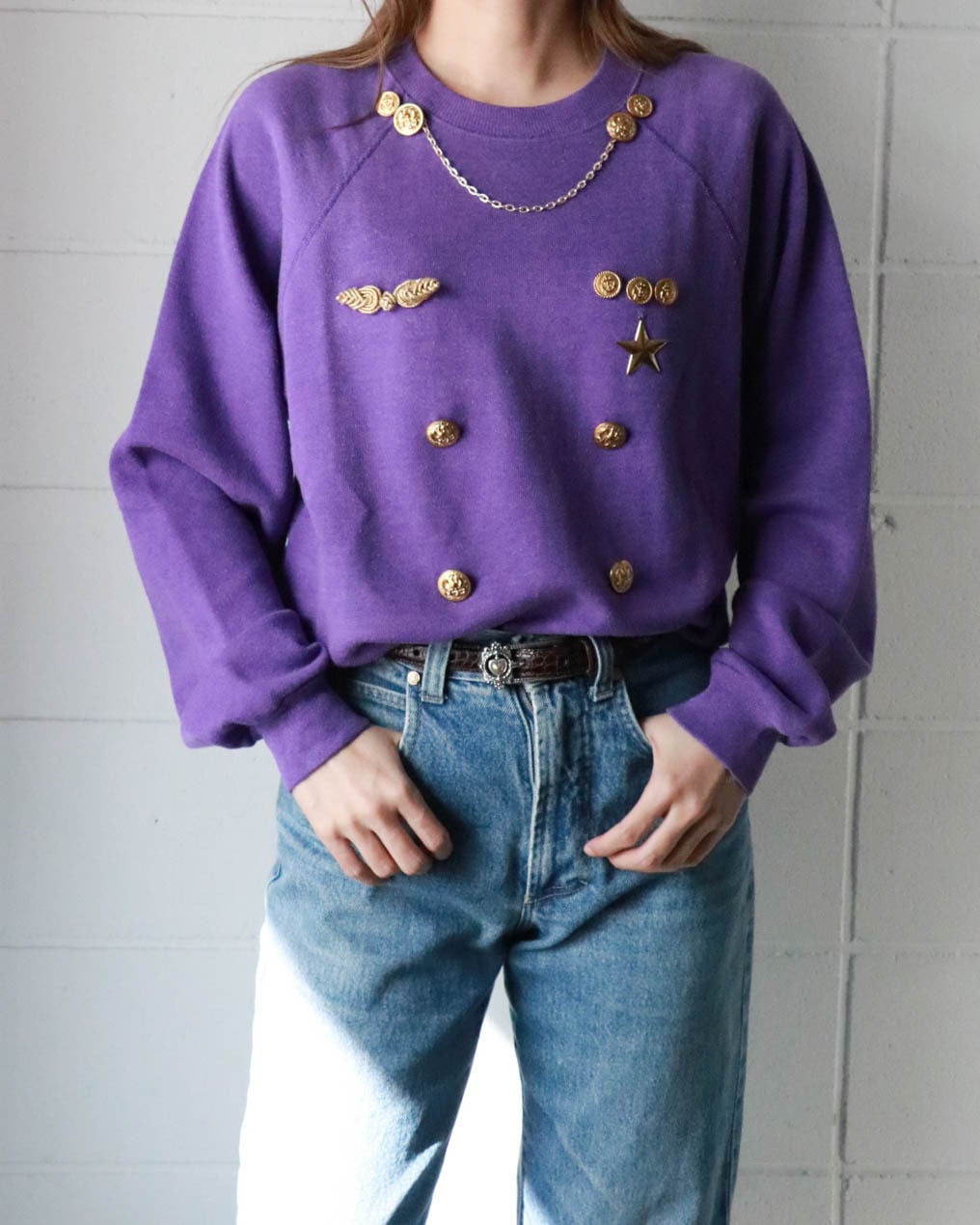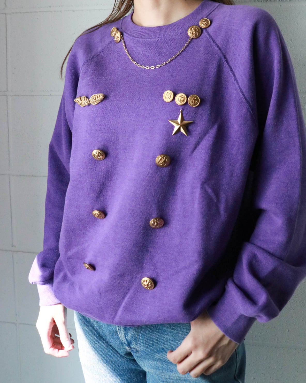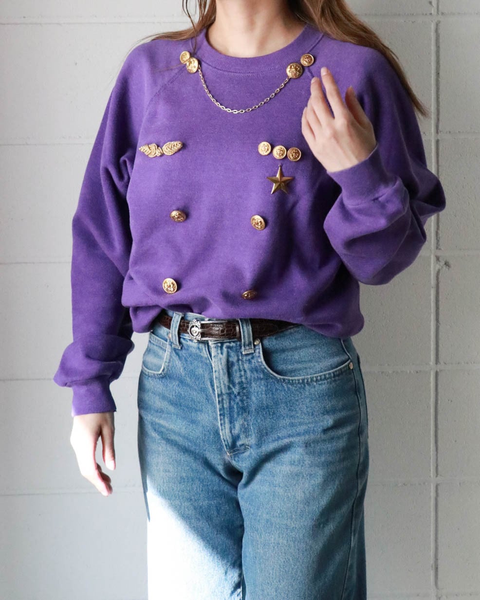 目を惹くパープルにクラシカルなゴールドモチーフ。ボタンやチェーン、スターモチーフがまるでジュエリーのように散りばめられた特別感のあるデザインスウェット。ラフなスウェット素材なのに、どこかドレッシー。デニムにさらっと合わせるだけで、スタイリングが完成する1着です。