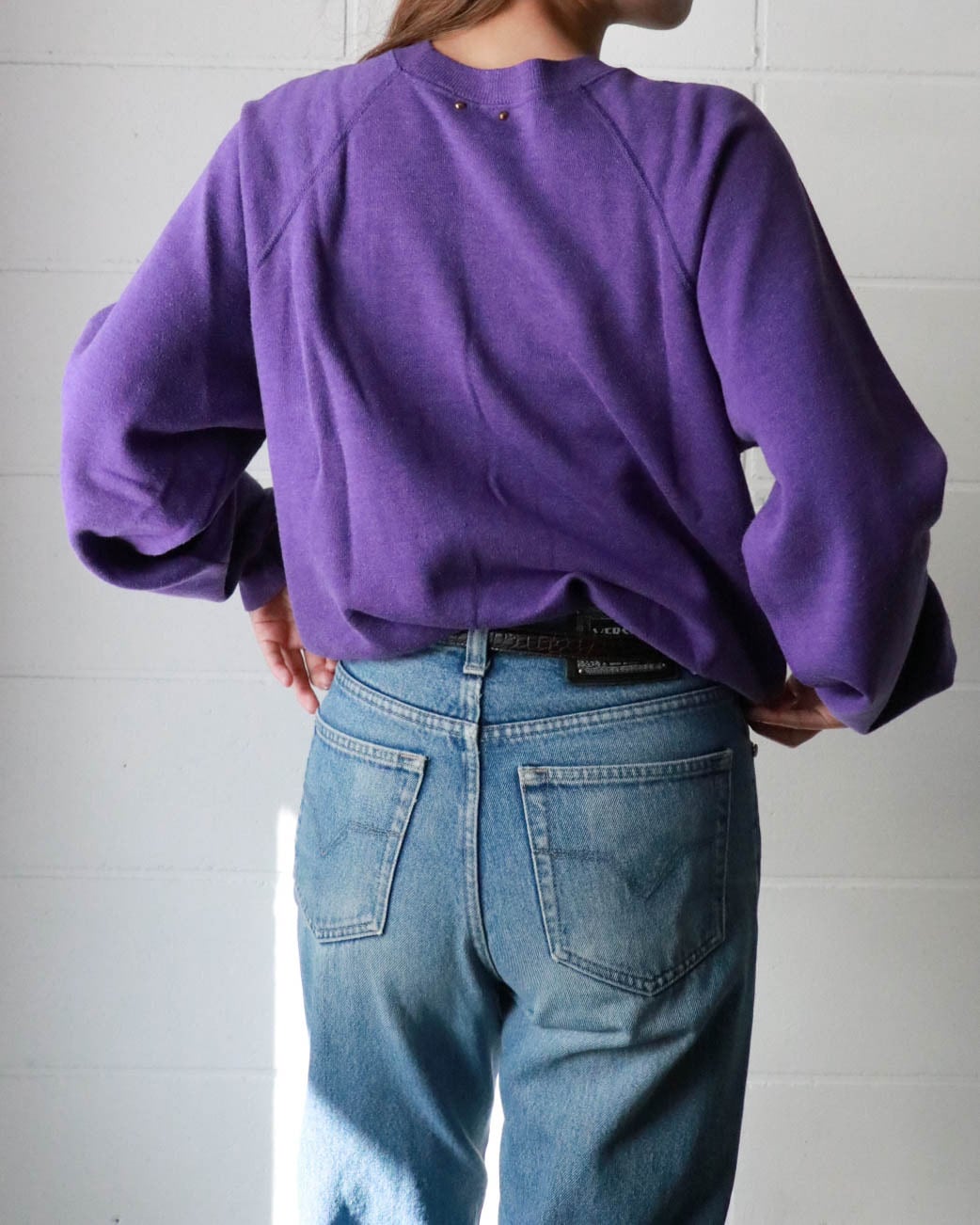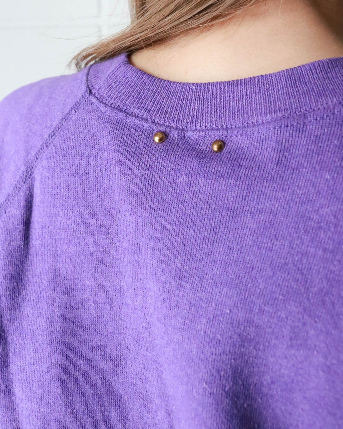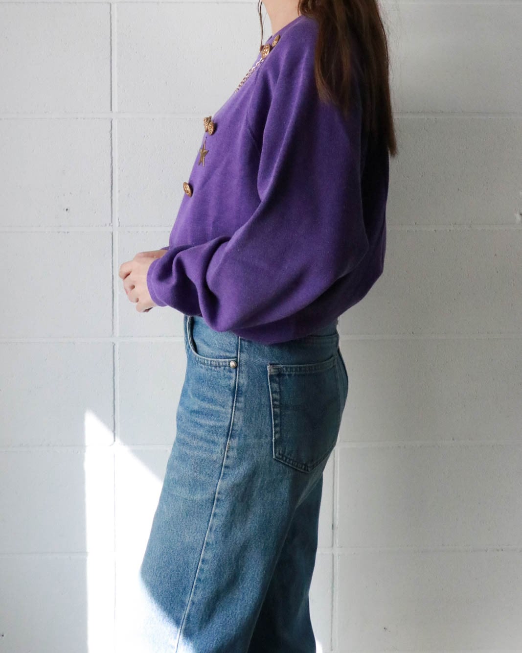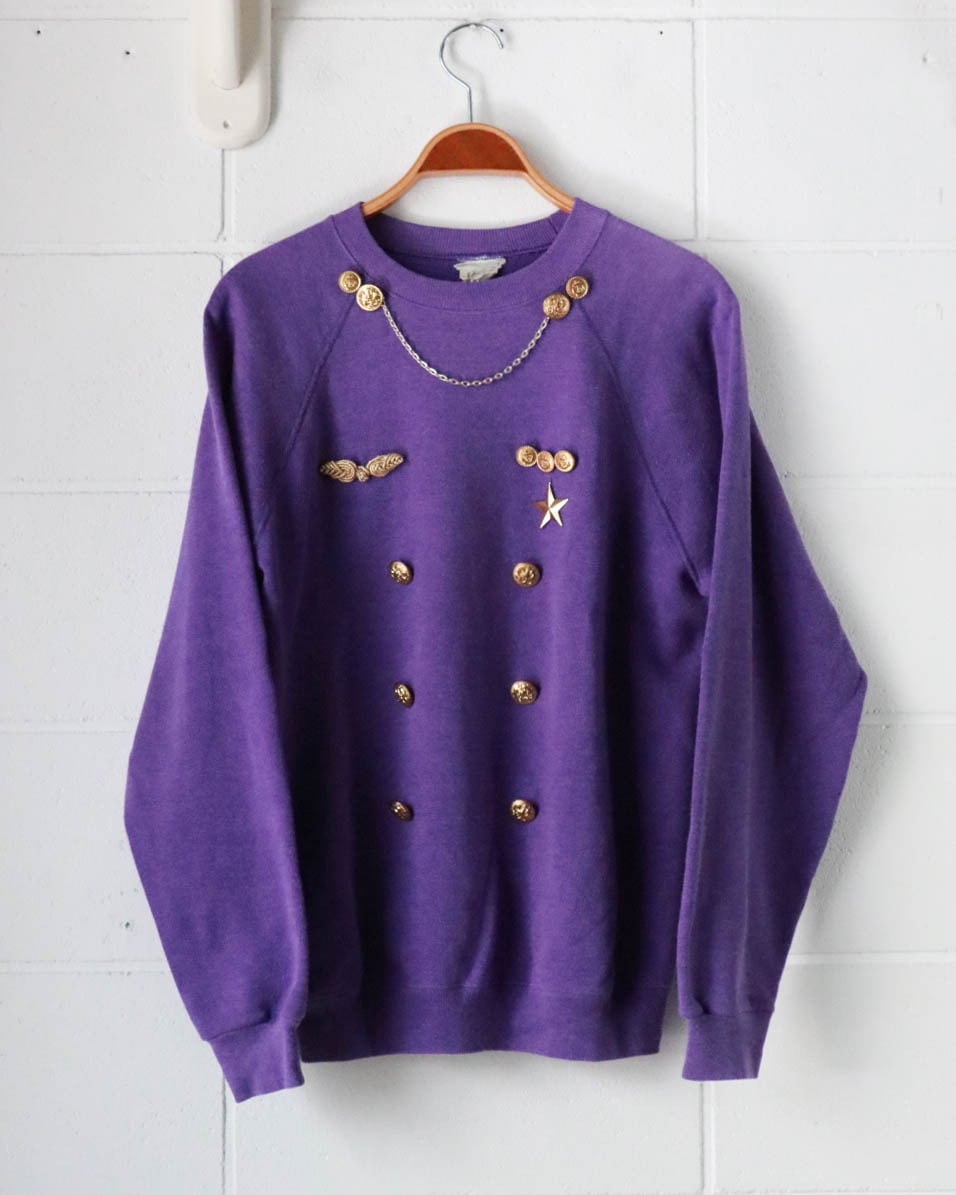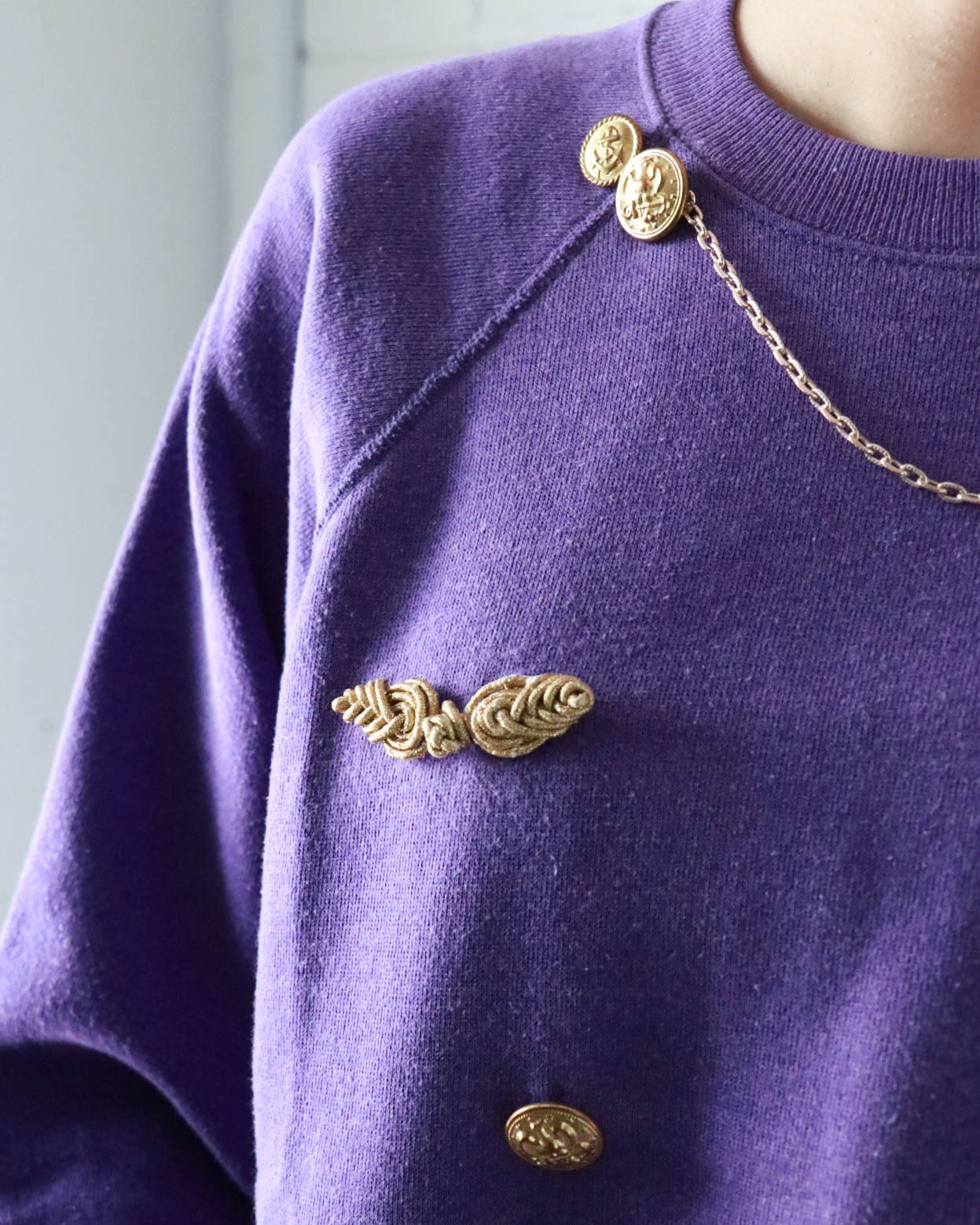 目を惹くパープルにクラシカルなゴールドモチーフ。ボタンやチェーン、スターモチーフがまるでジュエリーのように散りばめられた特別感のあるデザインスウェット。ラフなスウェット素材なのに、どこかドレッシー。デニムにさらっと合わせるだけで、スタイリングが完成する1着です。