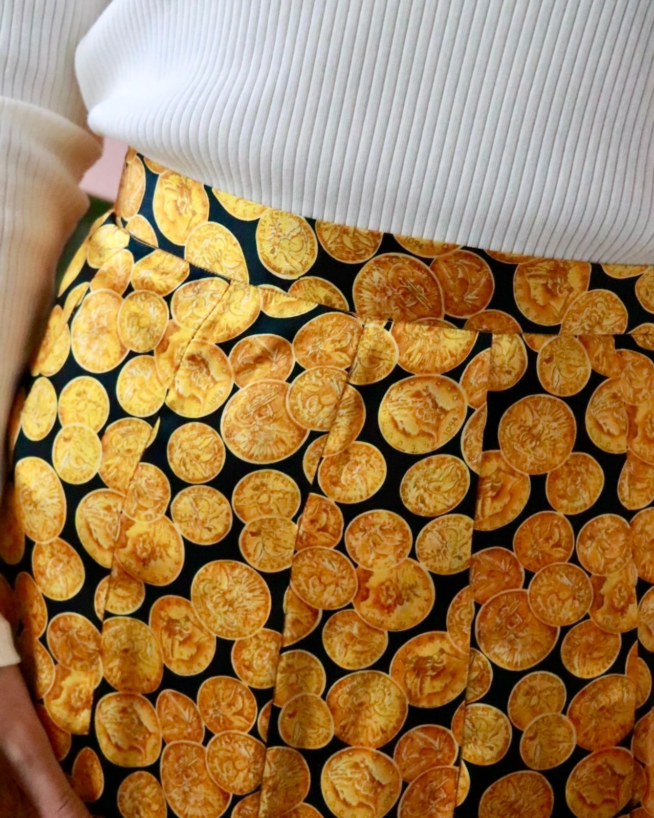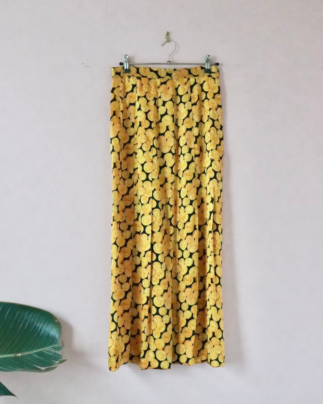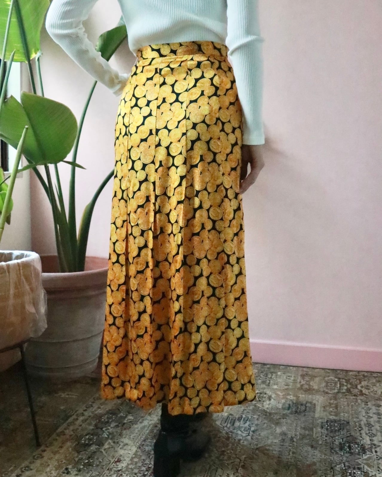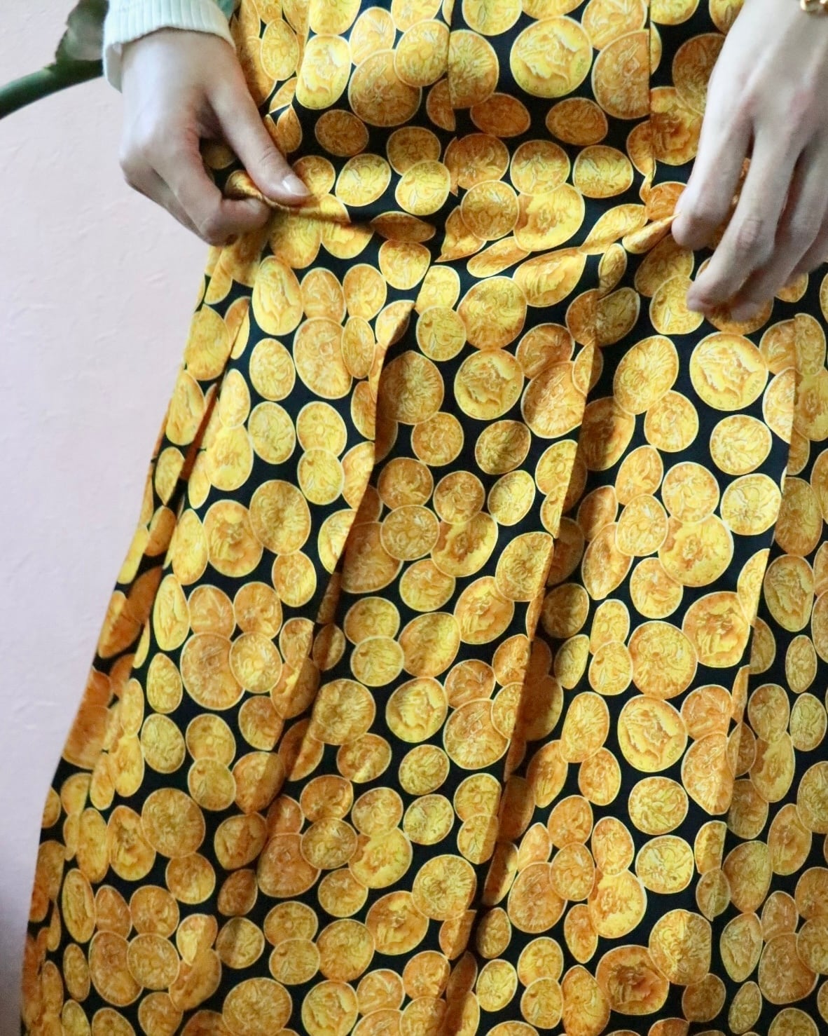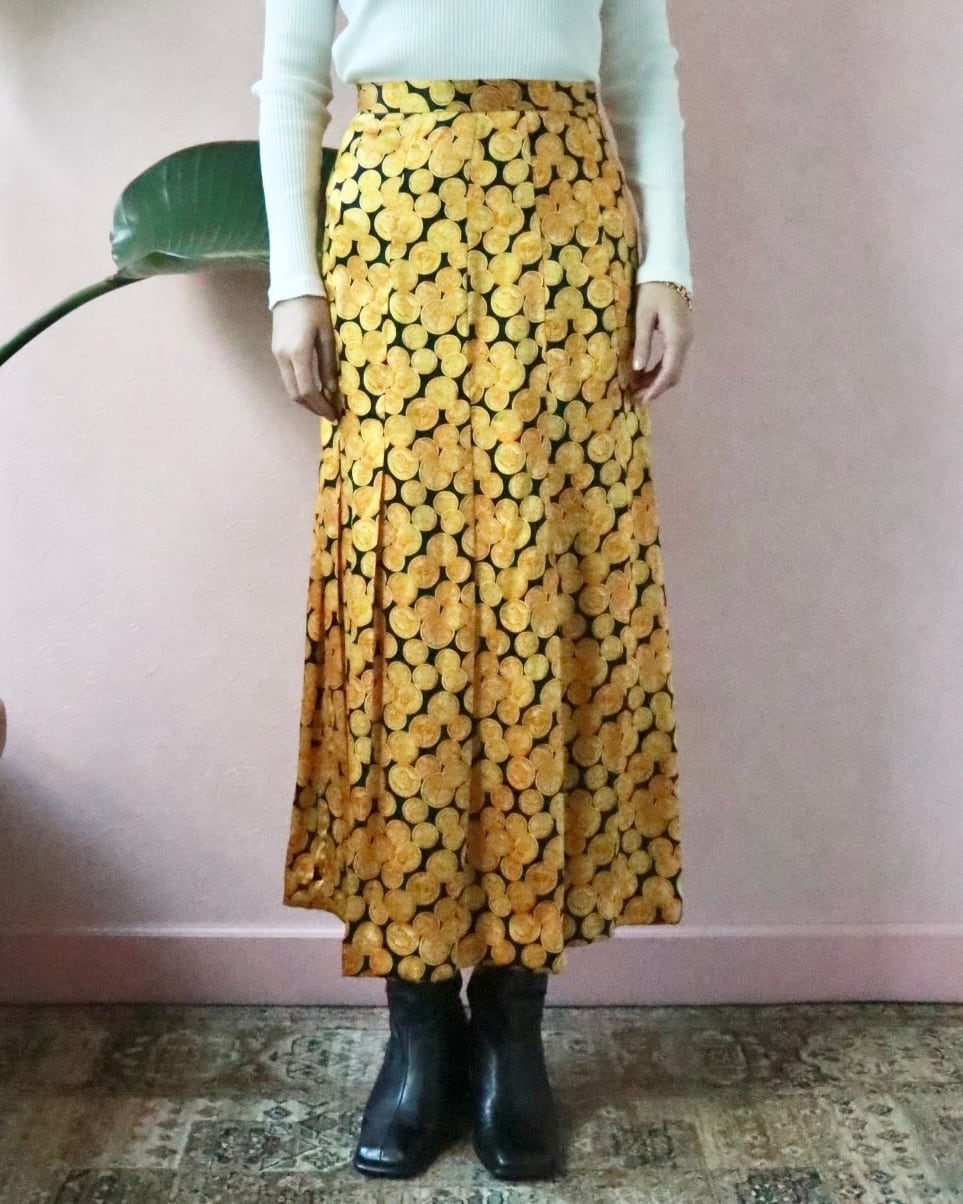 シルク100%のしなやかな質感に、ゴールドのコインモチーフが前面に広がる、インパクトある一枚。主張がしっかりとありますが不思議と品がある一枚。歩くたびにフワッと揺れて、気分を上げてくれるスカート。裏地がないのでレイヤードスタイルも楽しめます。