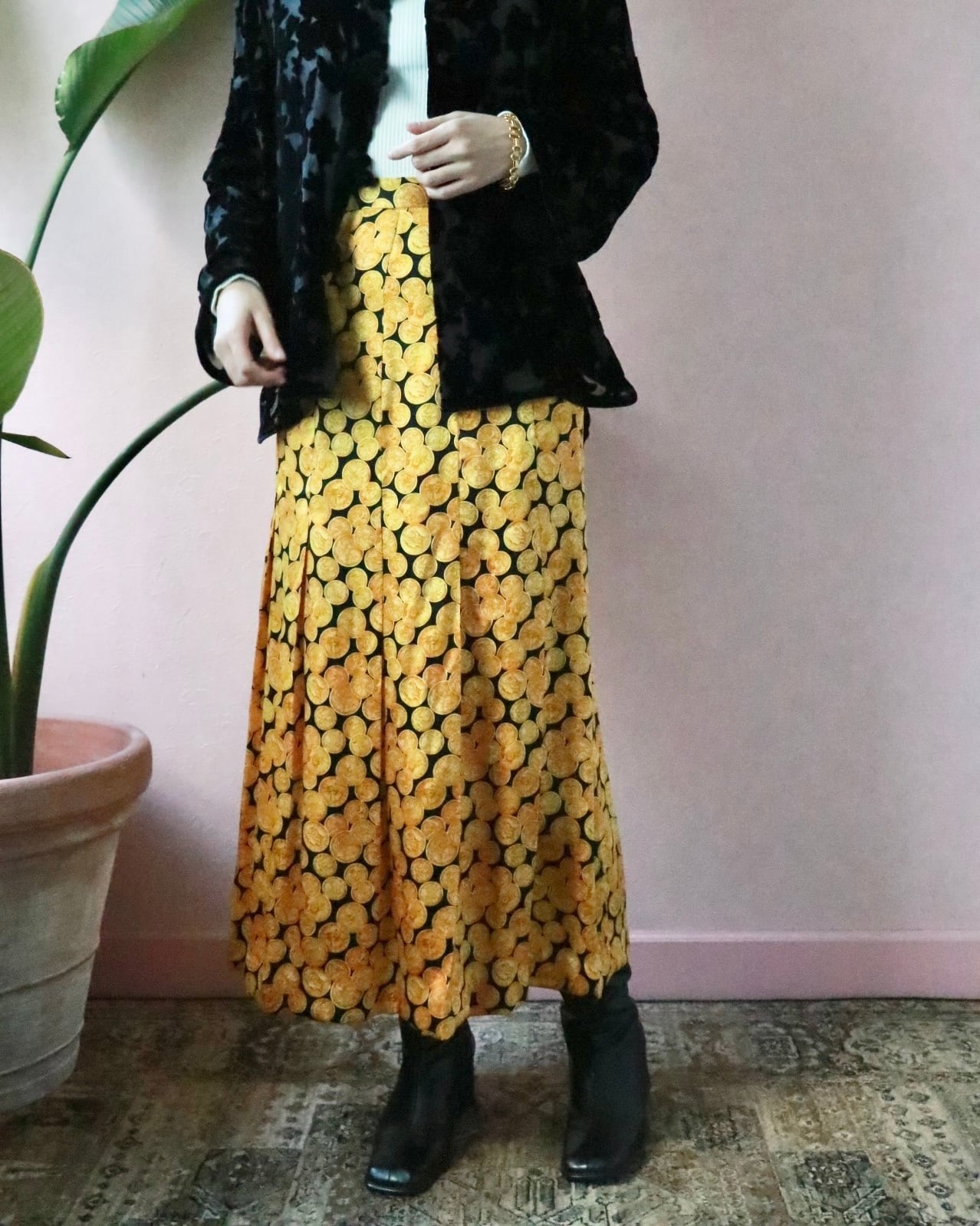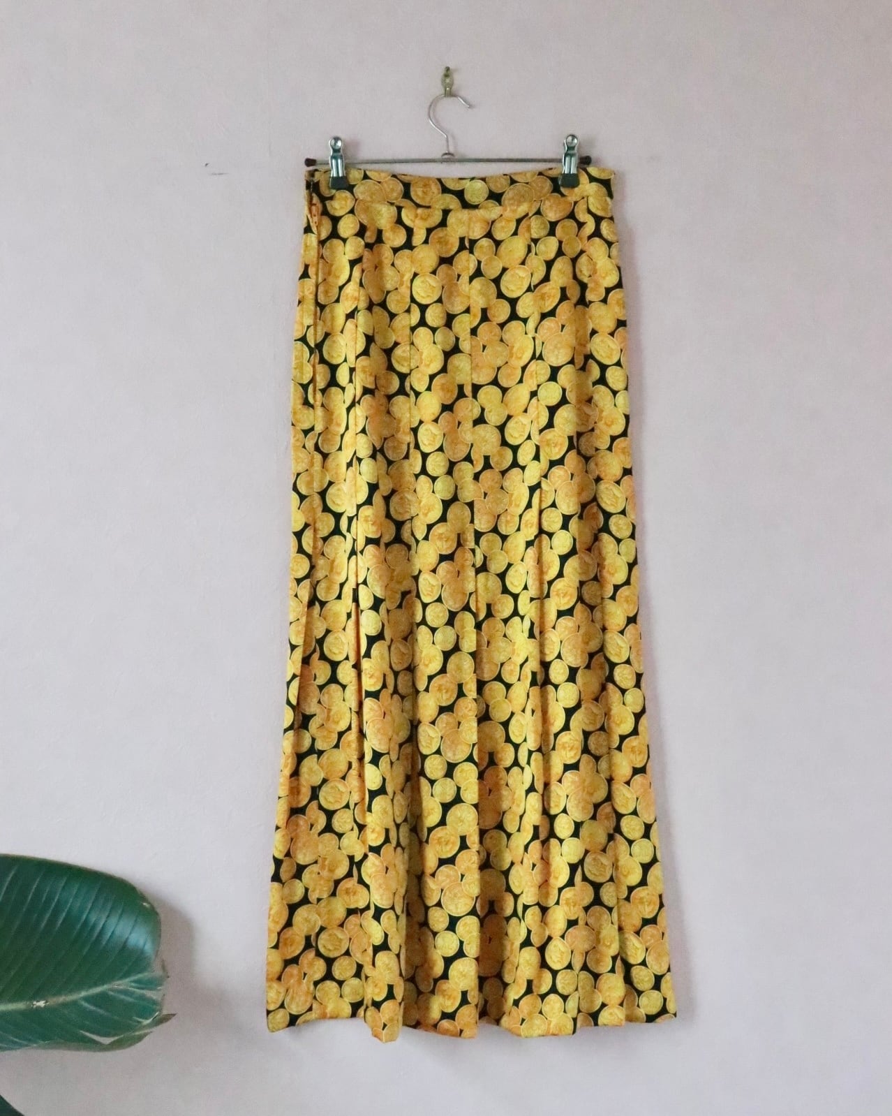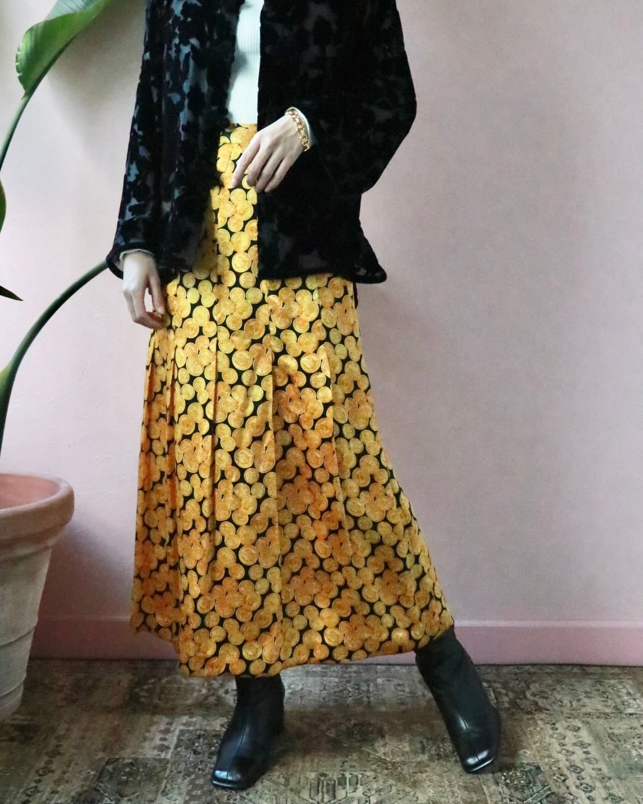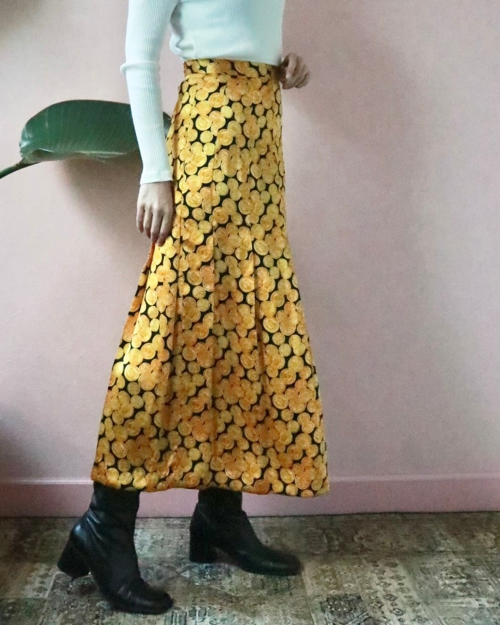 シルク100%のしなやかな質感に、ゴールドのコインモチーフが前面に広がる、インパクトある一枚。主張がしっかりとありますが不思議と品がある一枚。歩くたびにフワッと揺れて、気分を上げてくれるスカート。裏地がないのでレイヤードスタイルも楽しめます。