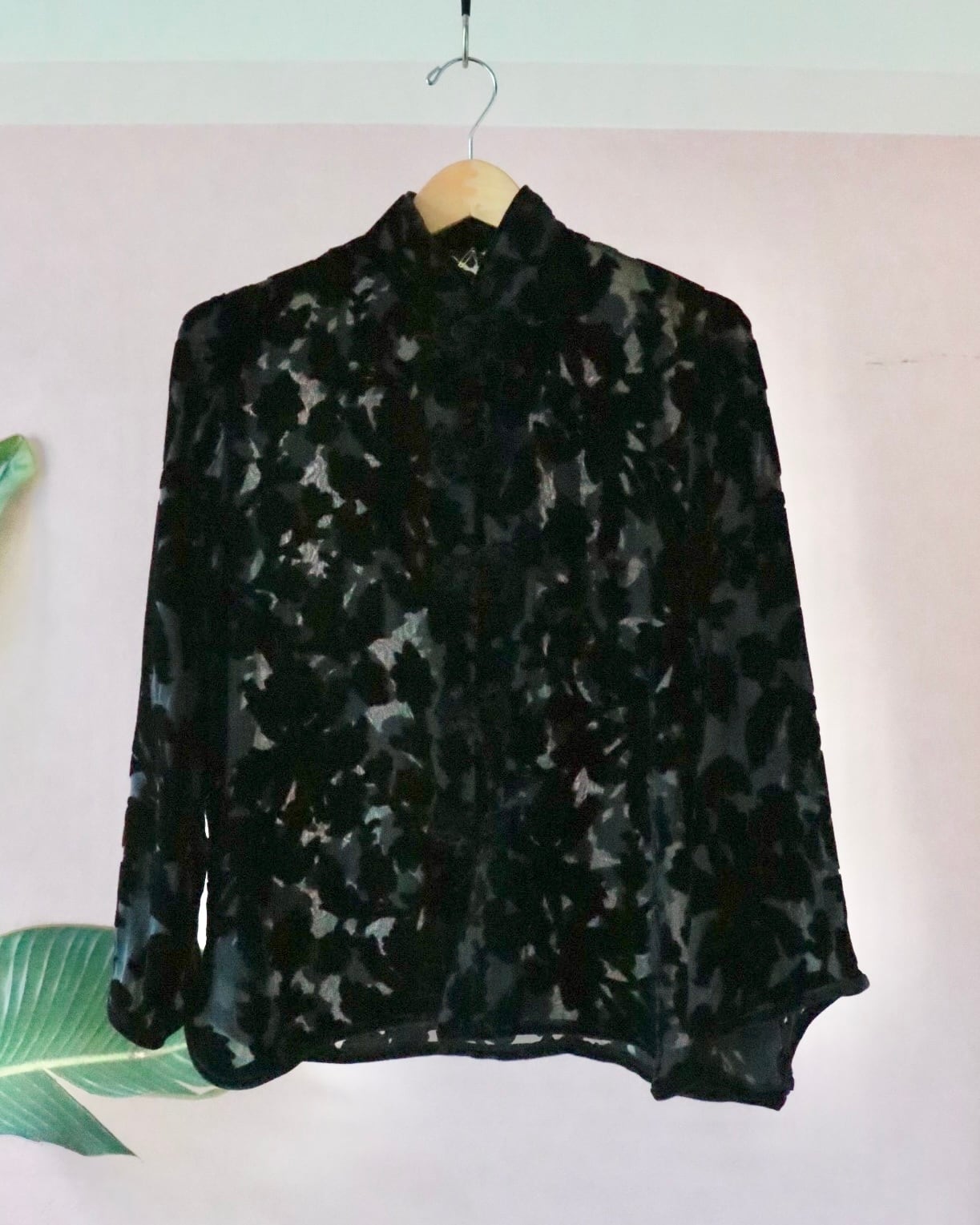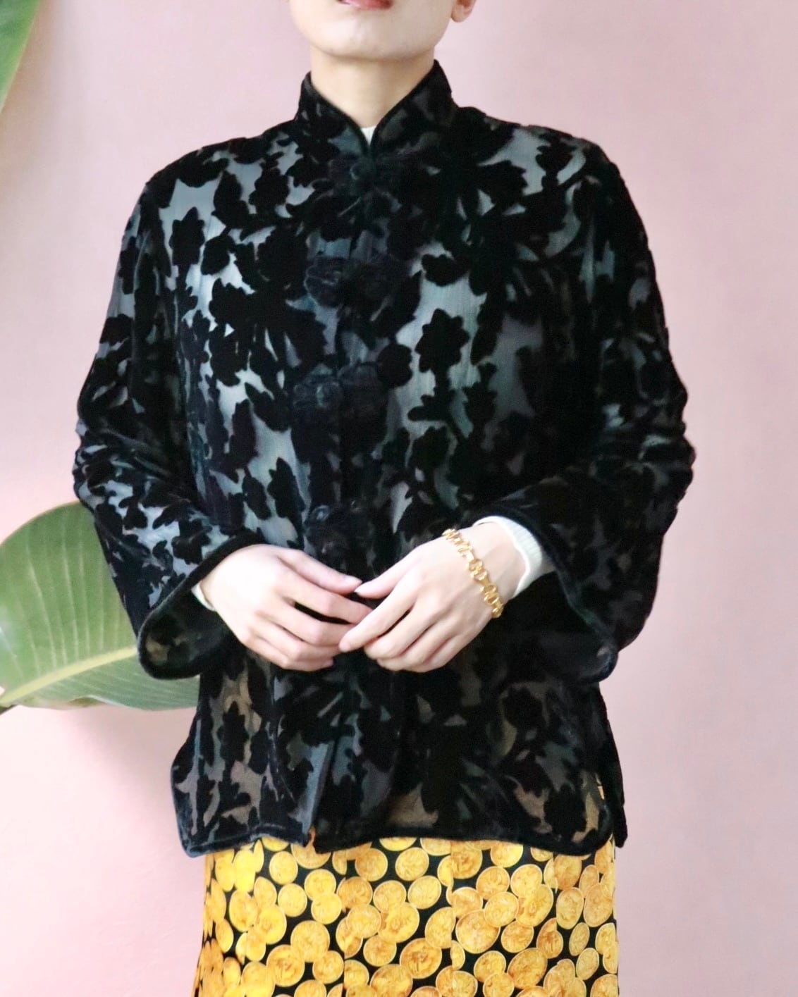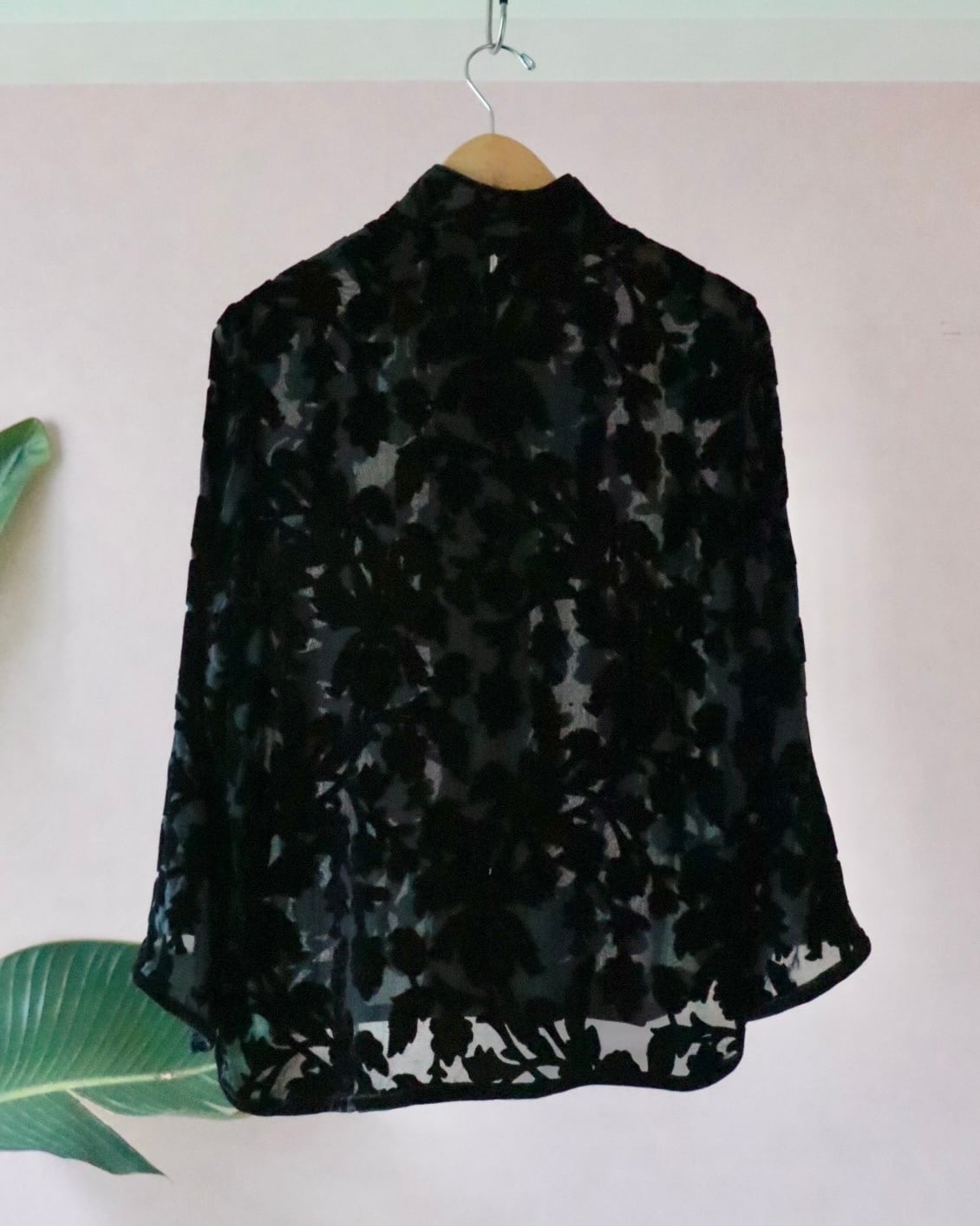 シアーなブラックに浮かぶベルベット調のフロッキーパターン。