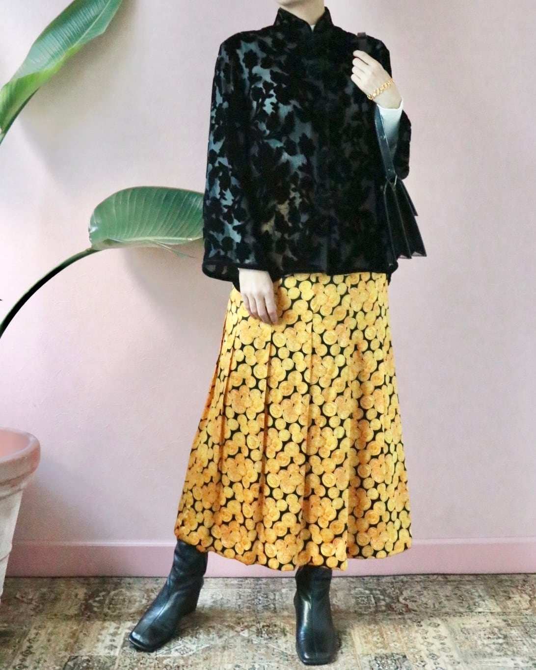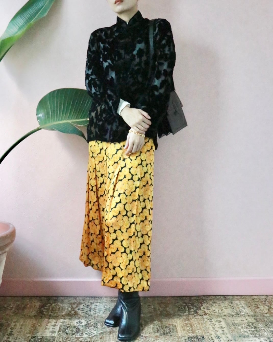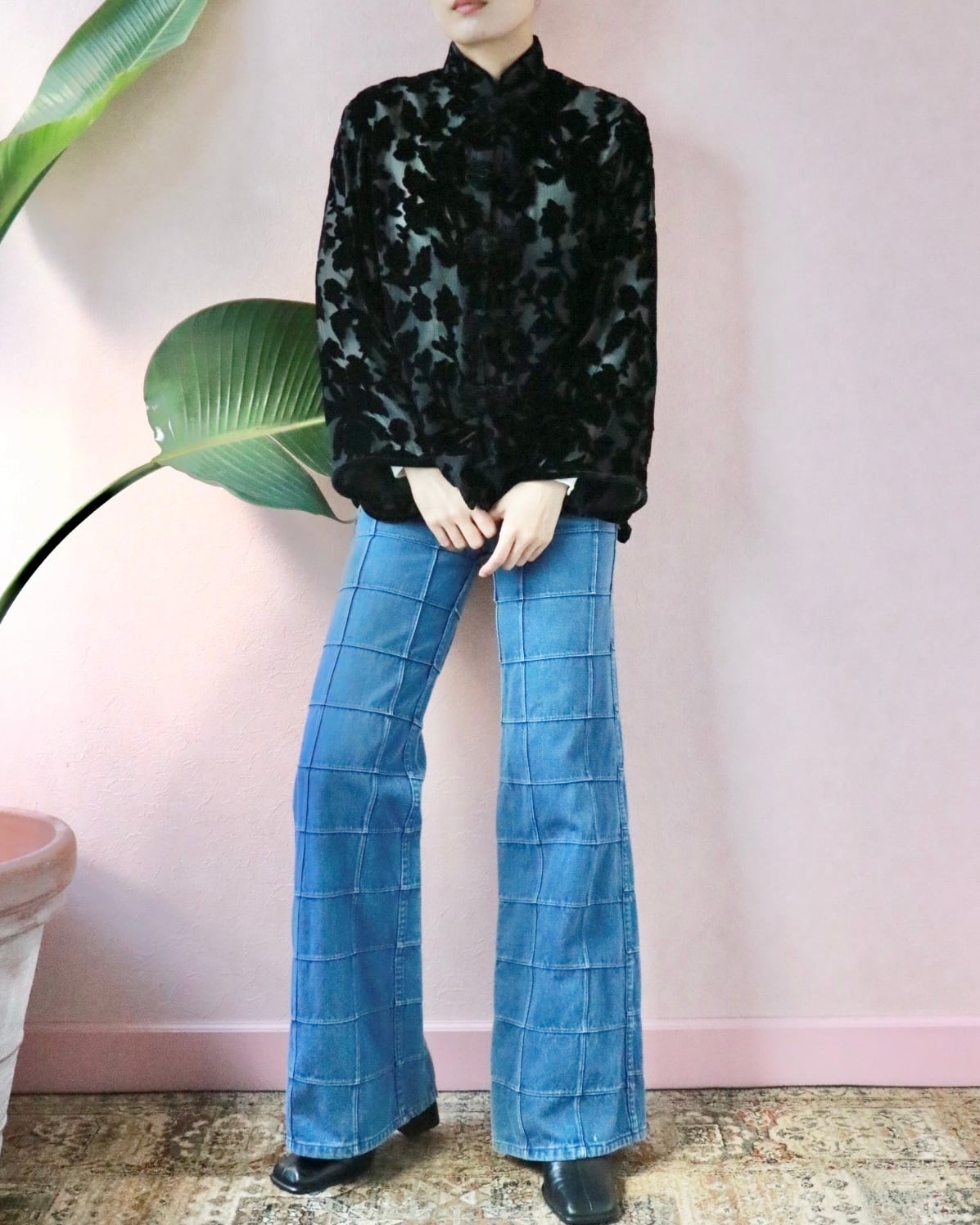 シアーなブラックに浮かぶベルベット調のフロッキーパターン。