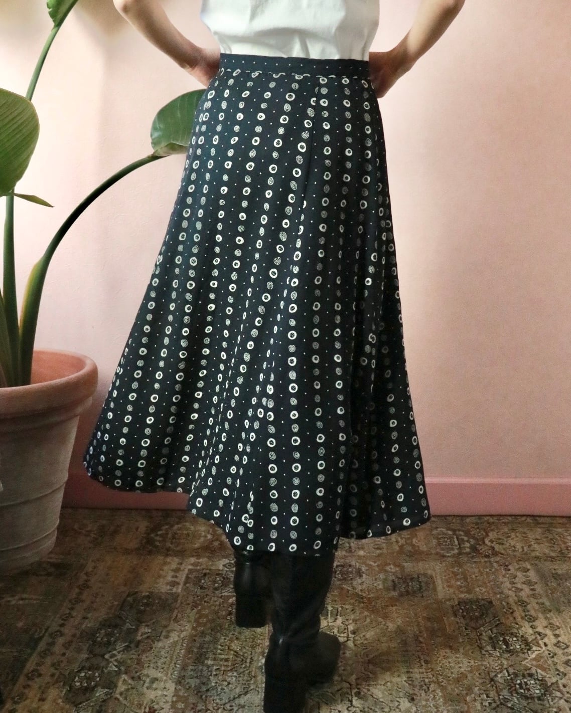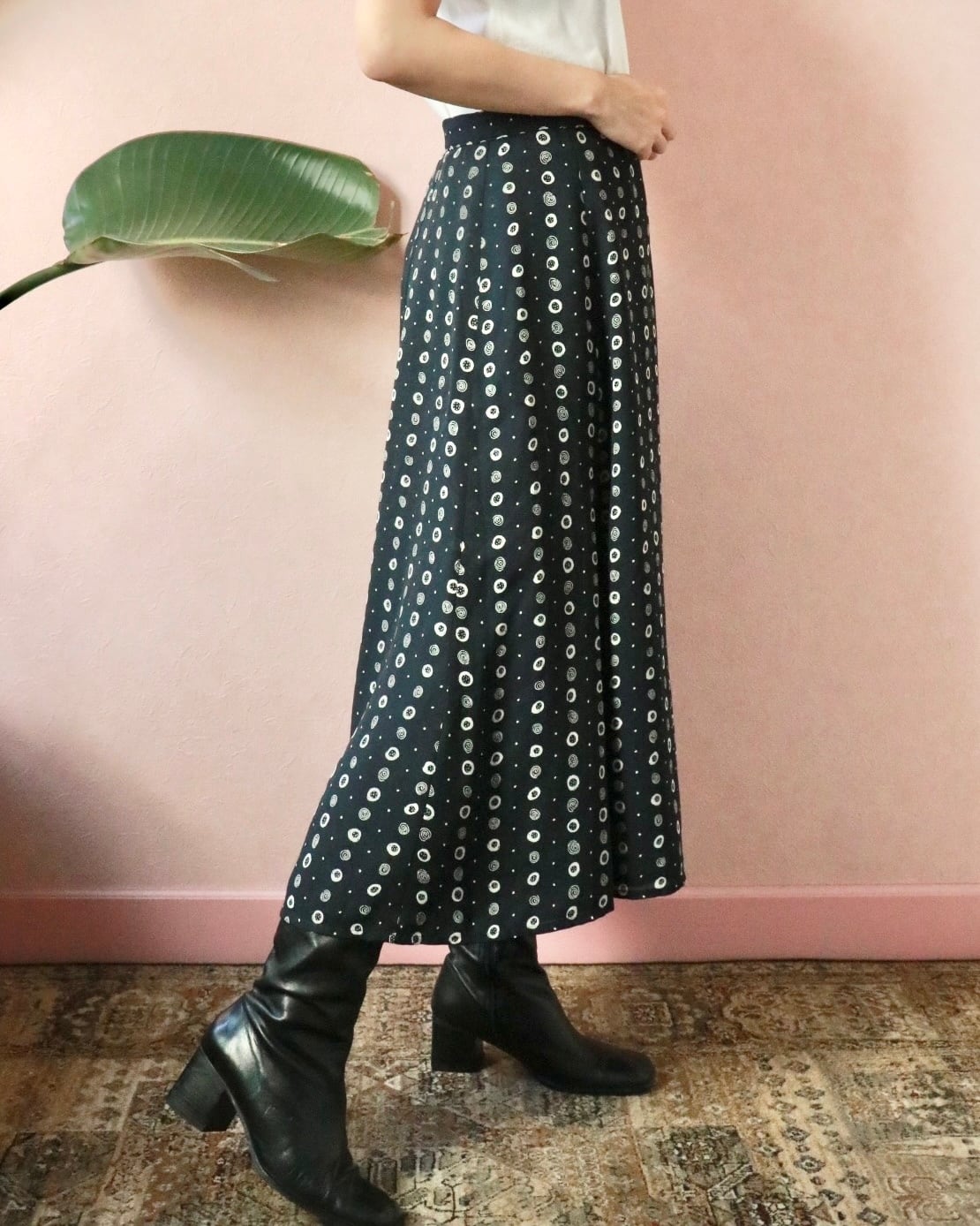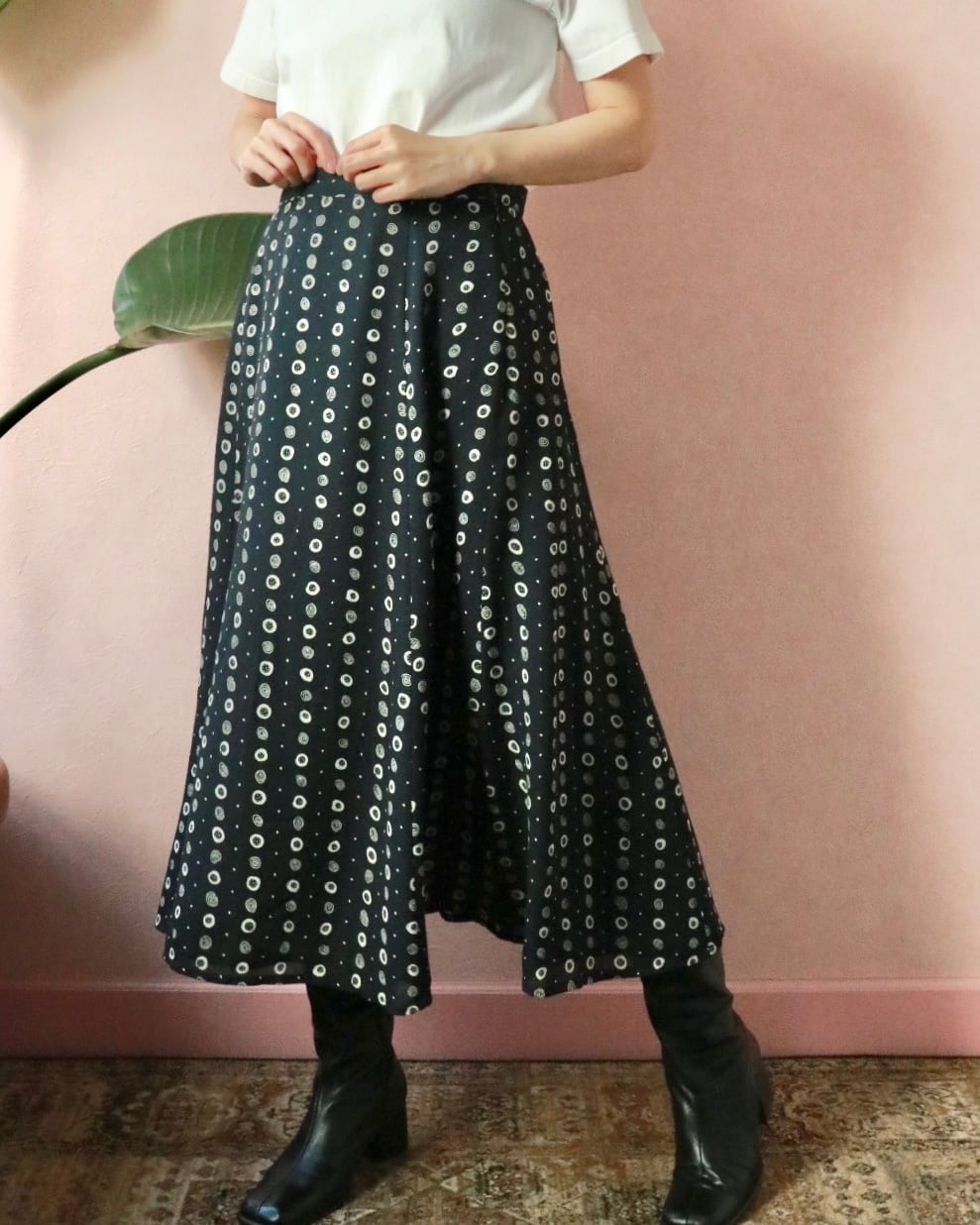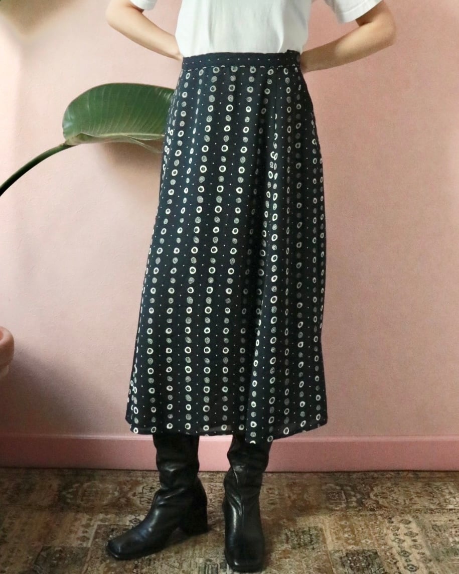ネイビーベースにホワイトのドット柄のよう模様、Aラインの美シルエットスカートは動くたびに残香を感じられるような優雅な一着。透け感もなく全体的に裏地が付いた年中使える素材感ですが、夏はカジュアルなTシャツやキャミソールと合わせても品よくまとまります。