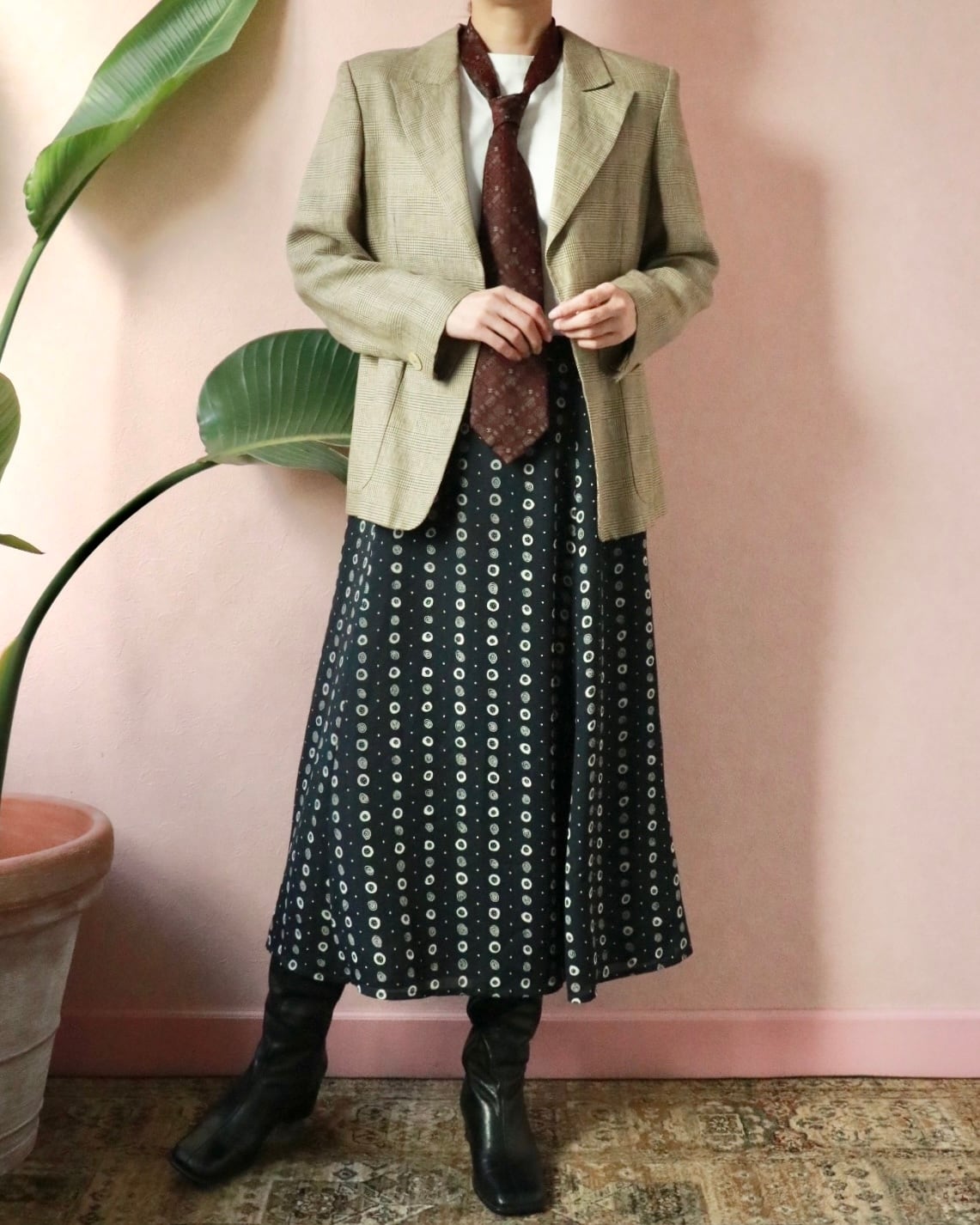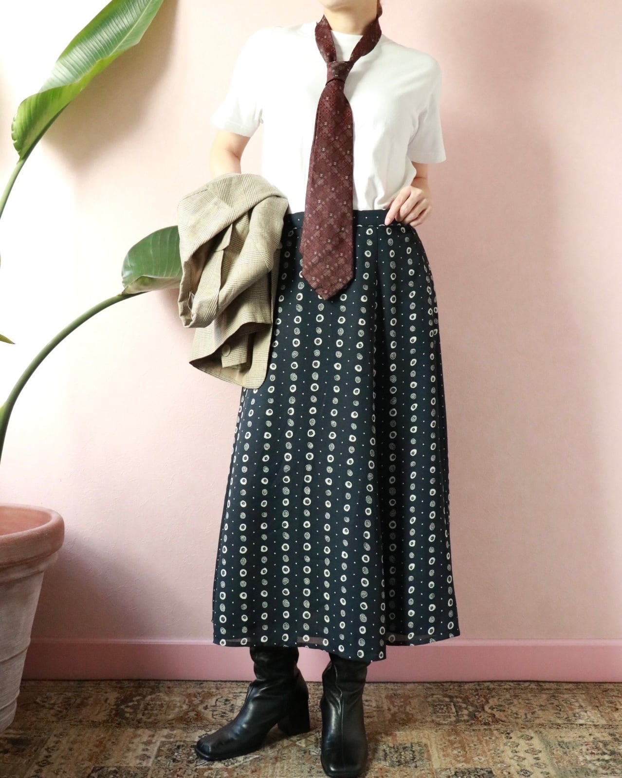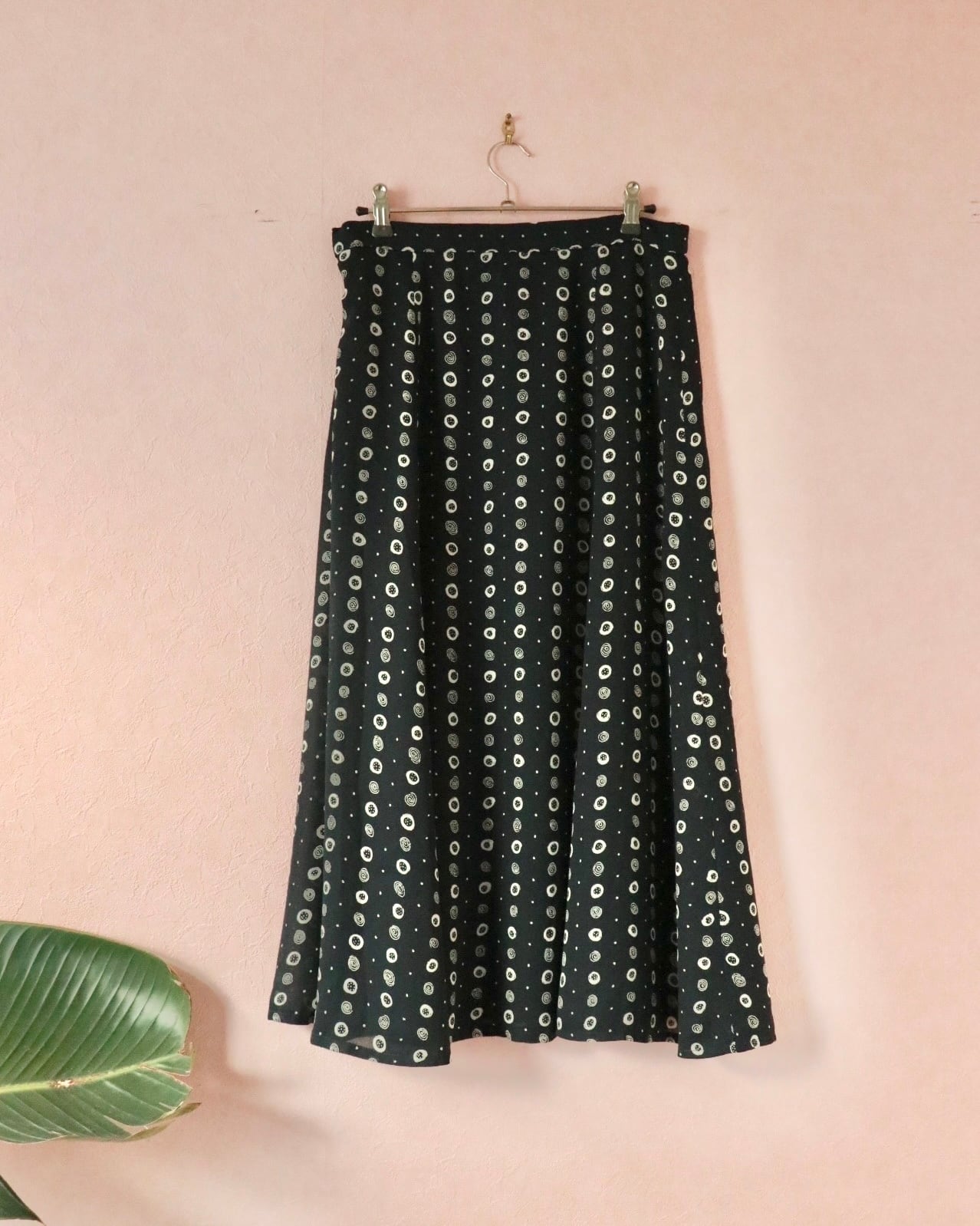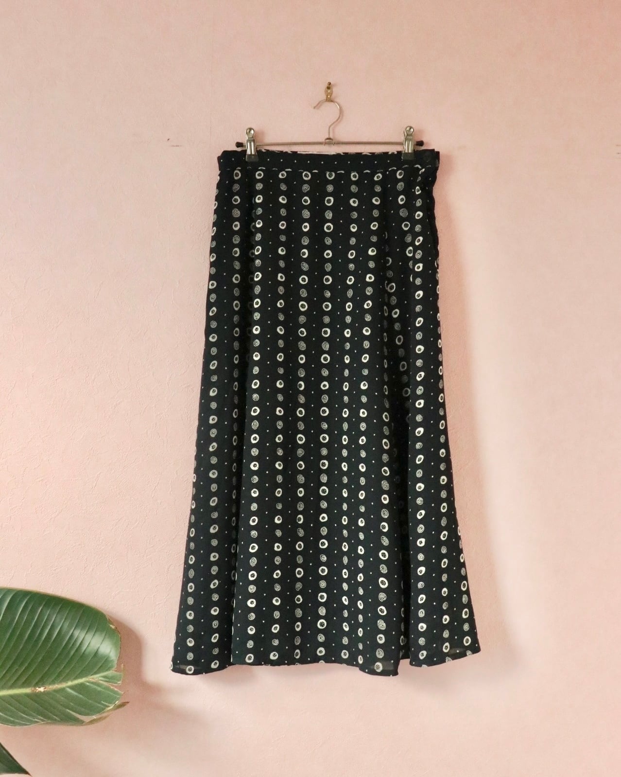 ネイビーベースにホワイトのドット柄のよう模様、Aラインの美シルエットスカートは動くたびに残香を感じられるような優雅な一着。透け感もなく全体的に裏地が付いた年中使える素材感ですが、夏はカジュアルなTシャツやキャミソールと合わせても品よくまとまります。
