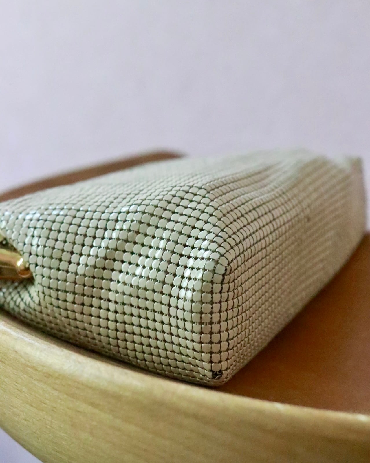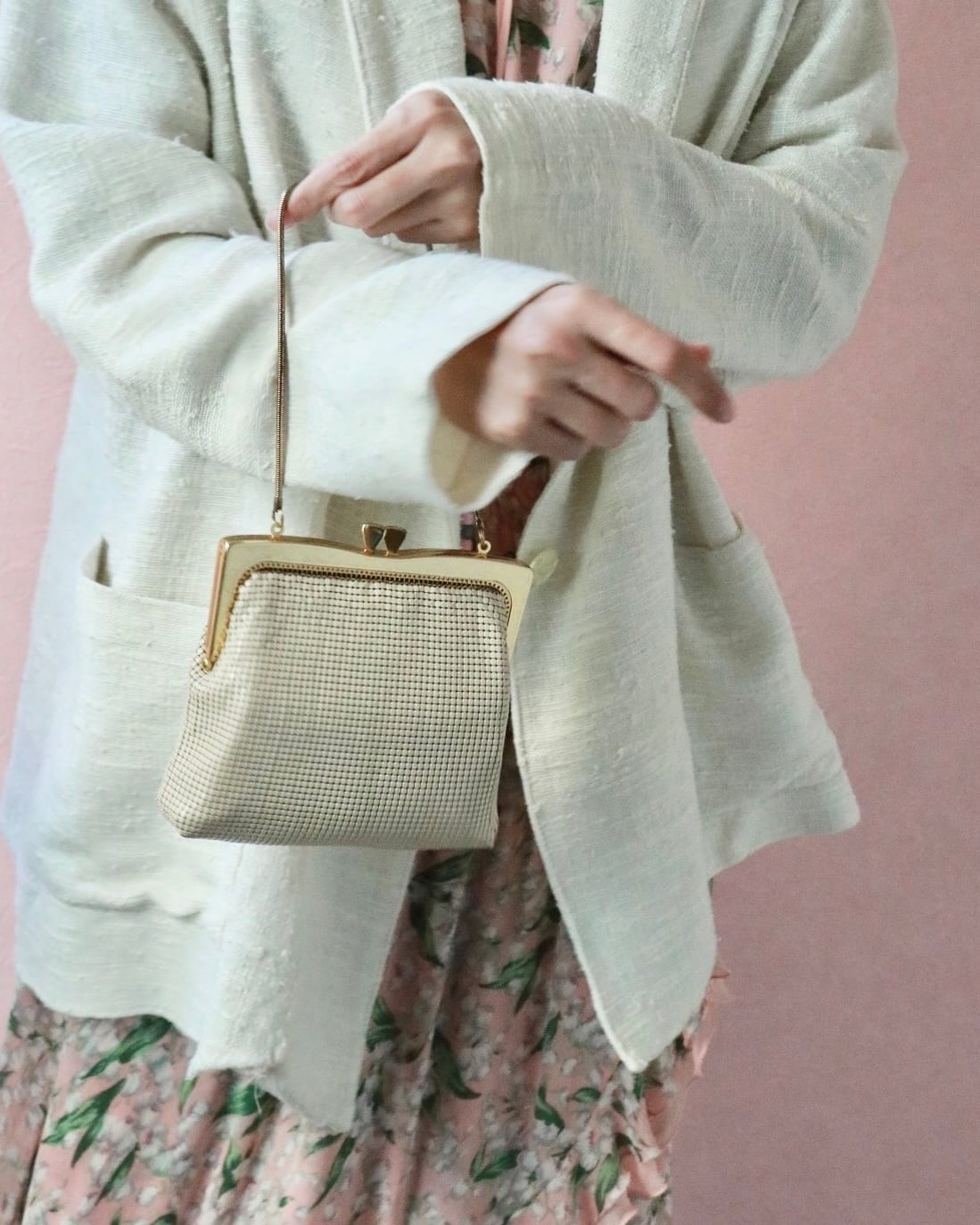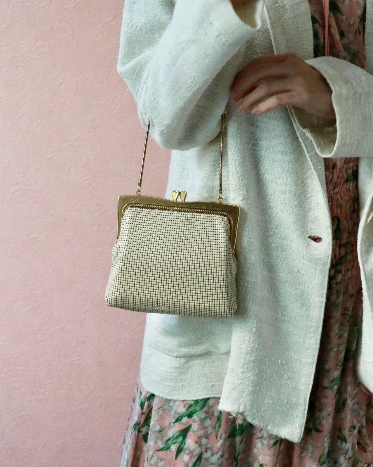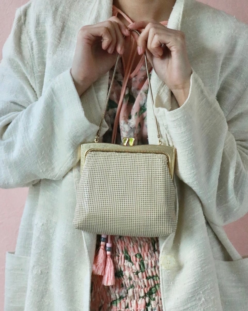 エレガントなホワイトベージュの艶やかなバッグは、オケージョン問わずコーディネートのアクセントになります。ゴールドチェーンが華やかです。