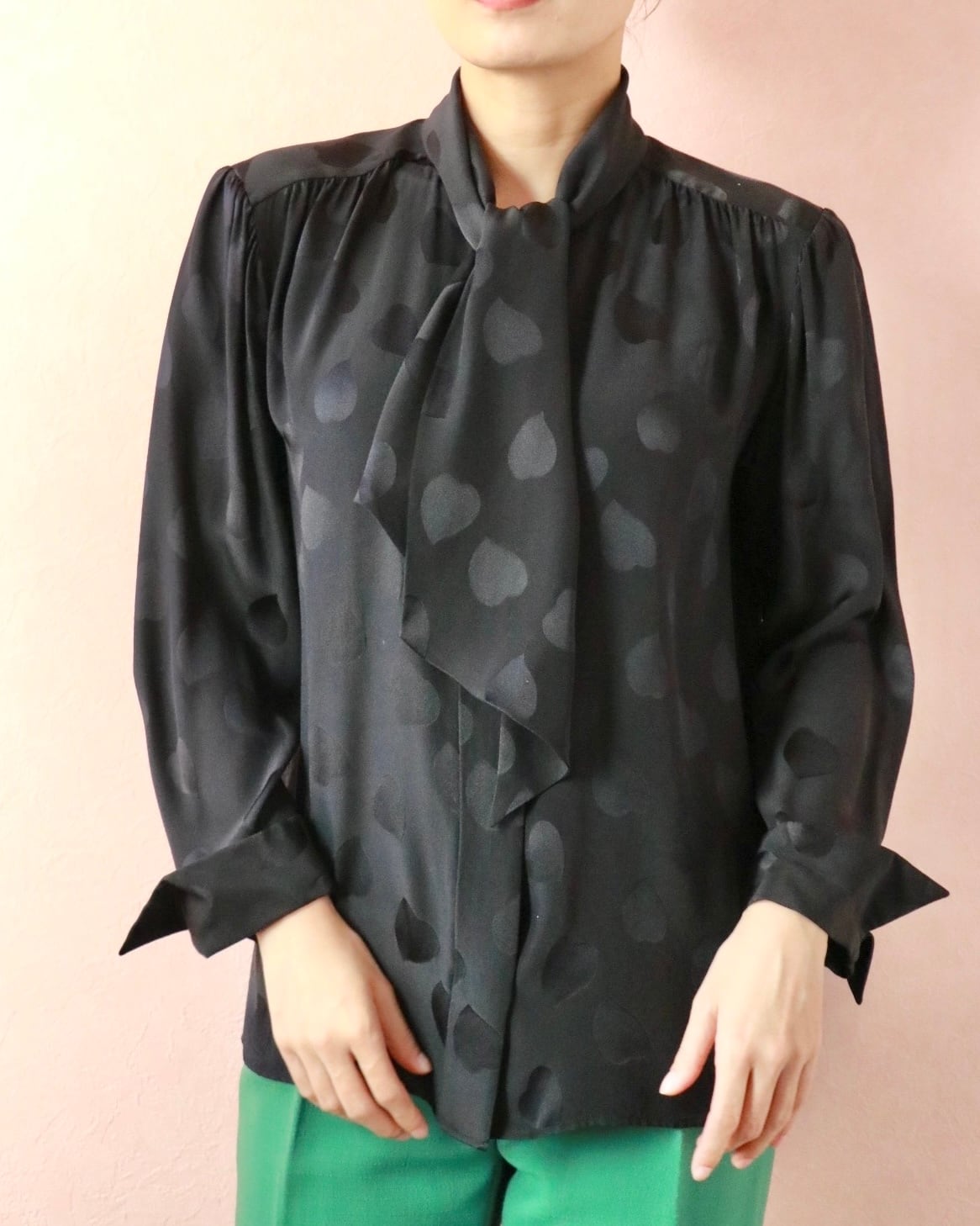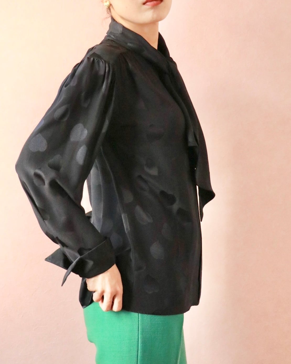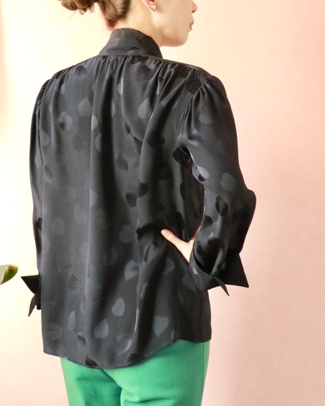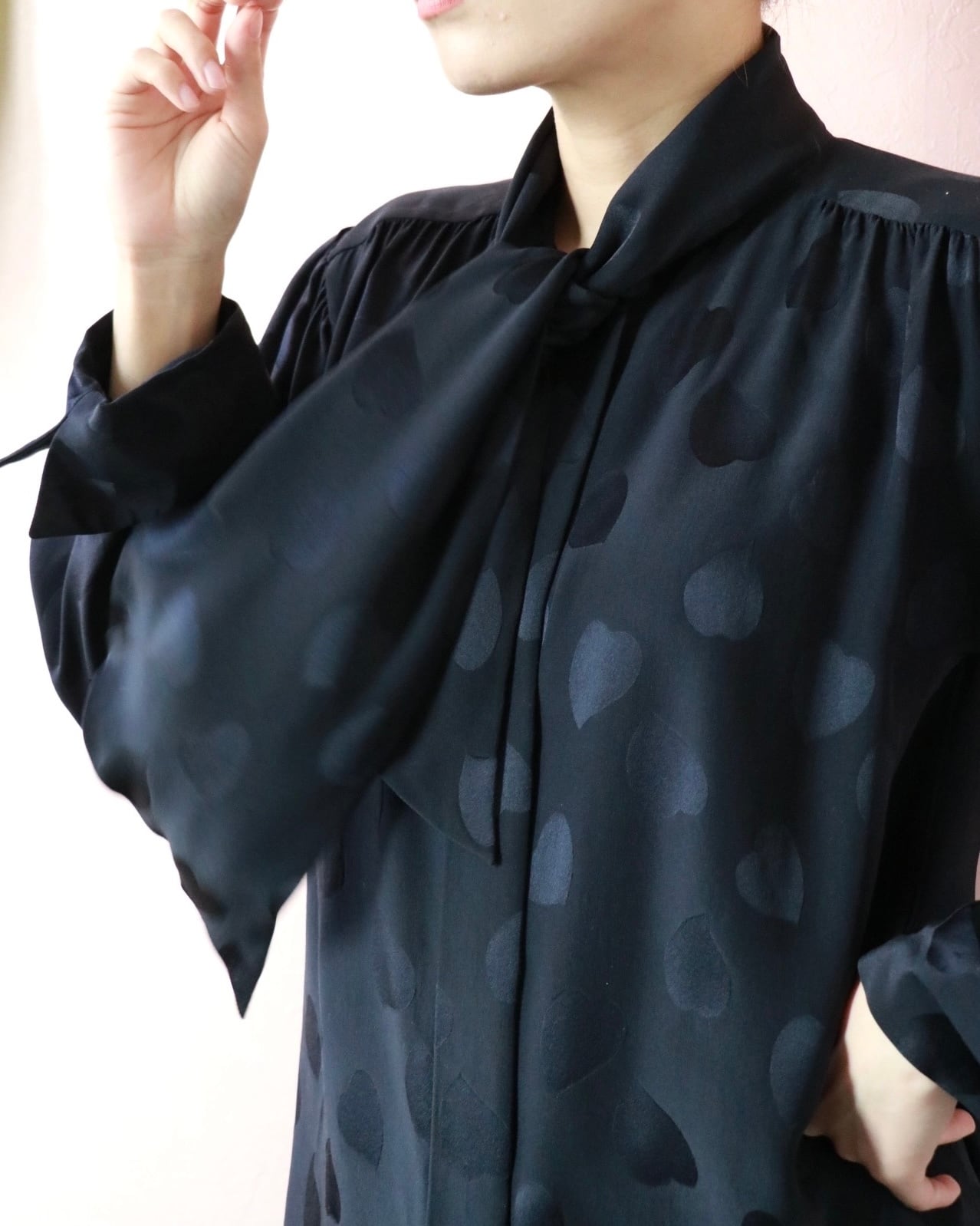 そんなスピリットを纏うシルクのハートモチーフブラウス。さりげなく浮かぶハートモチーフが静かな遊び心を添える一枚。上質なシルクならではの滑らかな艶と落ち感。リボンタイのニュアンスで、クラシックにもモードにも◎ 大人の余白を引き立てる一枚です。