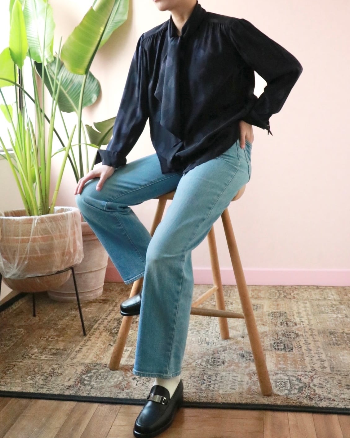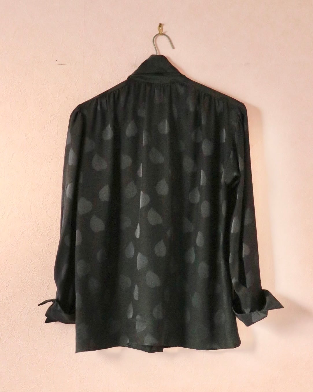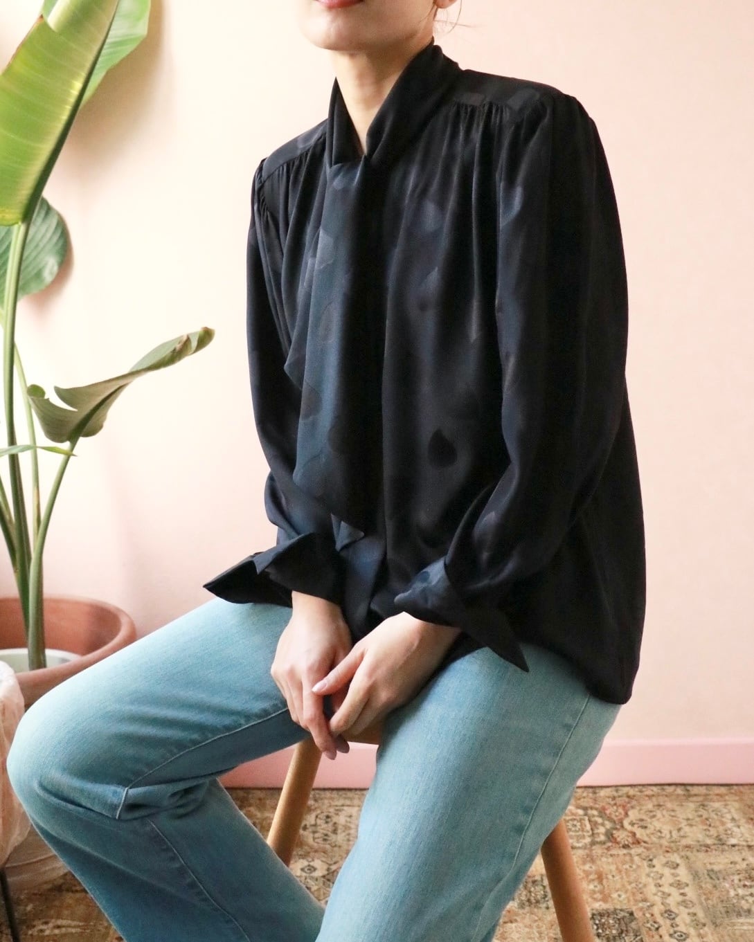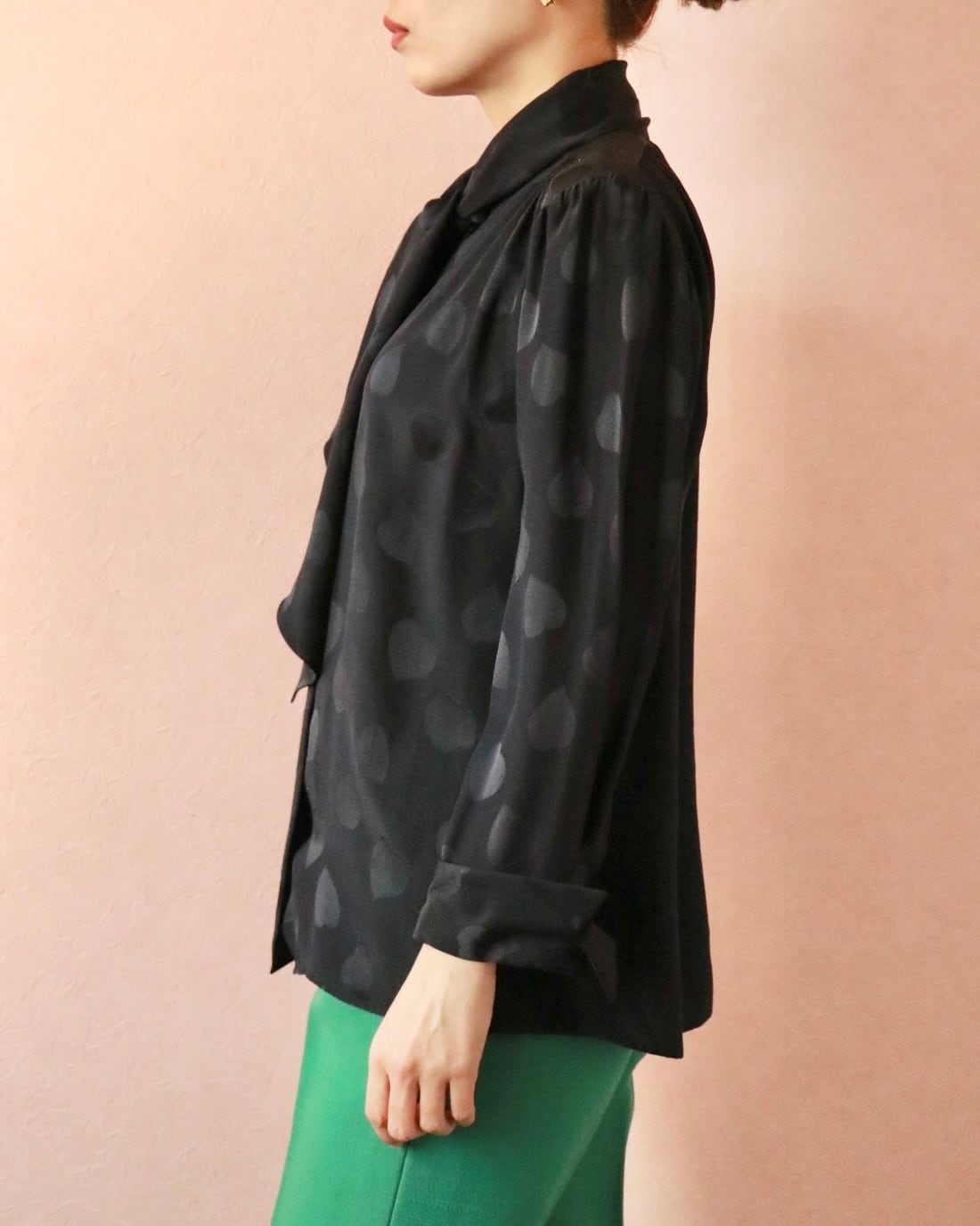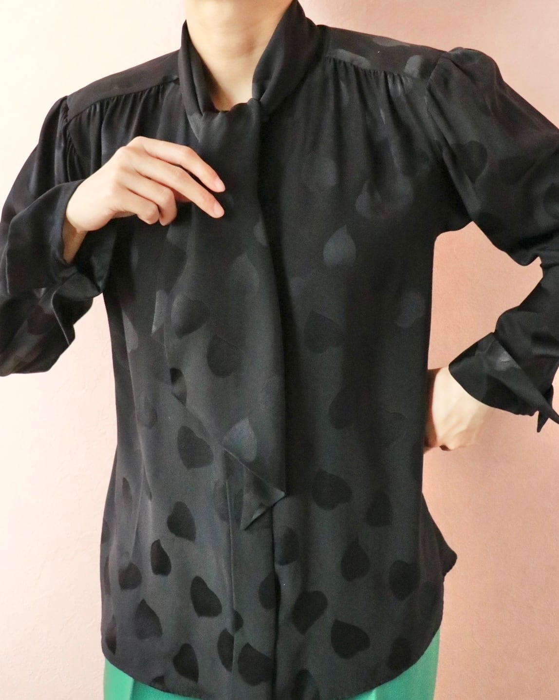 そんなスピリットを纏うシルクのハートモチーフブラウス。さりげなく浮かぶハートモチーフが静かな遊び心を添える一枚。上質なシルクならではの滑らかな艶と落ち感。リボンタイのニュアンスで、クラシックにもモードにも◎ 大人の余白を引き立てる一枚です。