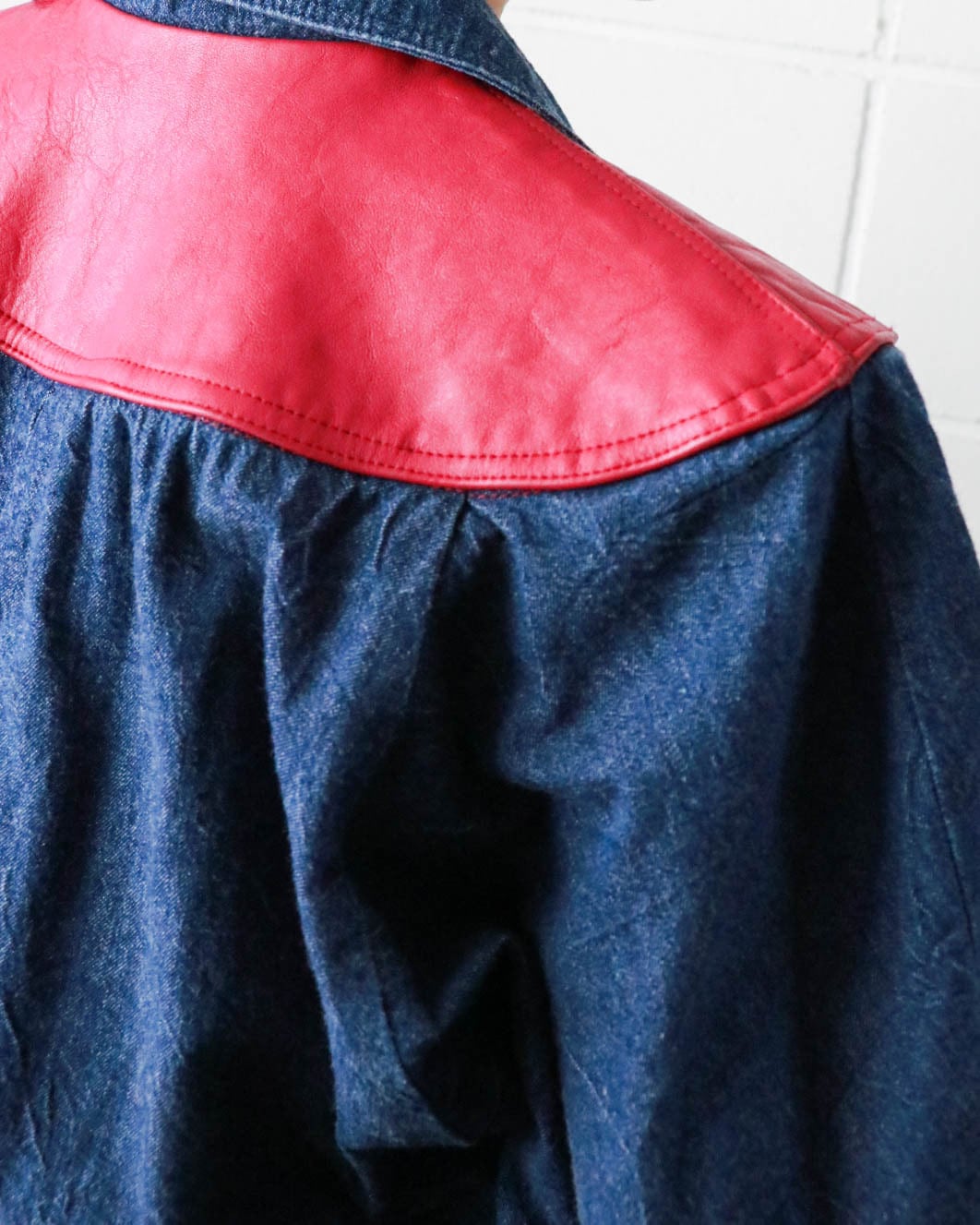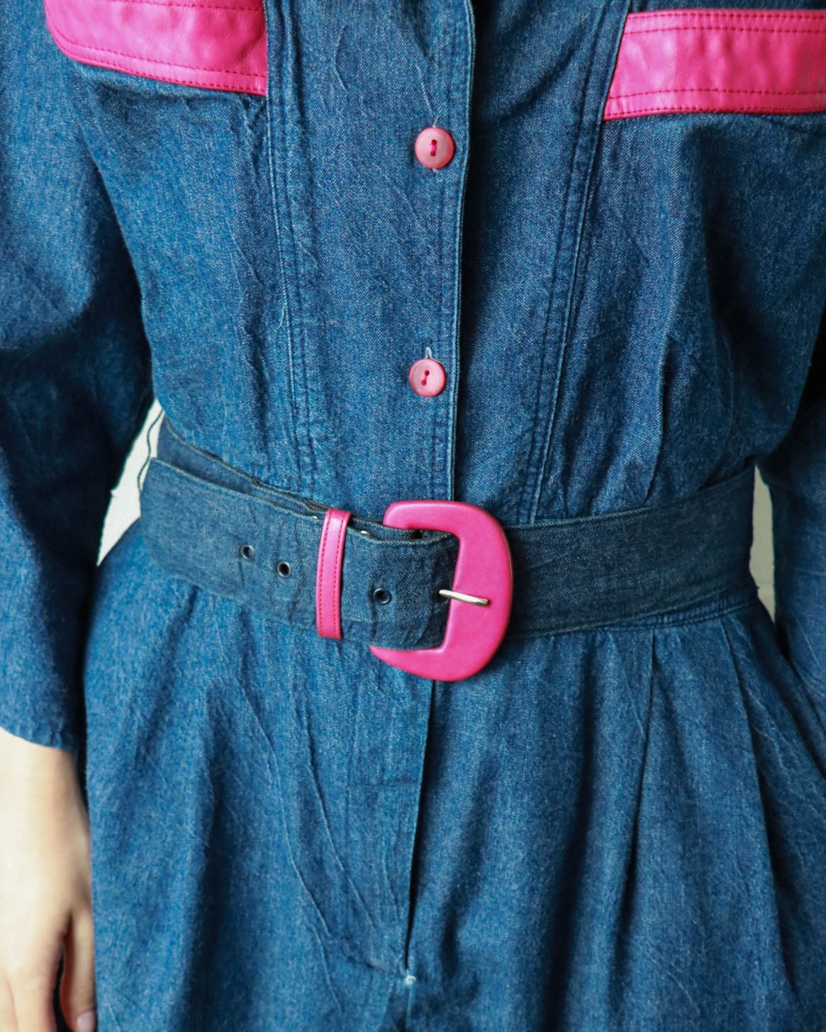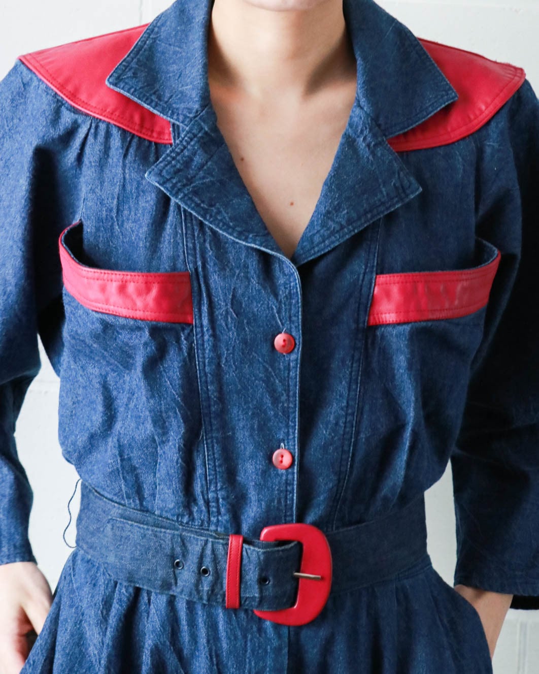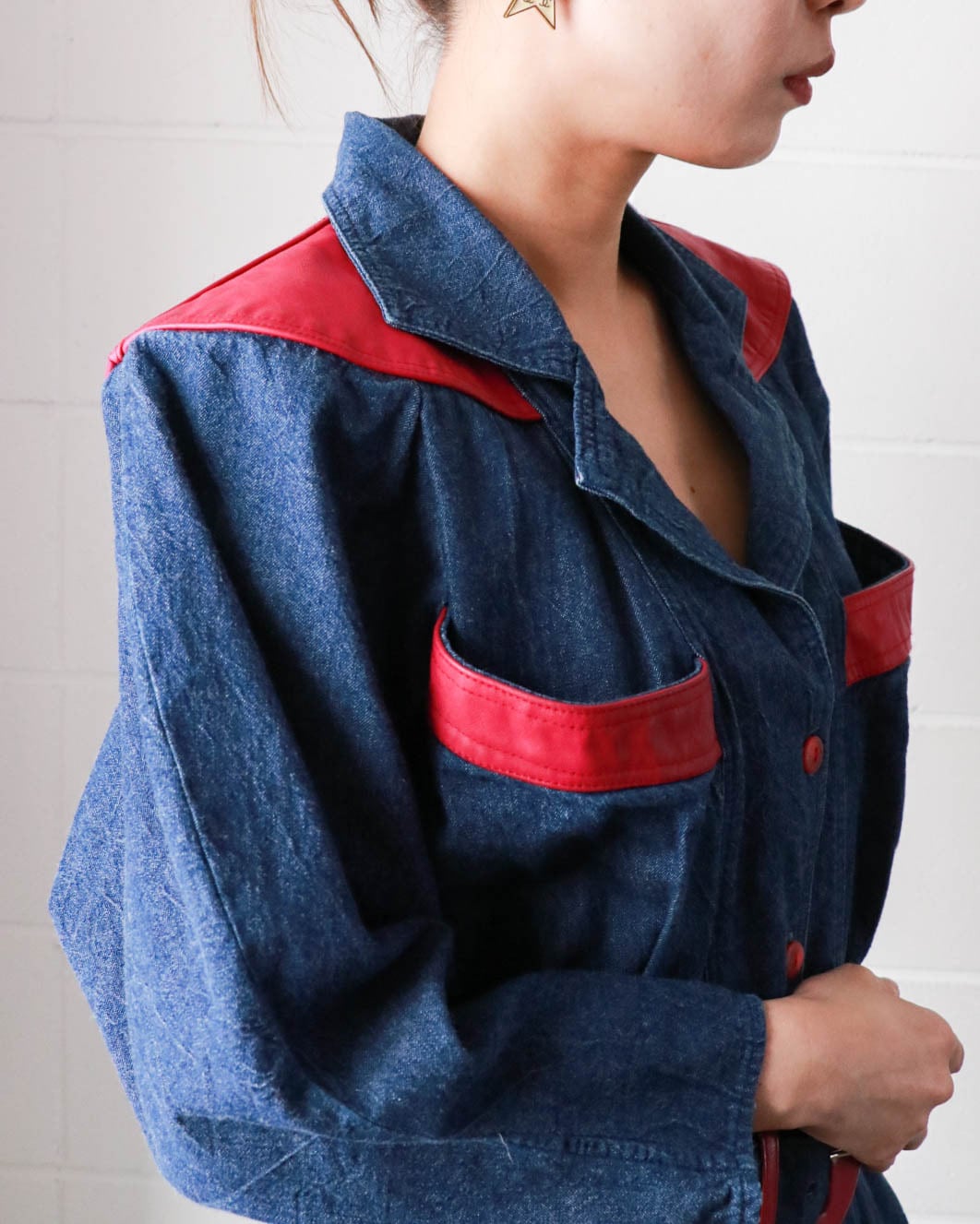 襟下の肩にかかった部分と胸元のポケット、ベルトにもピンクのレザーのような装飾デザインがヴィンテージならでは。ウエストはセットのベルトをしても、スカーフ を巻いたりアクセントをつけても◎気分に合わせた着こなしでぜひ楽しんでみてはいかがでしょうか。