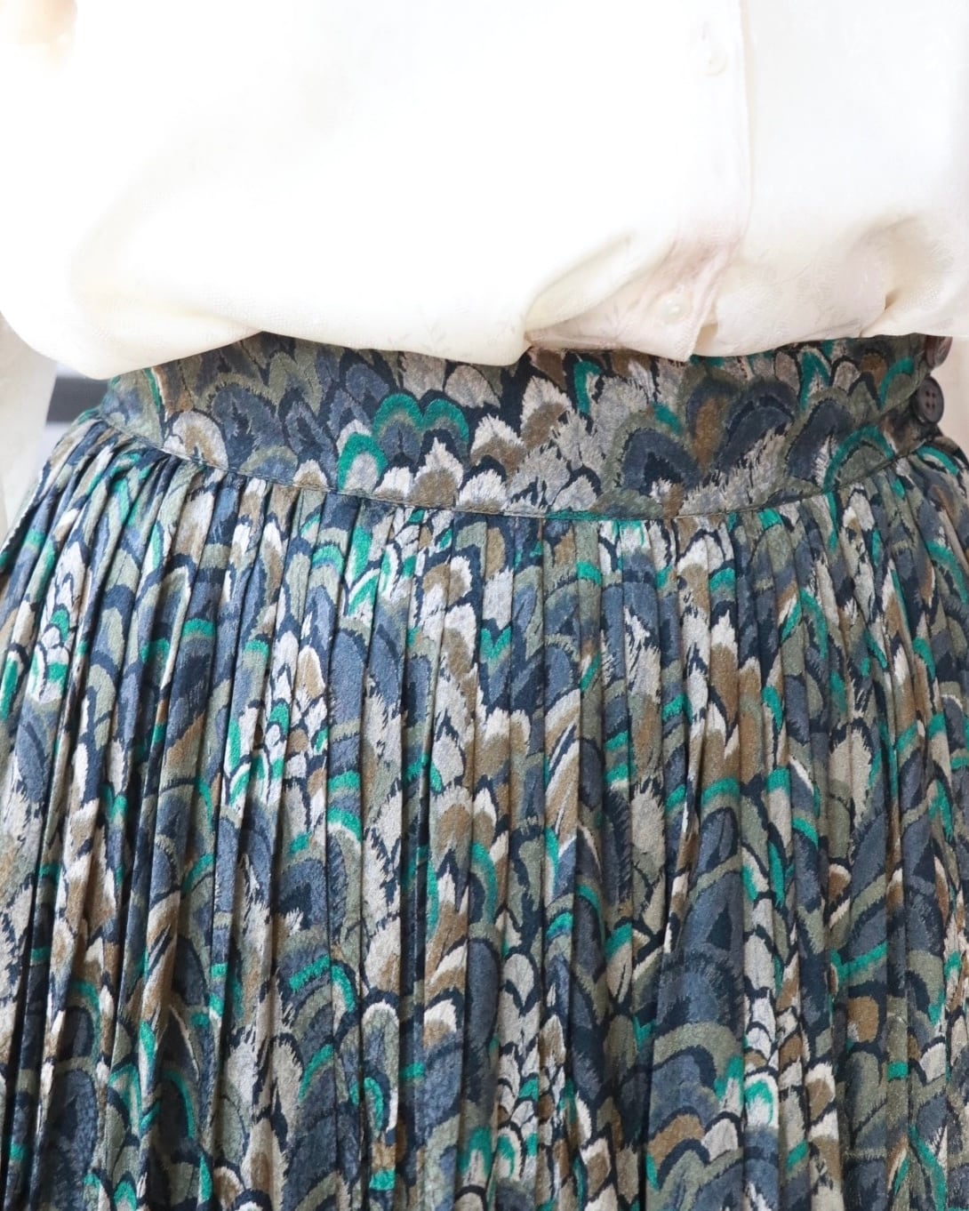 美しいシルエットが際立つ、JIL SANDERのプリーツスカート。落ち着いた色合いのテキスタイルとプリーツがミニマルで洗練された印象に。