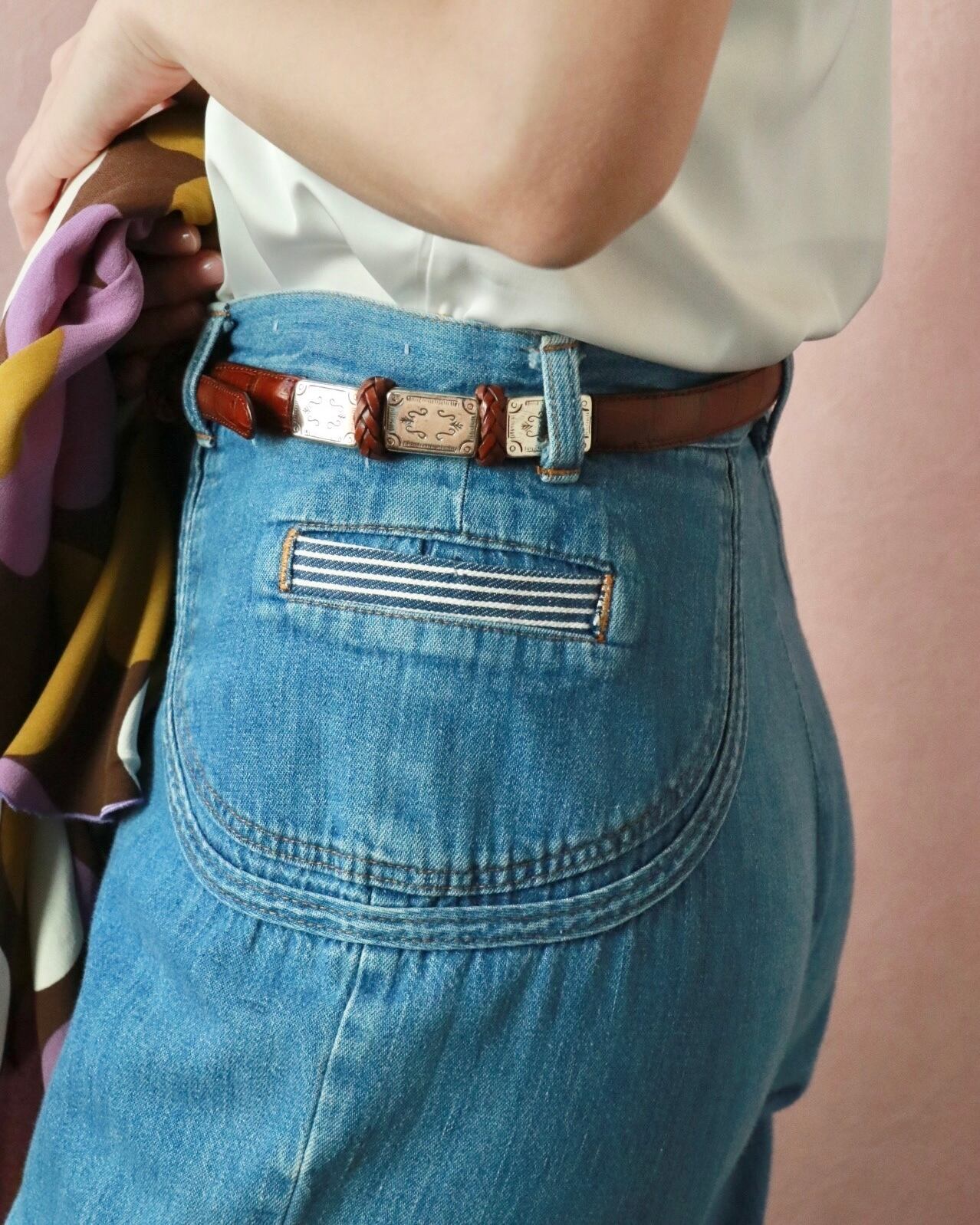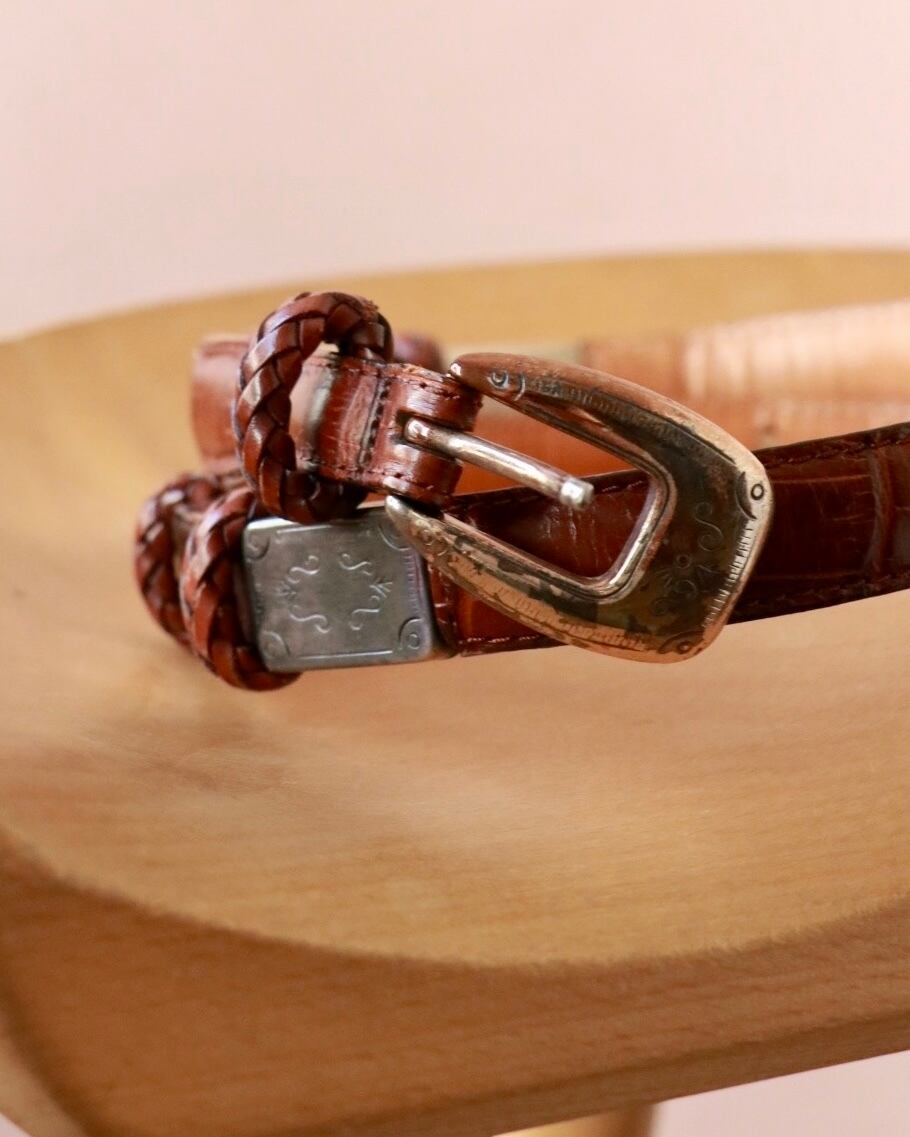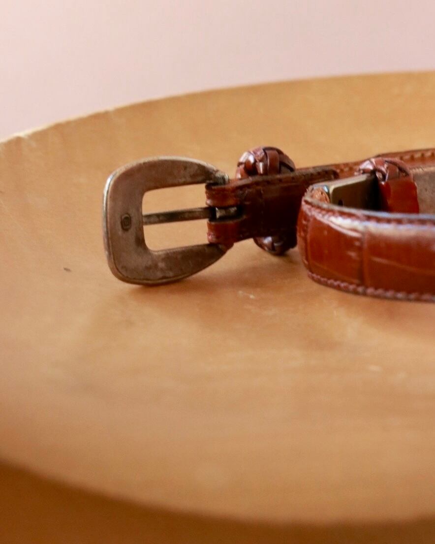 探そうと思っても見つかりにくいセンスあるベルトは、ヴィンテージをチョイスするのがオススメ。こちらは、型押しレザー×シルバーゴールドのバックル組み合わせが、上品なブラウンレザーベルト。程よい太さでボトムスに合わせるのはもちろんウエストマークにも◎