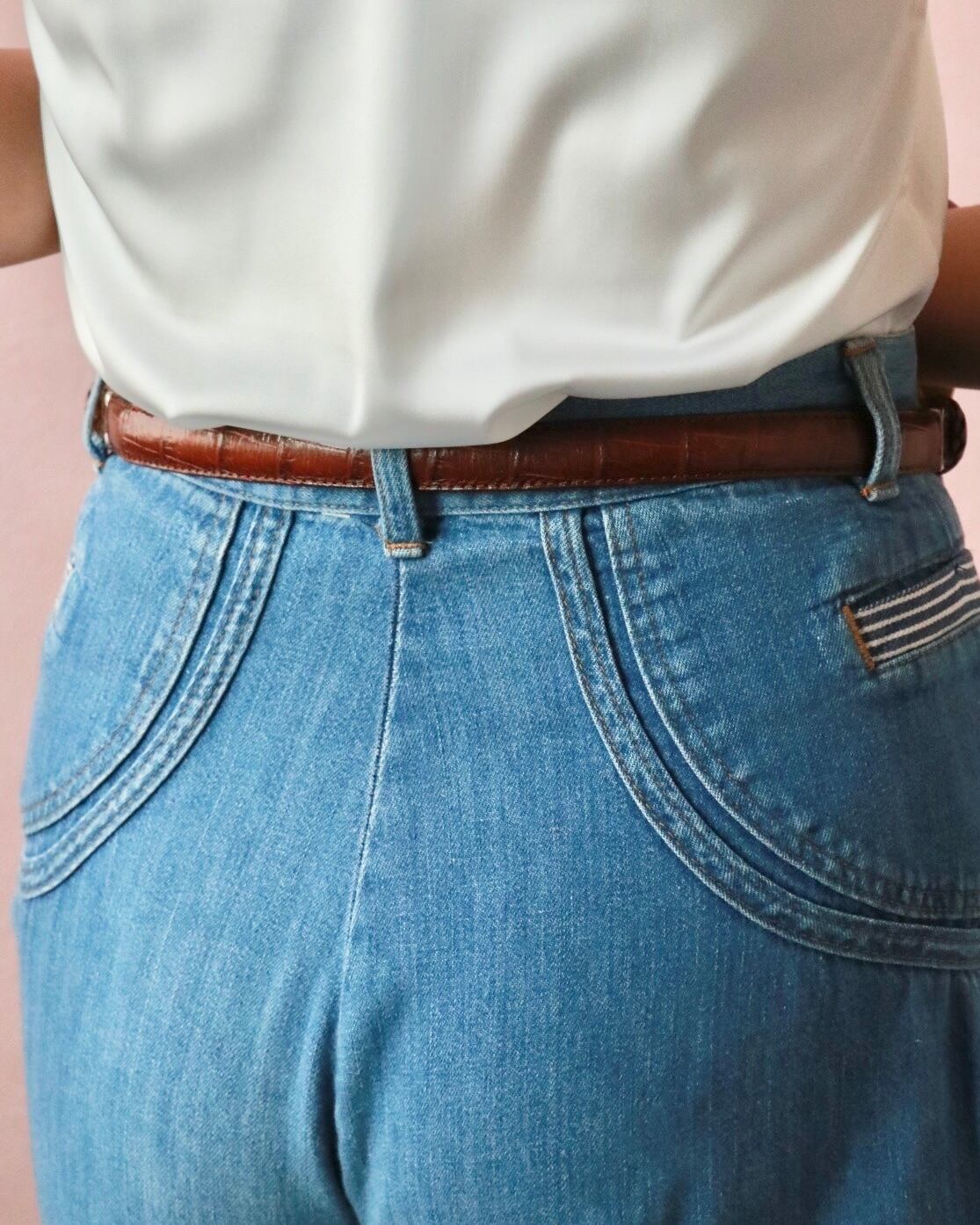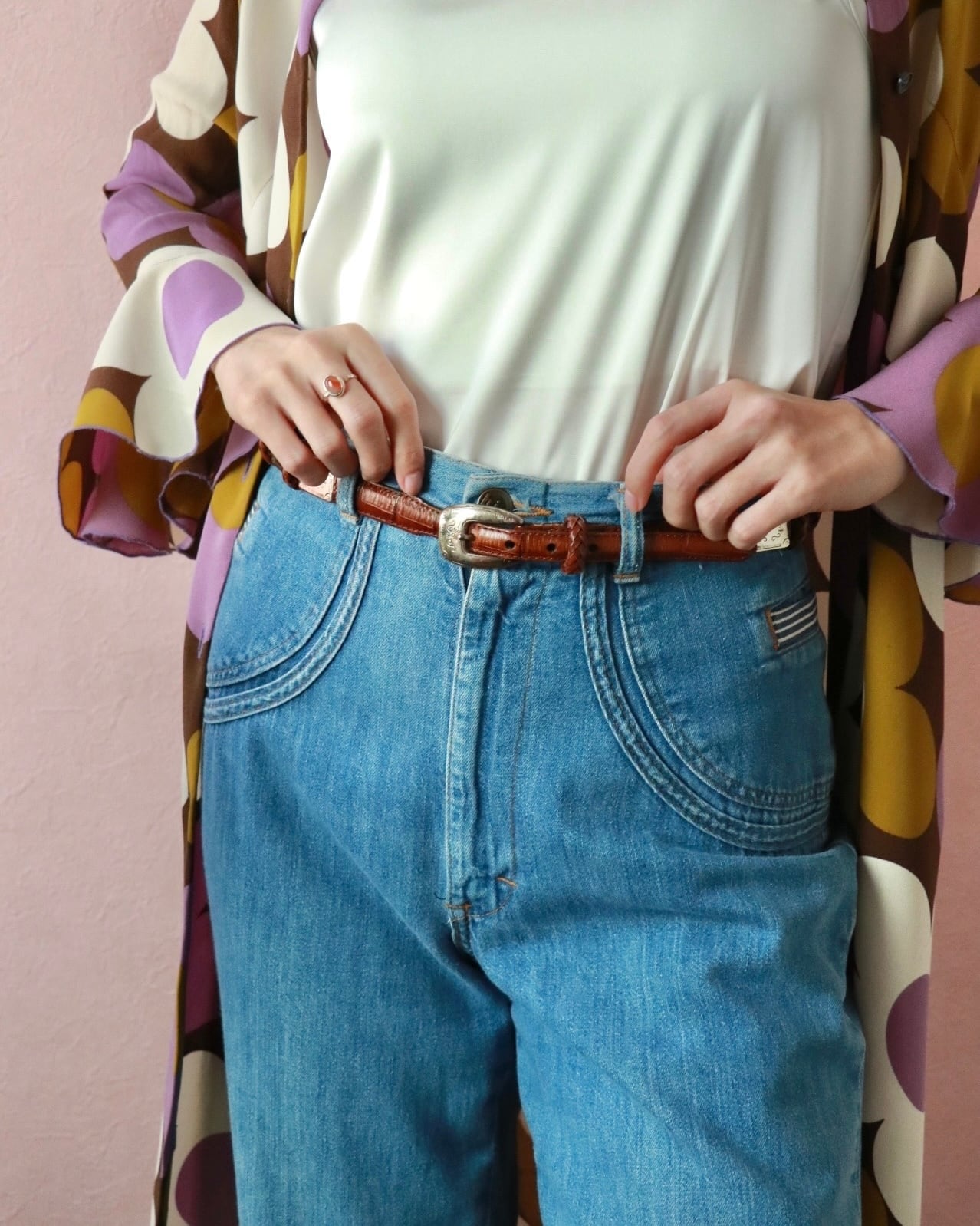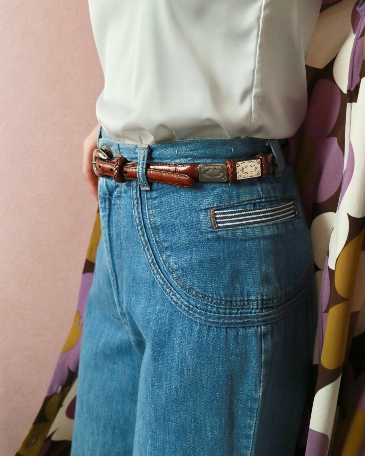 探そうと思っても見つかりにくいセンスあるベルトは、ヴィンテージをチョイスするのがオススメ。こちらは、型押しレザー×シルバーゴールドのバックル組み合わせが、上品なブラウンレザーベルト。程よい太さでボトムスに合わせるのはもちろんウエストマークにも◎