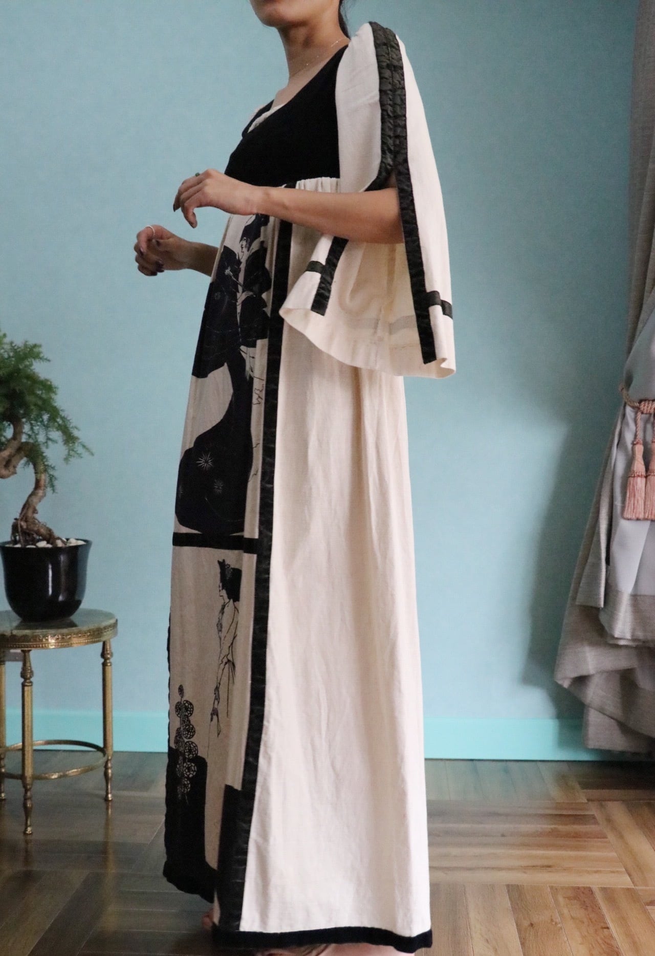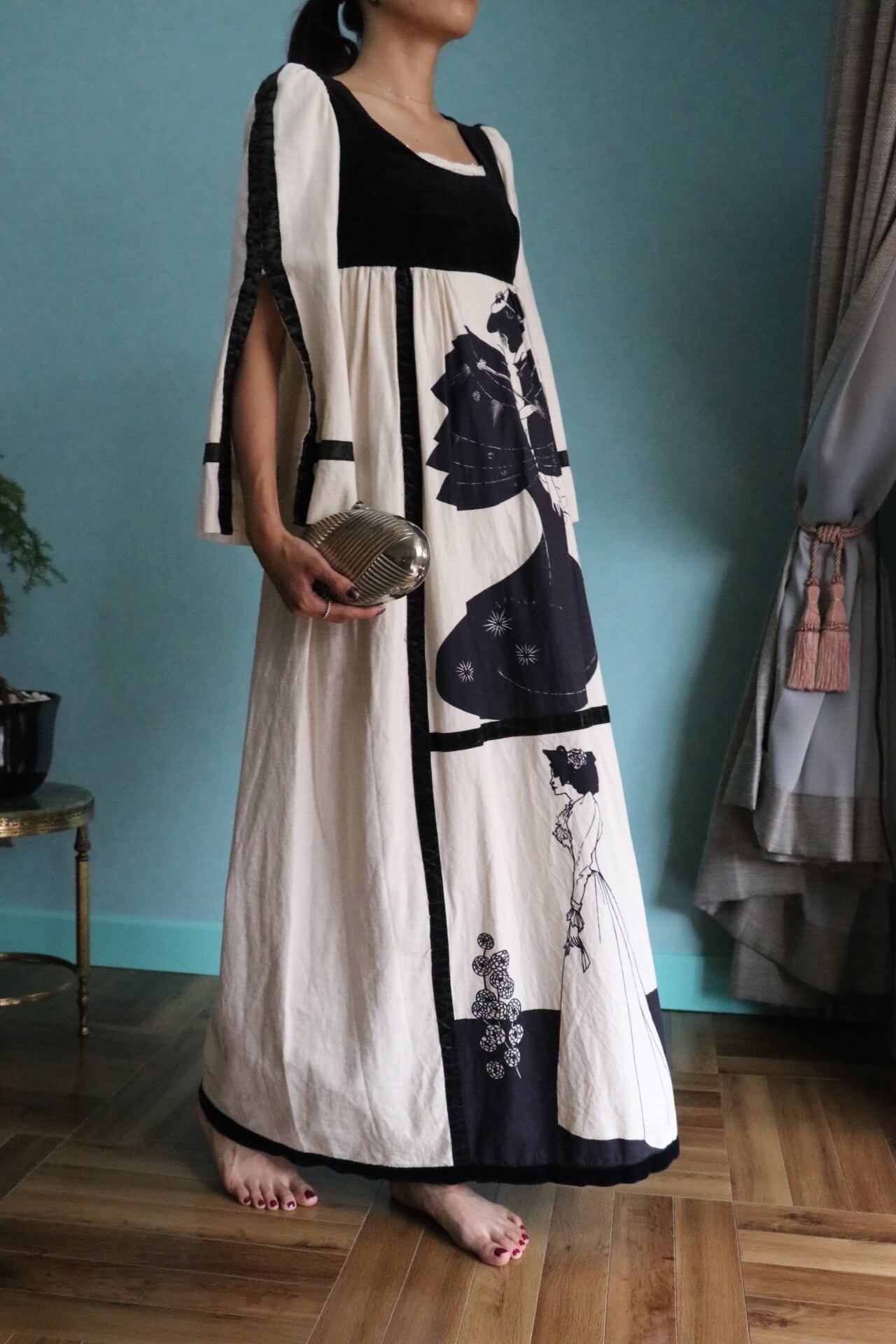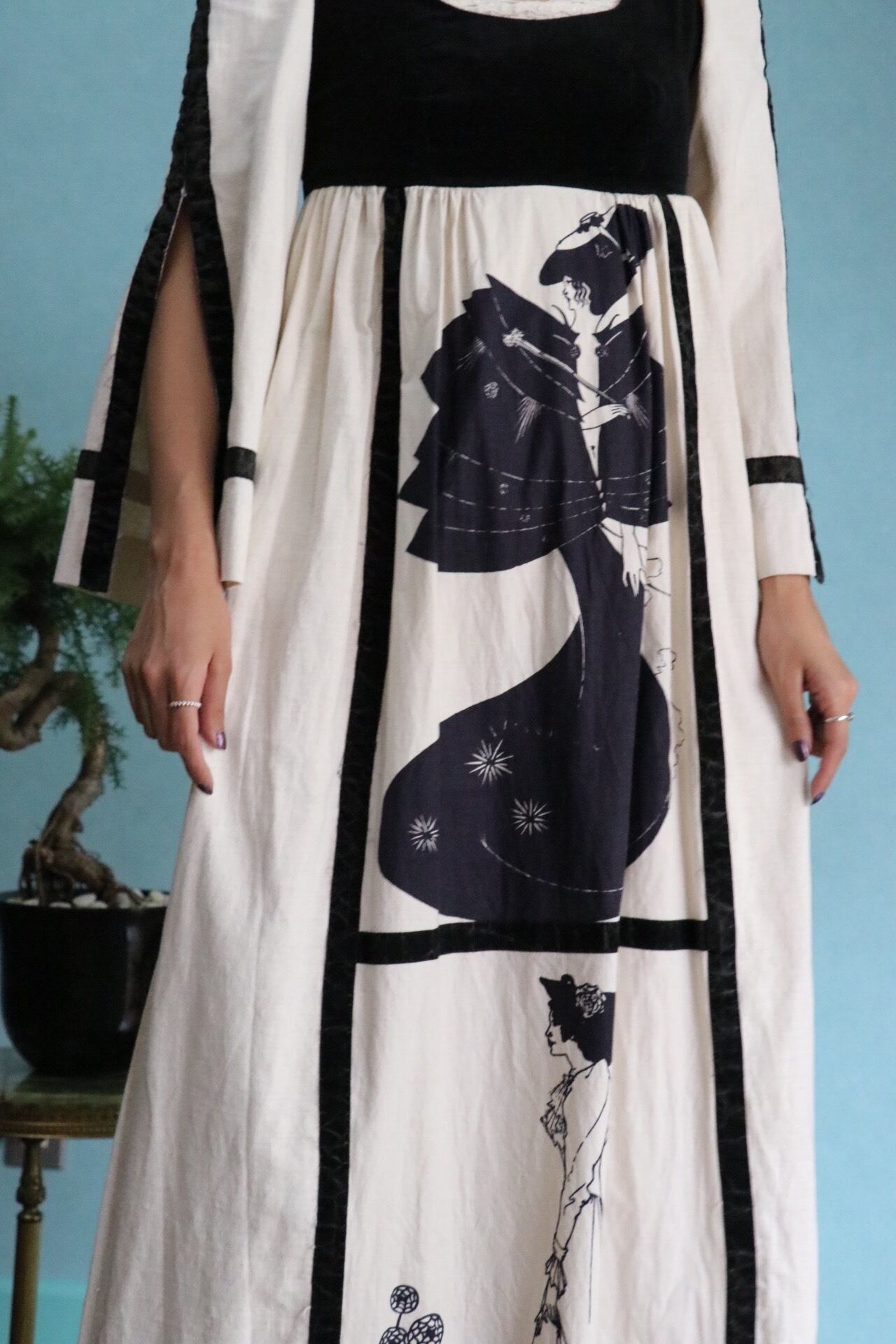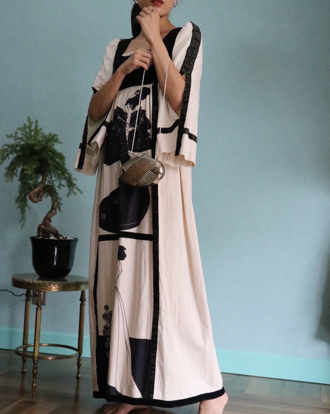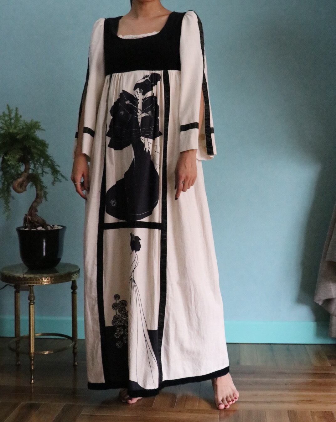 ユニークなデザインが魅力的な70'sロングドレス。