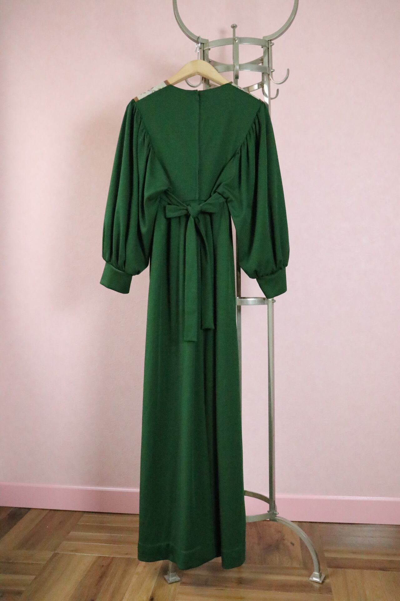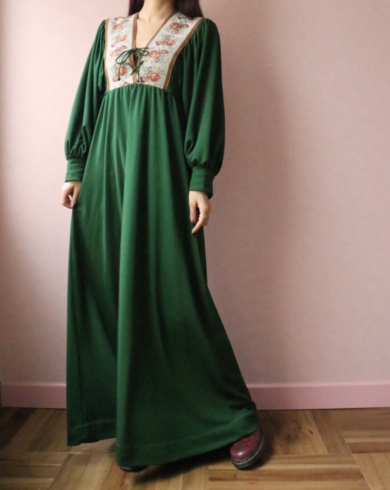胸元が特徴的な1970年代ロングドレス。