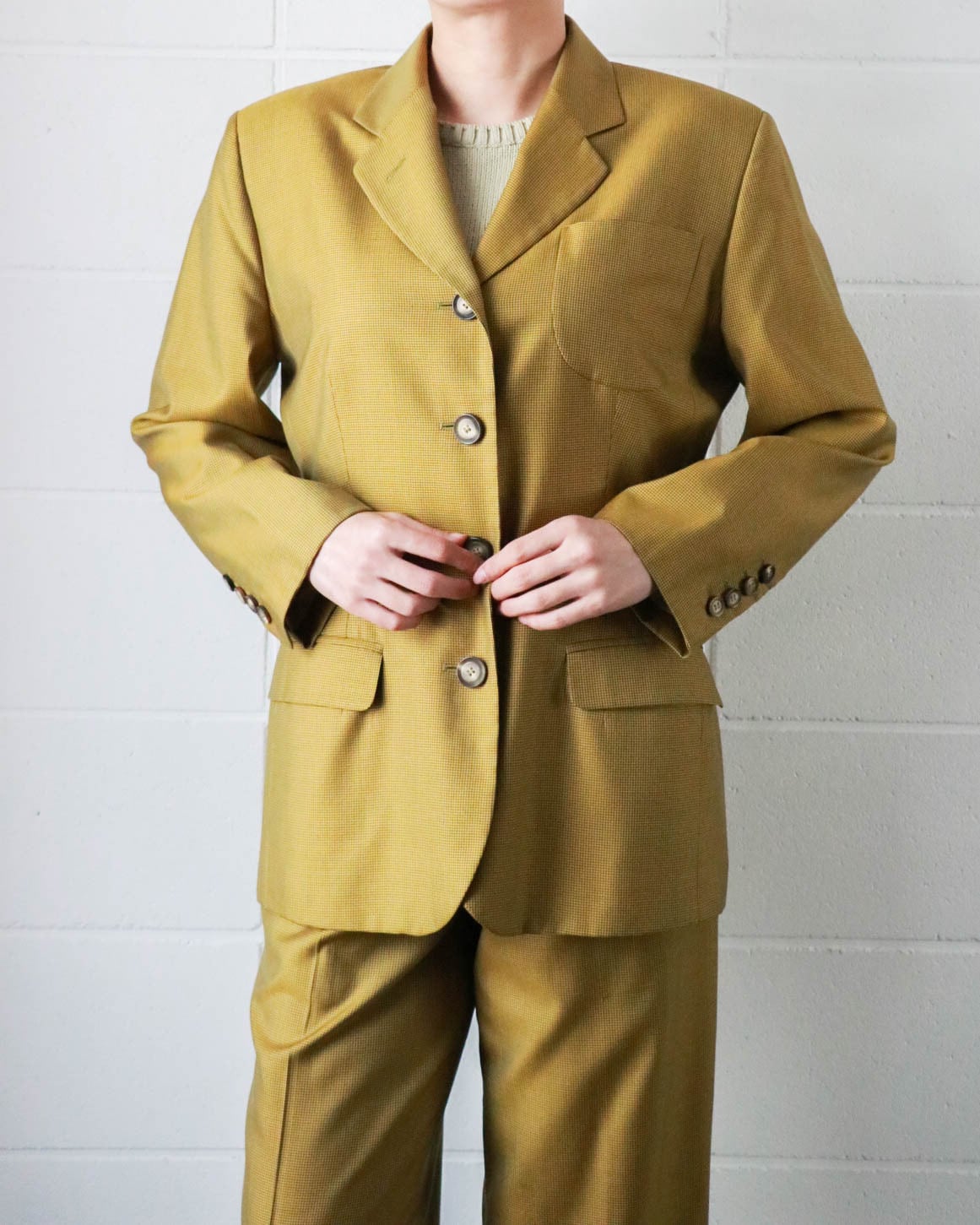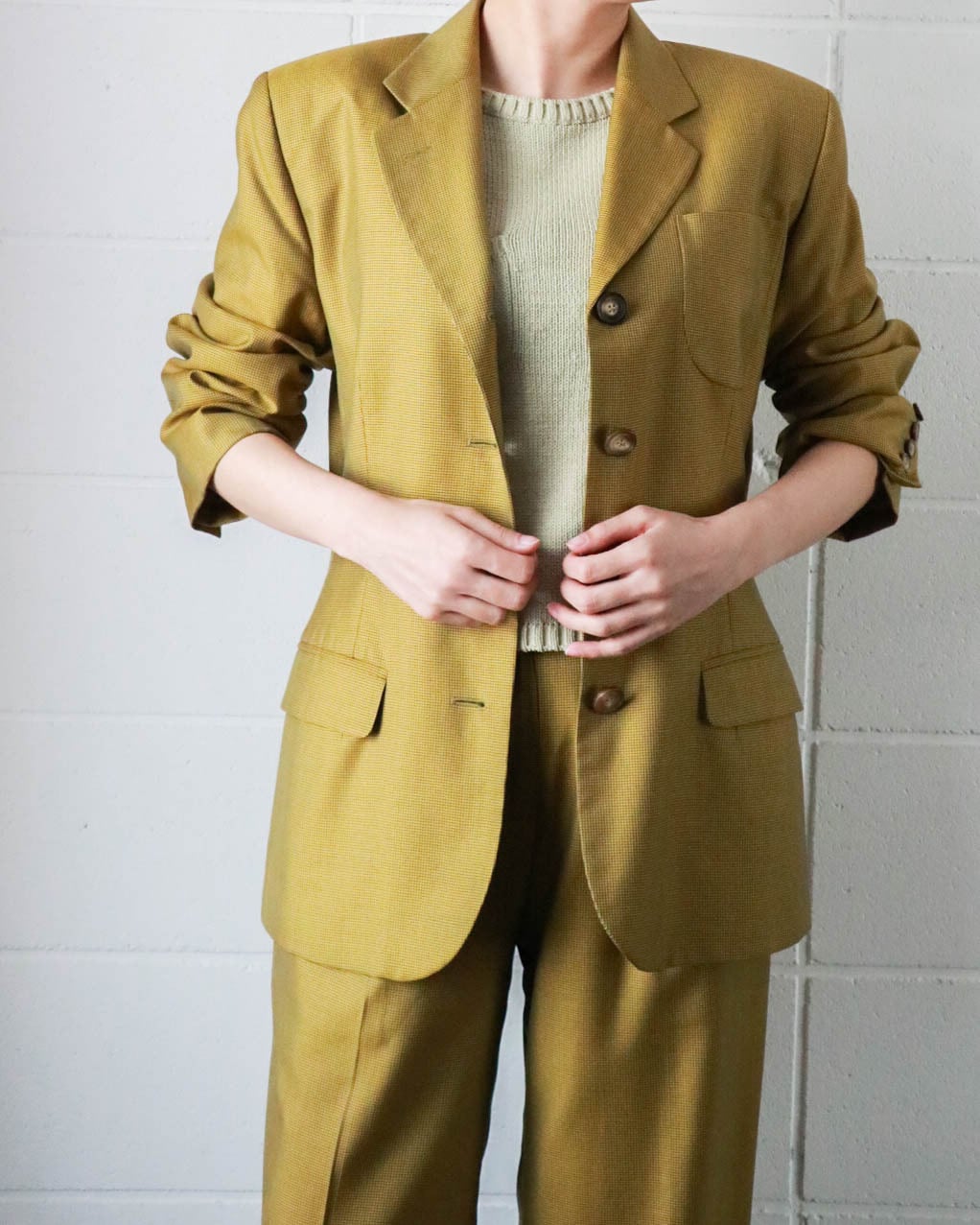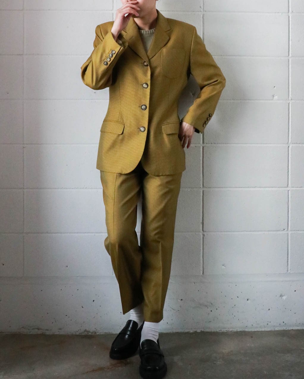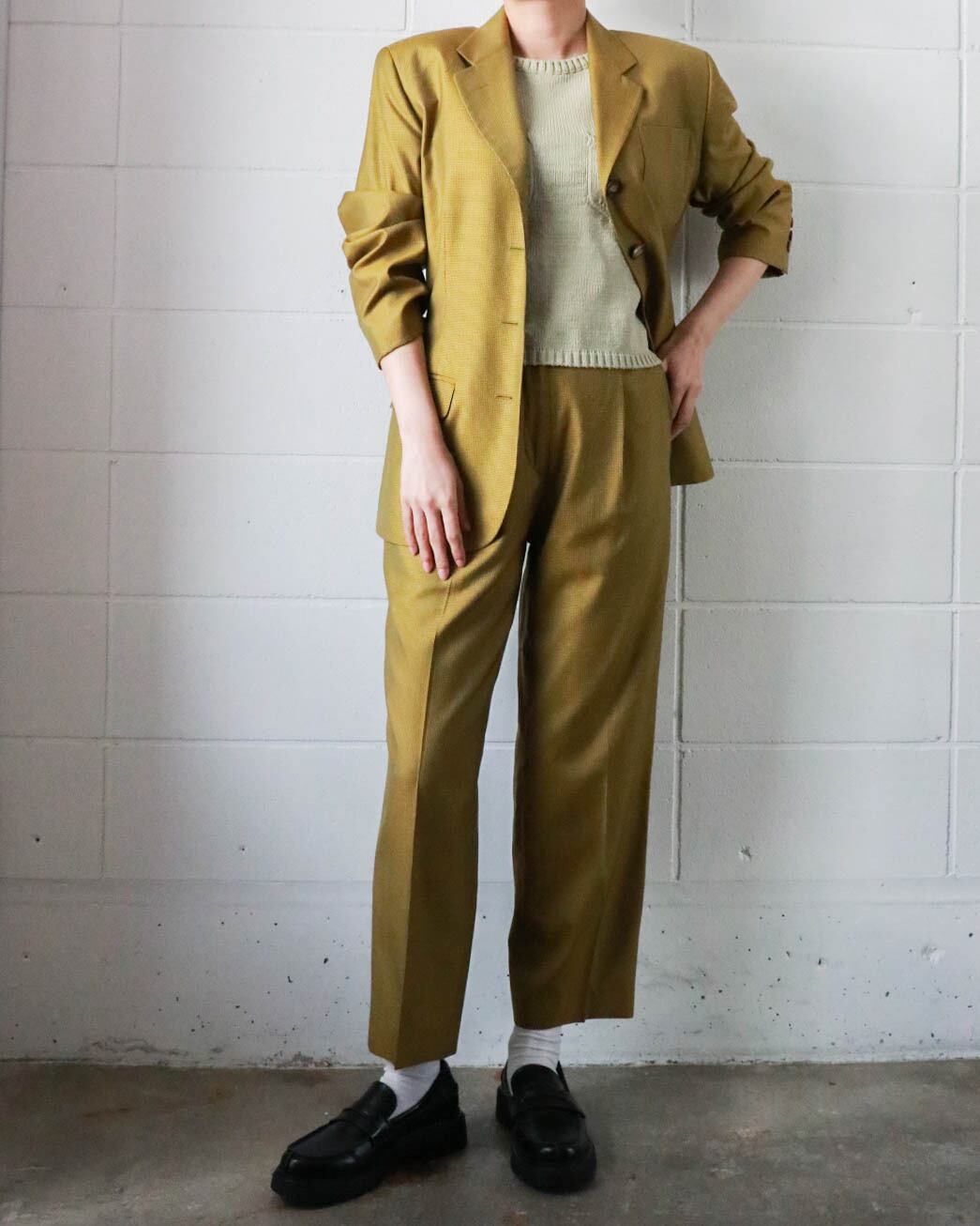 マスタード×ブラウンの組み合わせがクラシックながらもカジュアル寄りで、インナーを選ばずコーディネートを楽しめます。ウール×シルクミックスの軽量素材感がシーンを問わず大活躍しまう。写真の様にセットアップではもちろん、デニムやお好みの柄スカートなどに合わせて自分だけのコーディネートをお楽しみください♡