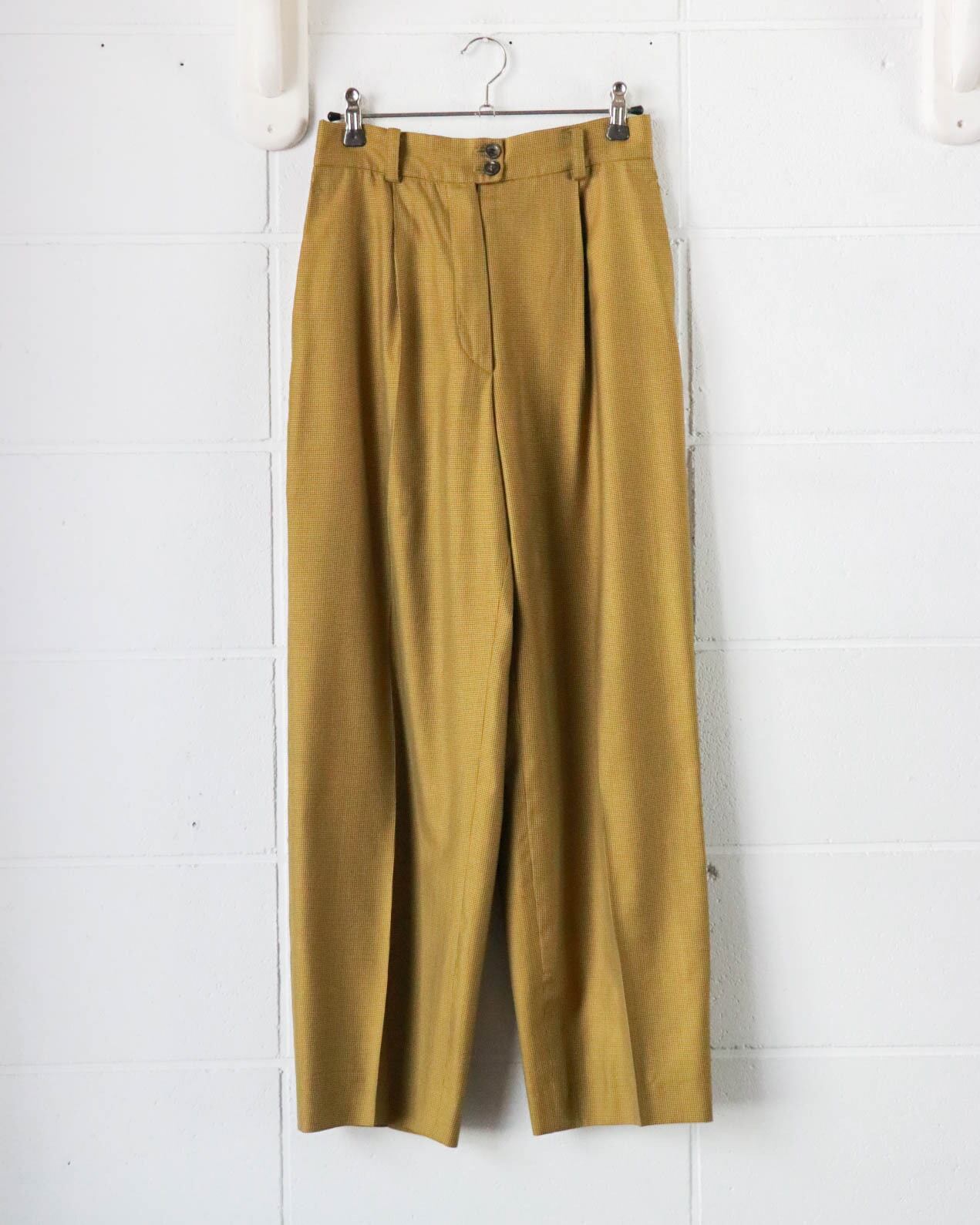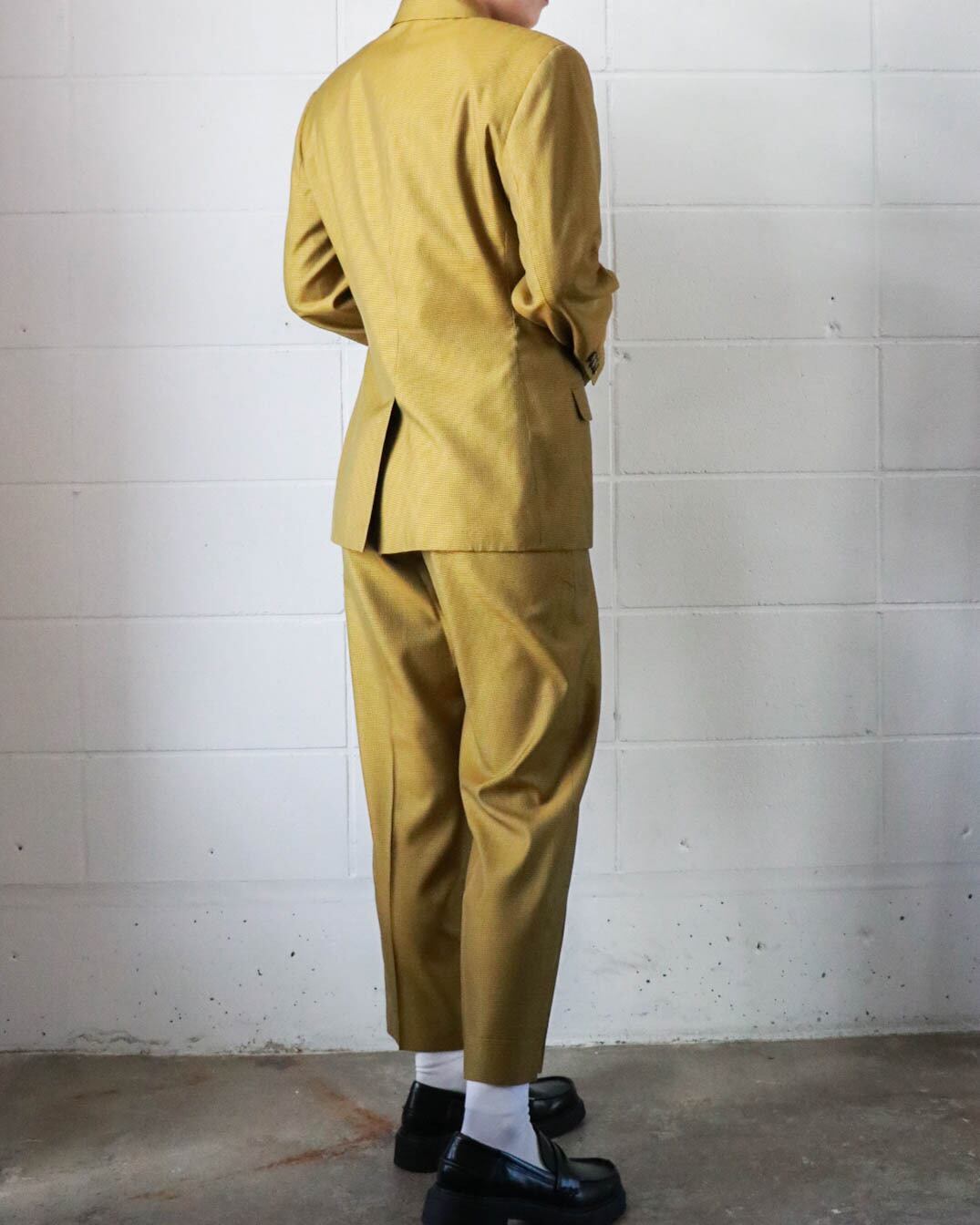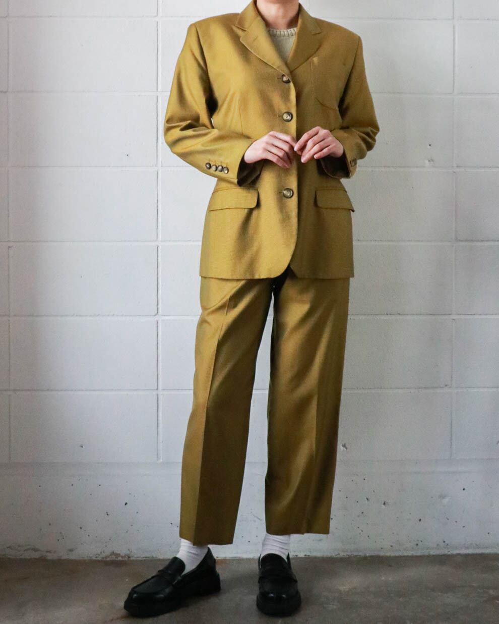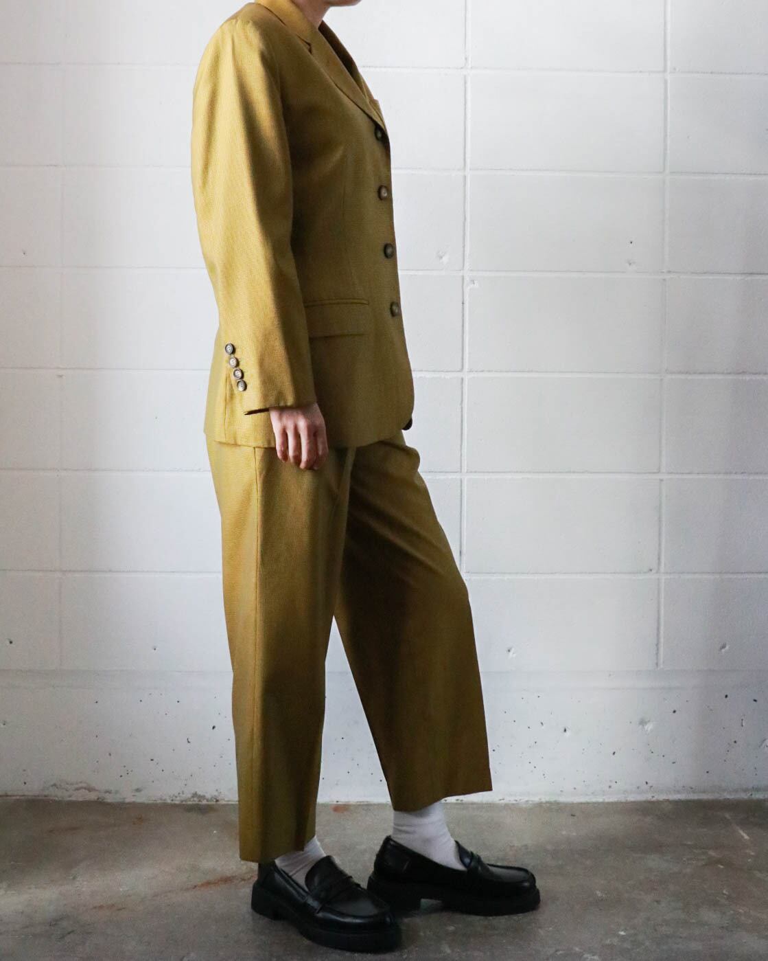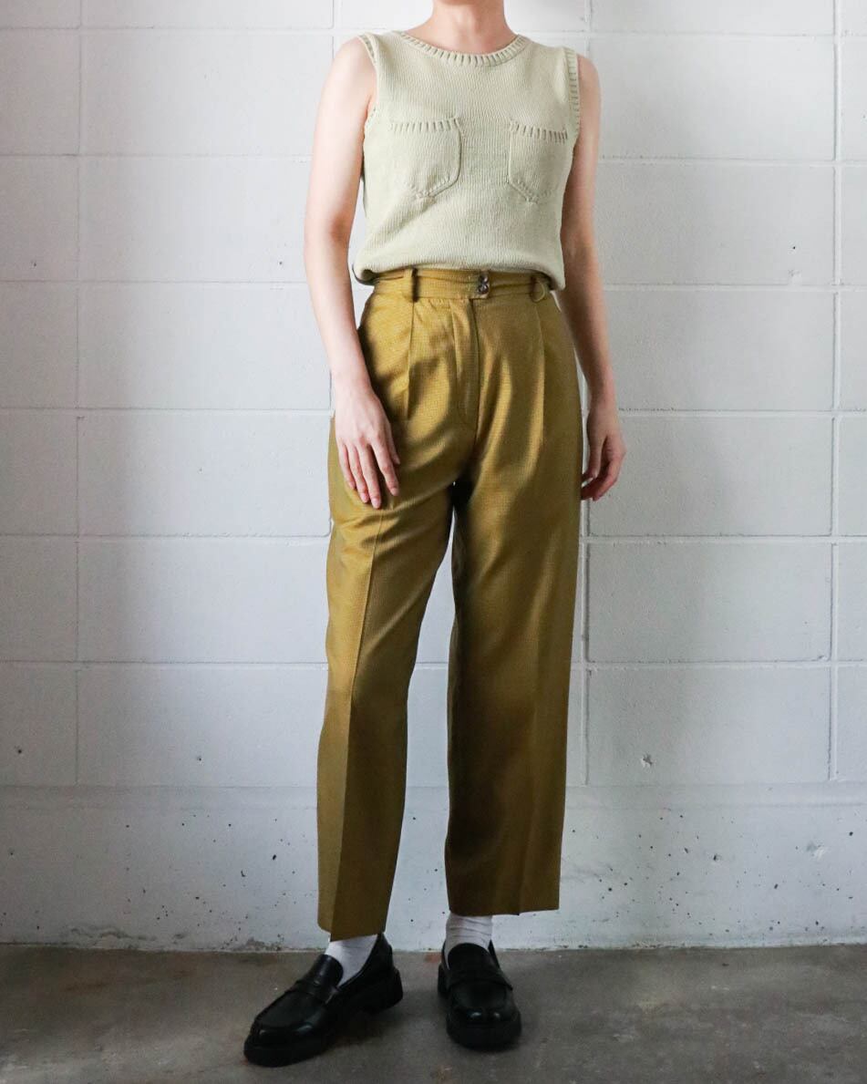 マスタード×ブラウンの組み合わせがクラシックながらもカジュアル寄りで、すっきりとしたハイウエストときれいに落ちるシルエットが魅力的。シンプルながらラインの美しさが際立つ一本です。ウール×シルクミックスの軽量素材がシーンを問わず大活躍します。別売りのジャケットとセットアップで合わせるのもおすすめです。