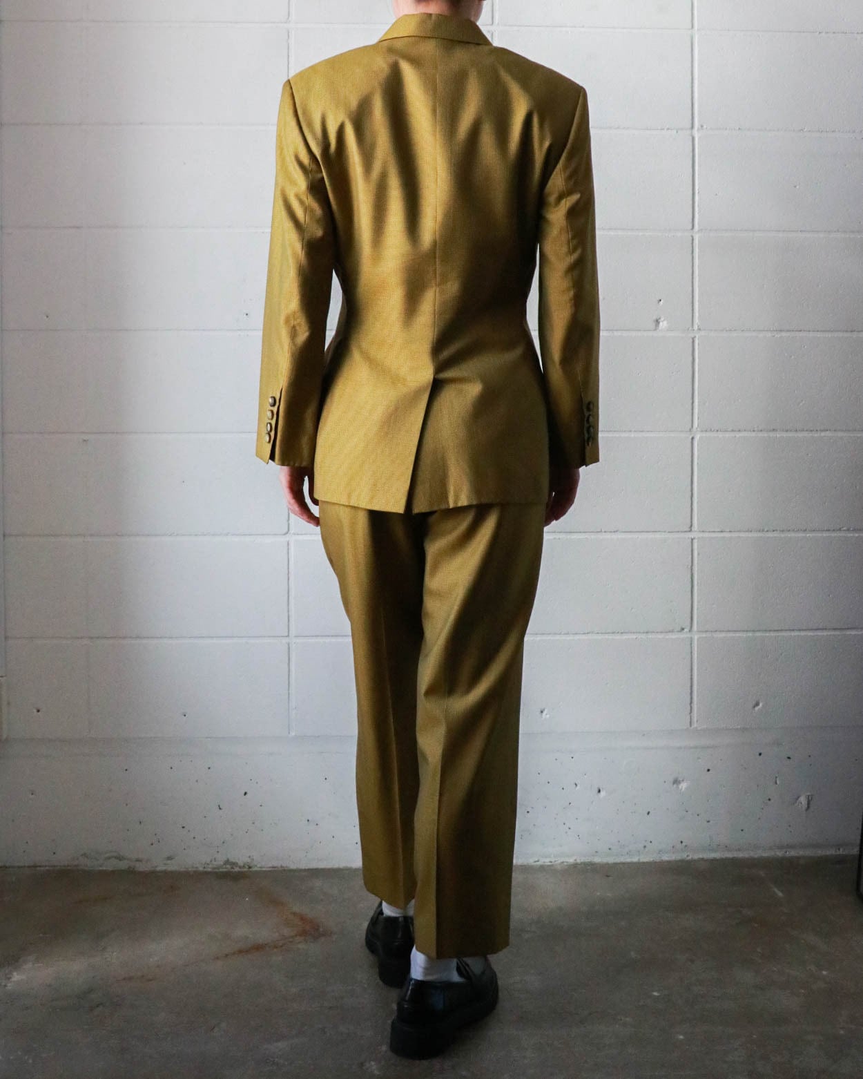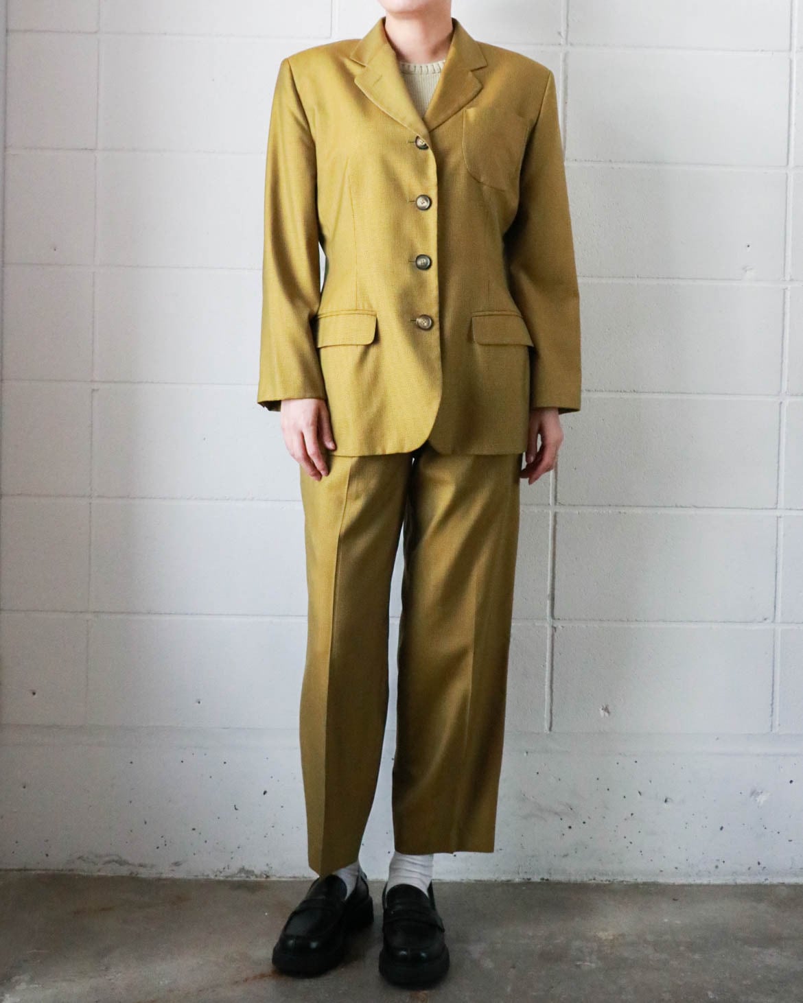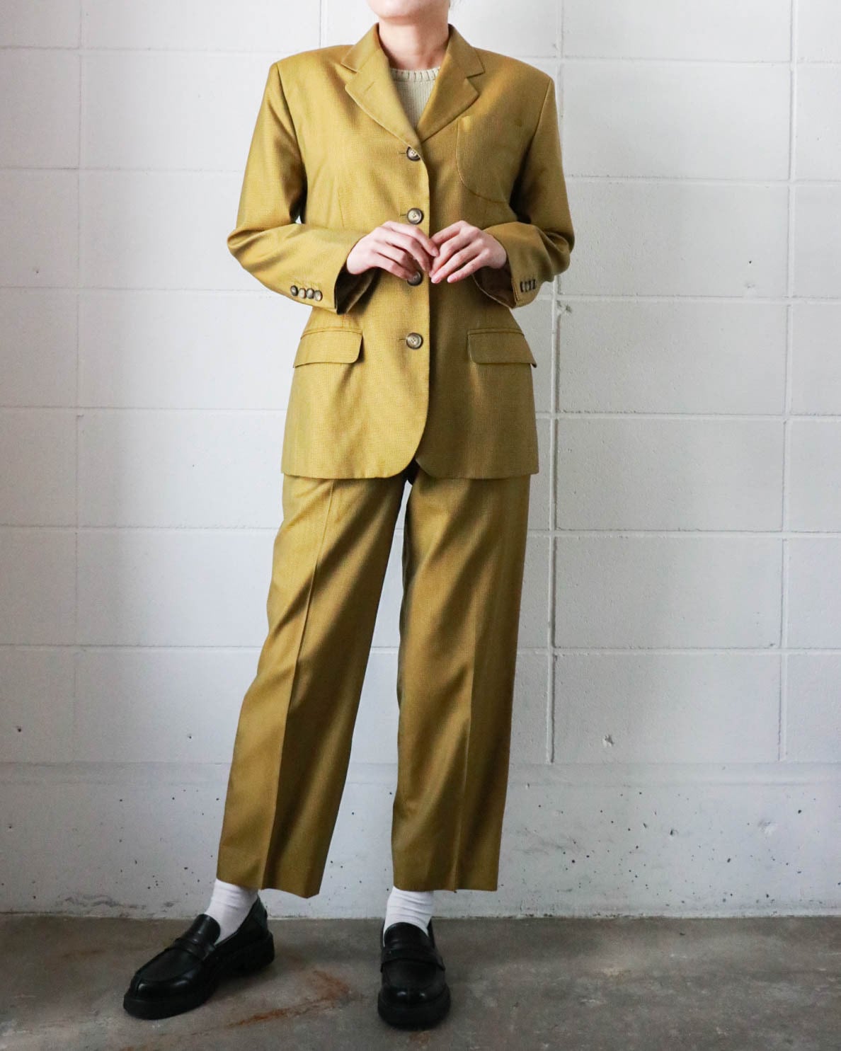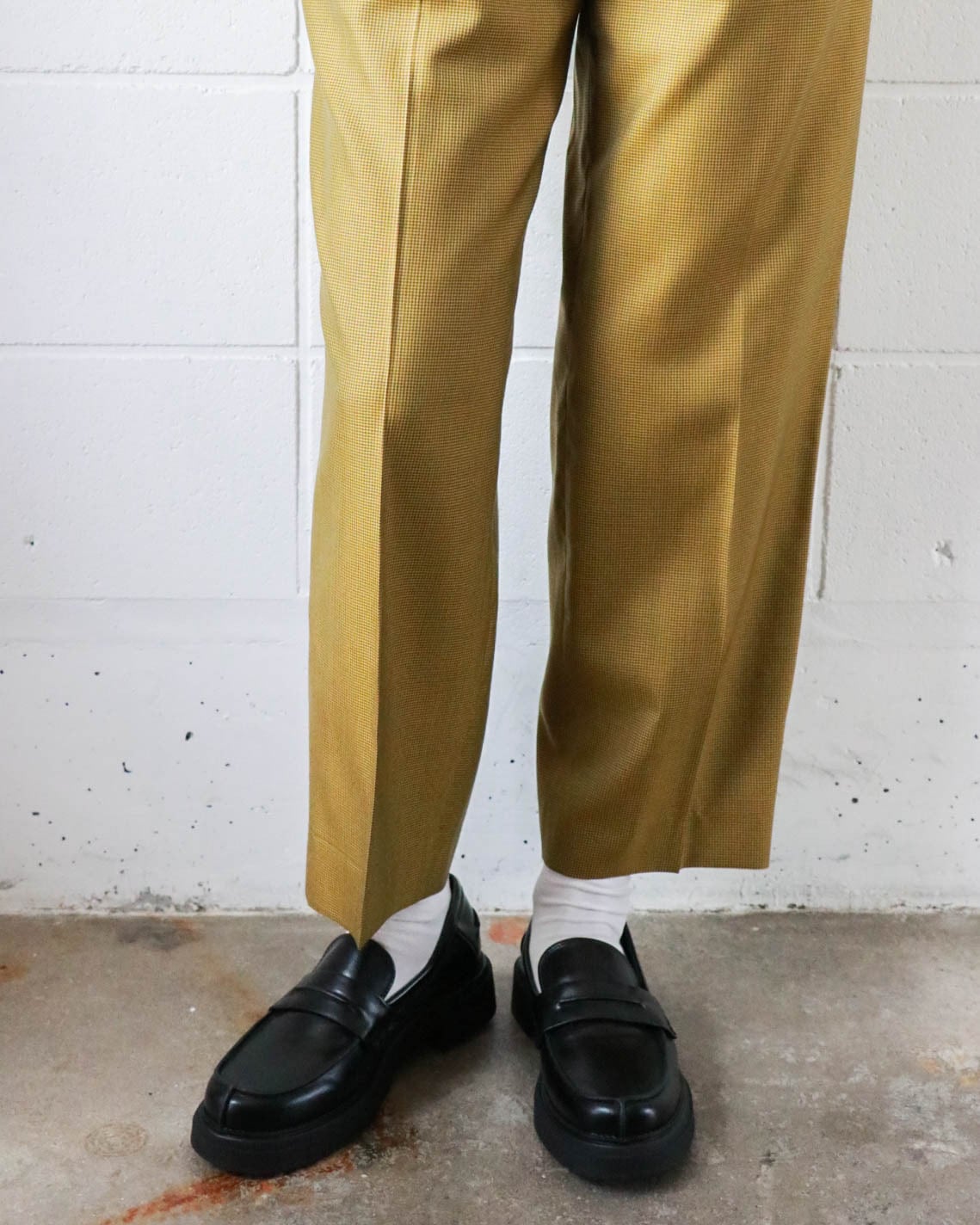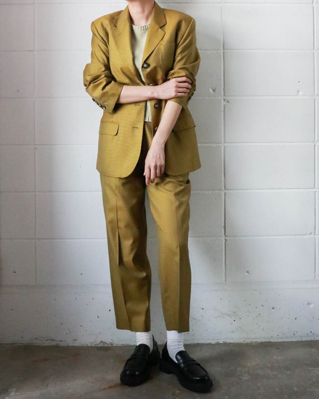 マスタード×ブラウンの組み合わせがクラシックながらもカジュアル寄りで、すっきりとしたハイウエストときれいに落ちるシルエットが魅力的。シンプルながらラインの美しさが際立つ一本です。ウール×シルクミックスの軽量素材がシーンを問わず大活躍します。別売りのジャケットとセットアップで合わせるのもおすすめです。