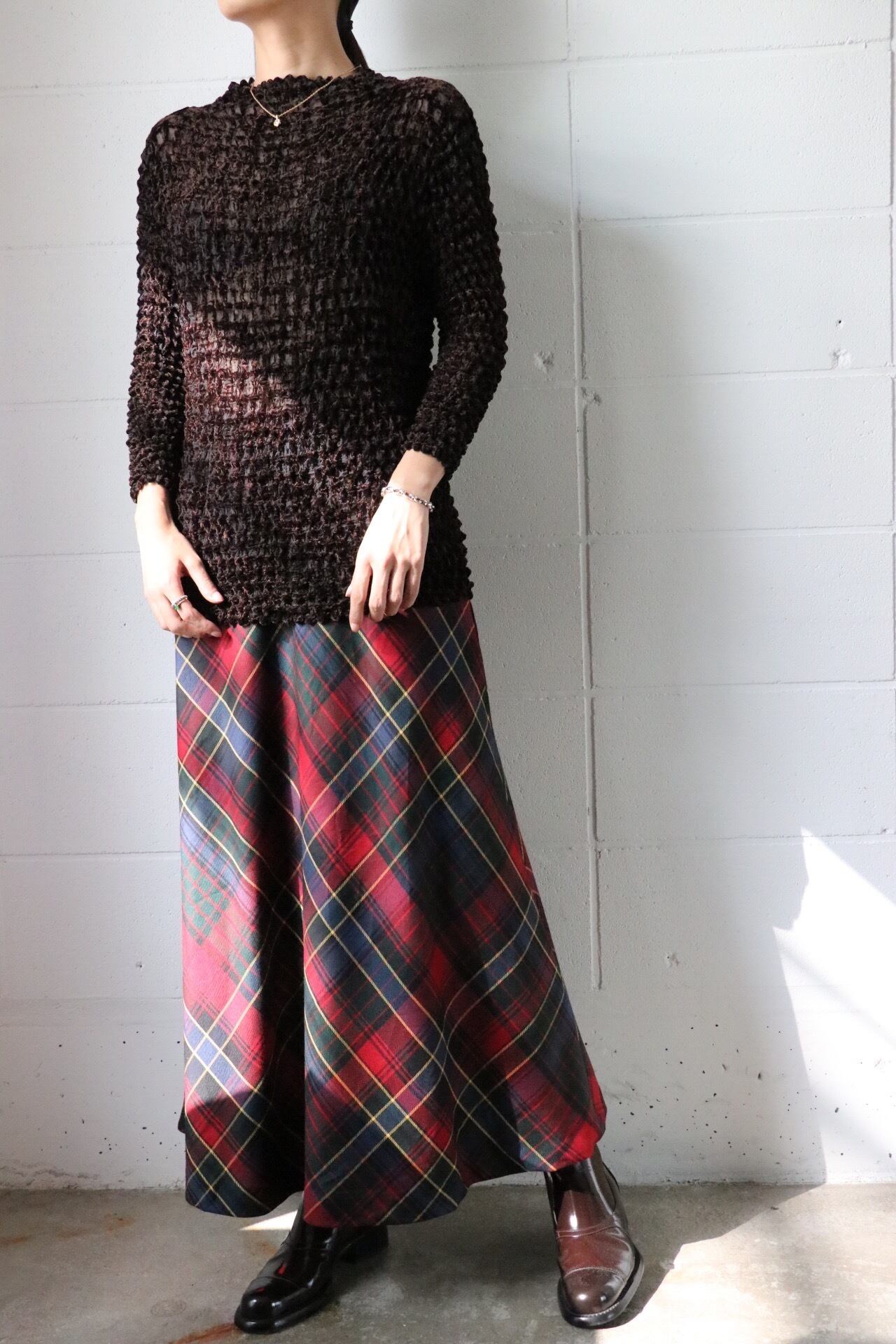 メッシュ素材で艶のある大人トップスはカジュアルなボトムスを組み合わせても締まりのあるスタイルに昇華してくれます◎