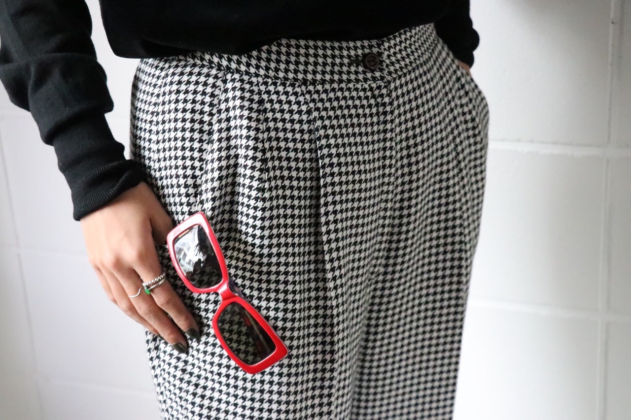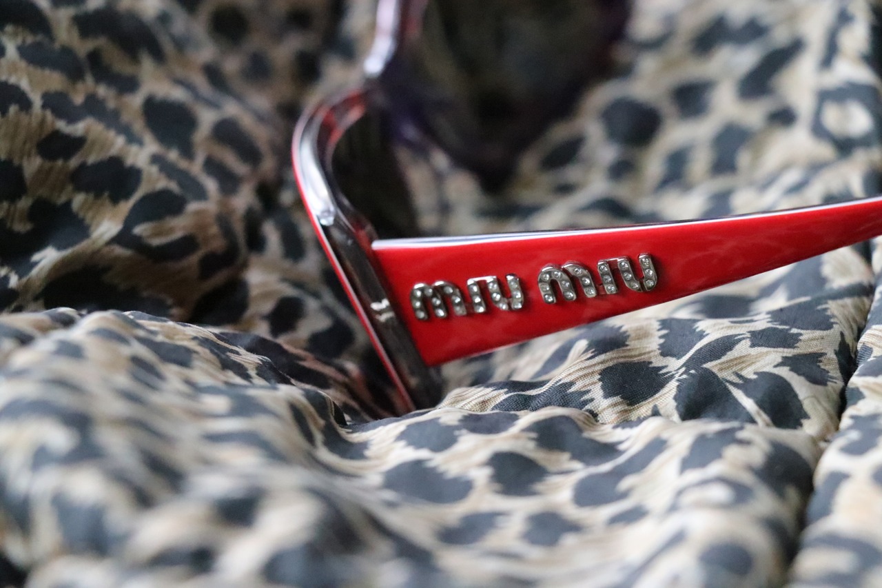 エッジの効いた赤縁にラインストーンでブランドロゴが施され、プレイフルな遊び心を感じます。ちらっと見える裏面の柄模様がさらにお洒落さをプラス。